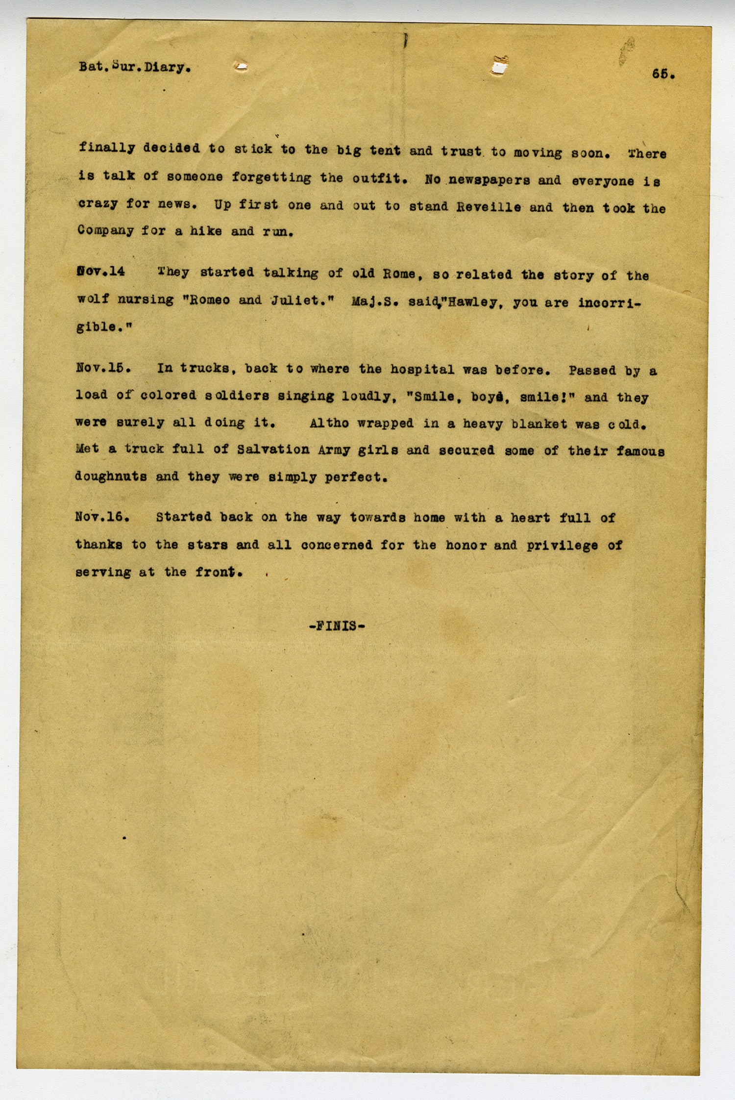 [page 65] Bat. Sur. Diary. finally decided to stick to the big tent and trust to moving soon. There is talk of someone forgetting the outfit. No newspapers and everyone is crazy for news. Up first one and out to stand Reveille and then took the Company for a hike and run. [November] 15. In trucks, back to where the hospital was before. Passed by a load of colored soldiers singing loudly,