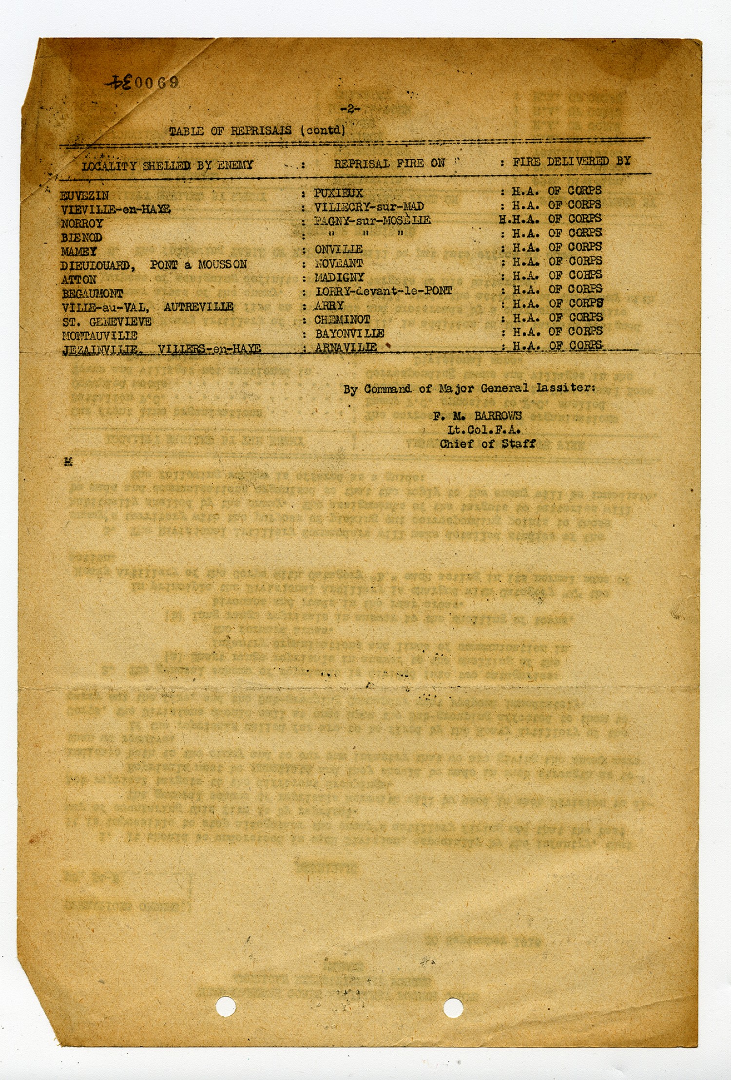 [page 2] Table of Reprisals (contd) [Locality Shelled by Enemy] Euvezin [ Reprisal Fire On] Puxieux [Fire Delivered By] H.A. of Corps [Locality Shelled by Enemy] Vieville-en-Haye [ Reprisal Fire On] Villecry-sur-Mad [Fire Delivered By] H.A. of Corps[Locality Shelled by Enemy] Norroy [ Reprisal Fire On] Pagny-sur-Moselle [Fire Delivered By] H.H.A. of Corps [Locality Shelled by Enemy] Bienod [ Reprisal Fire On] Pagny-sur-Moselle [Fire Delivered By] H.A. of Corps [Locality Shelled by Enemy] Mamey [ Reprisal Fire On] Onville [Fire Delivered By] H.A. of Corps [Locality Shelled by Enemy] Dieulouard, Pont a Mousson [ Reprisal Fire On] Noveant [Fire Delivered By] H.A. of Corps [Locality Shelled by Enemy] Atton [ Reprisal Fire On] Madigny [Fire Delivered By] H.A. of Corps [Locality Shelled by Enemy] Begaumont [ Reprisal Fire On] Lorry-devant-le-Pont [Fire Delivered By] H.A. of Corps [Locality Shelled by Enemy] Ville-au-Val, Autreville [ Reprisal Fire On] Arry [Fire Delivered By] H.A. of Corps [Locality Shelled by Enemy] St. Genevieve [ Reprisal Fire On] Cheminot [Fire Delivered By] H.A. of Corps [Locality Shelled by Enemy] Montauville [ Reprisal Fire On] Bayonville [Fire Delivered By] H.A. of Corps [Locality Shelled by Enemy] Jezainville, Villers-en-Haye [ Reprisal Fire On] Arnaville [Fire Delivered By] H.A. of Corps By Command of Major General Lassiter: F.M. Barrows Lt. Col. F.A. Chief of Staff.