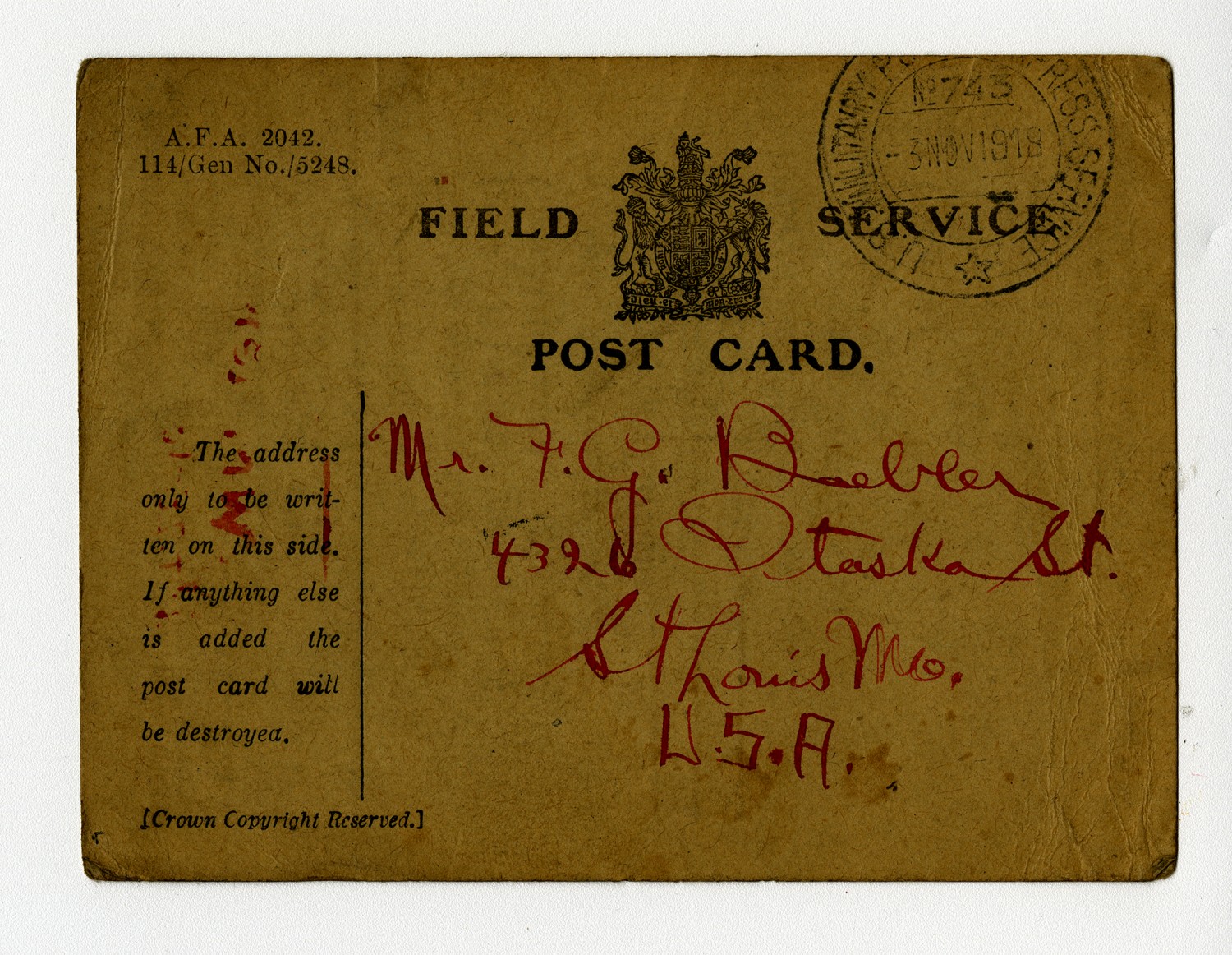 | Source | Meier, E.W. Postcard to F.G. Baebler. 27 October 1918. World War I Collection. A1771. Missouri History Museum, St. Louis, Missouri. |