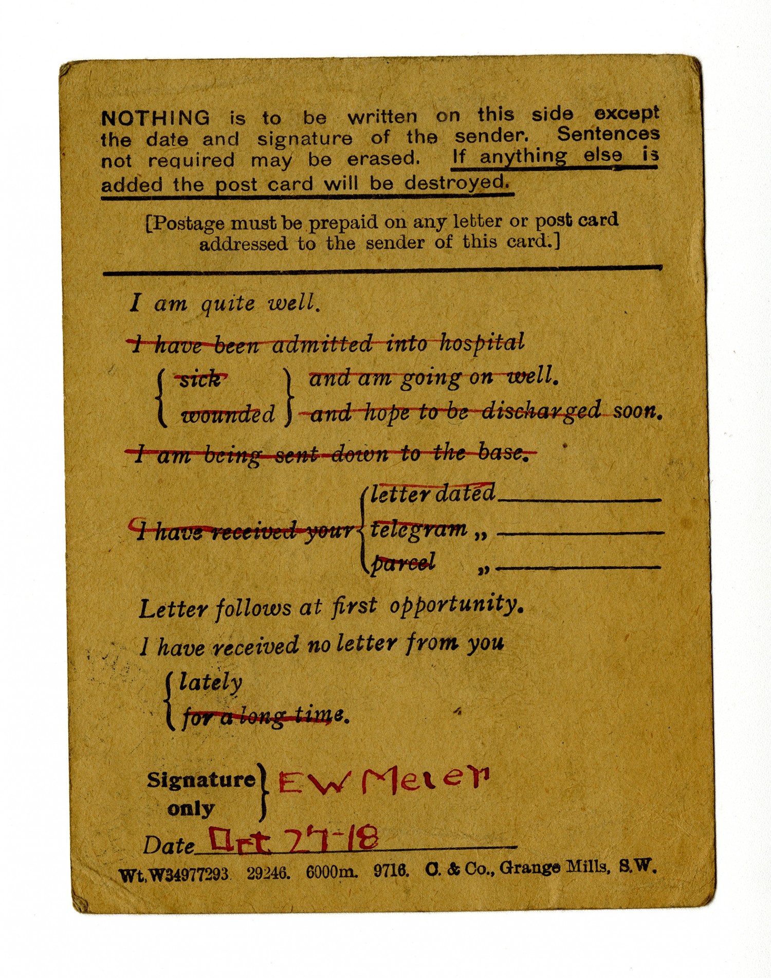 [postcard form]I am quite well Letter follows at first opportunity. I have received no letter from you lately E W Meier [October] 27- [1918]