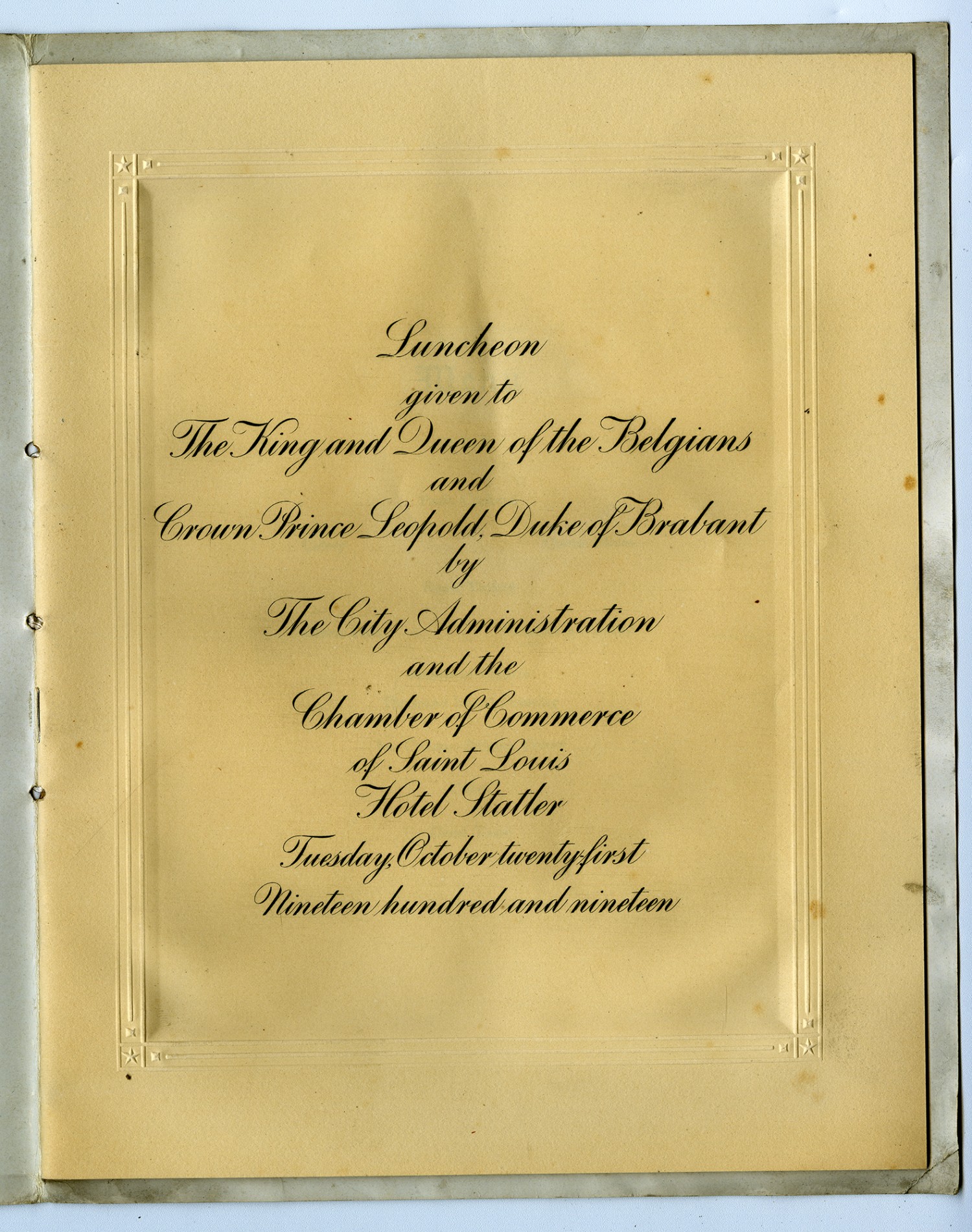 Luncheon given to The King and Queen of the Belgians and Crown Prince Leopold Duke of Brabant by The City Administration and the Chamber of Commerce of Saint Louis Hotel Statler Tuesday, October twenty-first Nineteen hundred and nineteen.