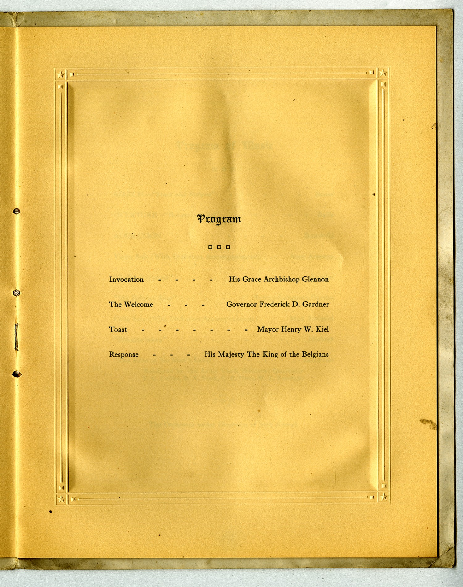 Program Invocation His Grace Archbishop Glennon The Welcome Governor Frederick D. Gardner Toast Mayor Henry W. Kiel Response His Majesty The King of the Belgians
