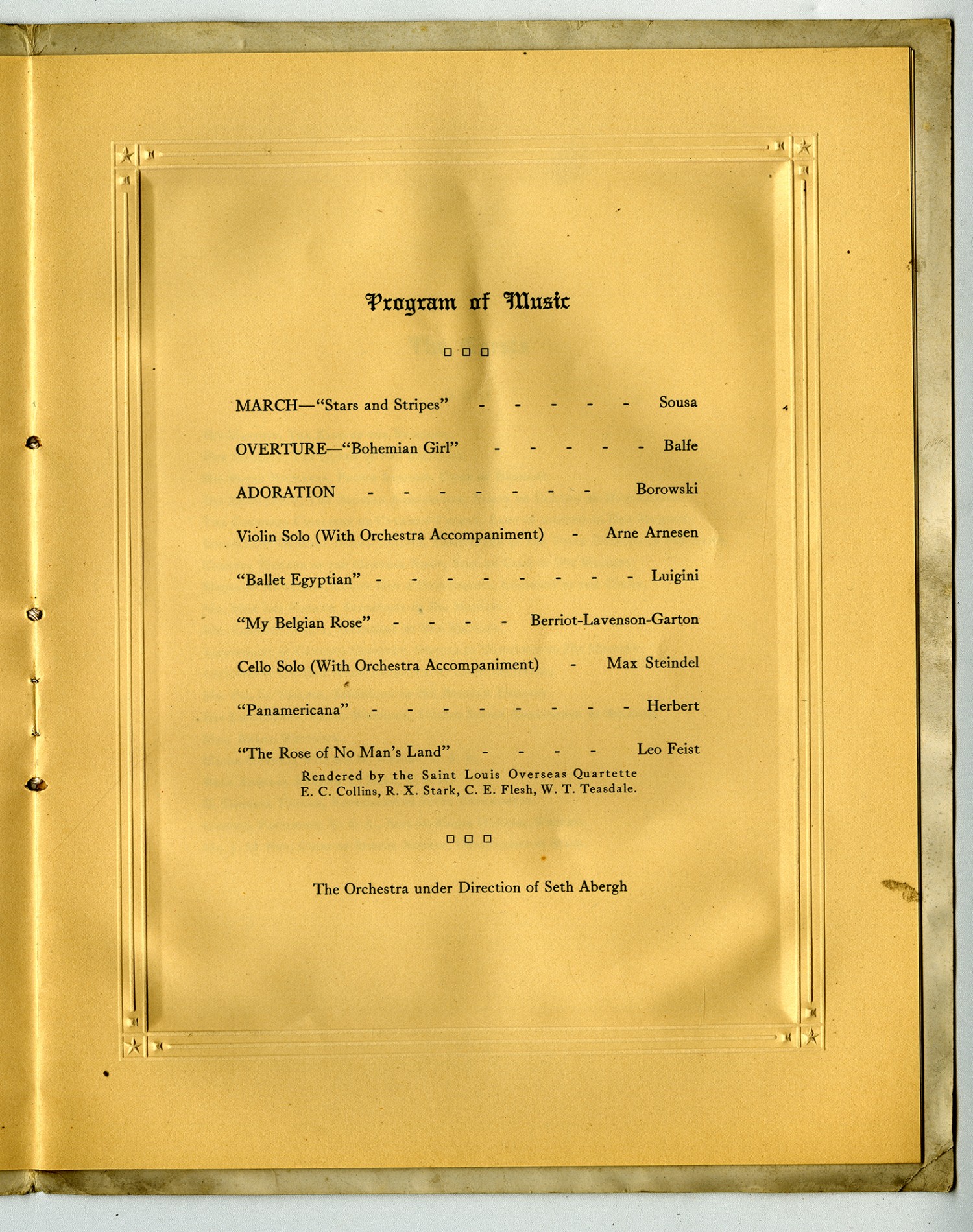 | Source | Unknown. Program of the luncheon given to the King and Queen of the Belgium. 21 October 1919. World War I Collection. A1771. Missouri History Museum, St. Louis, Missouri. |