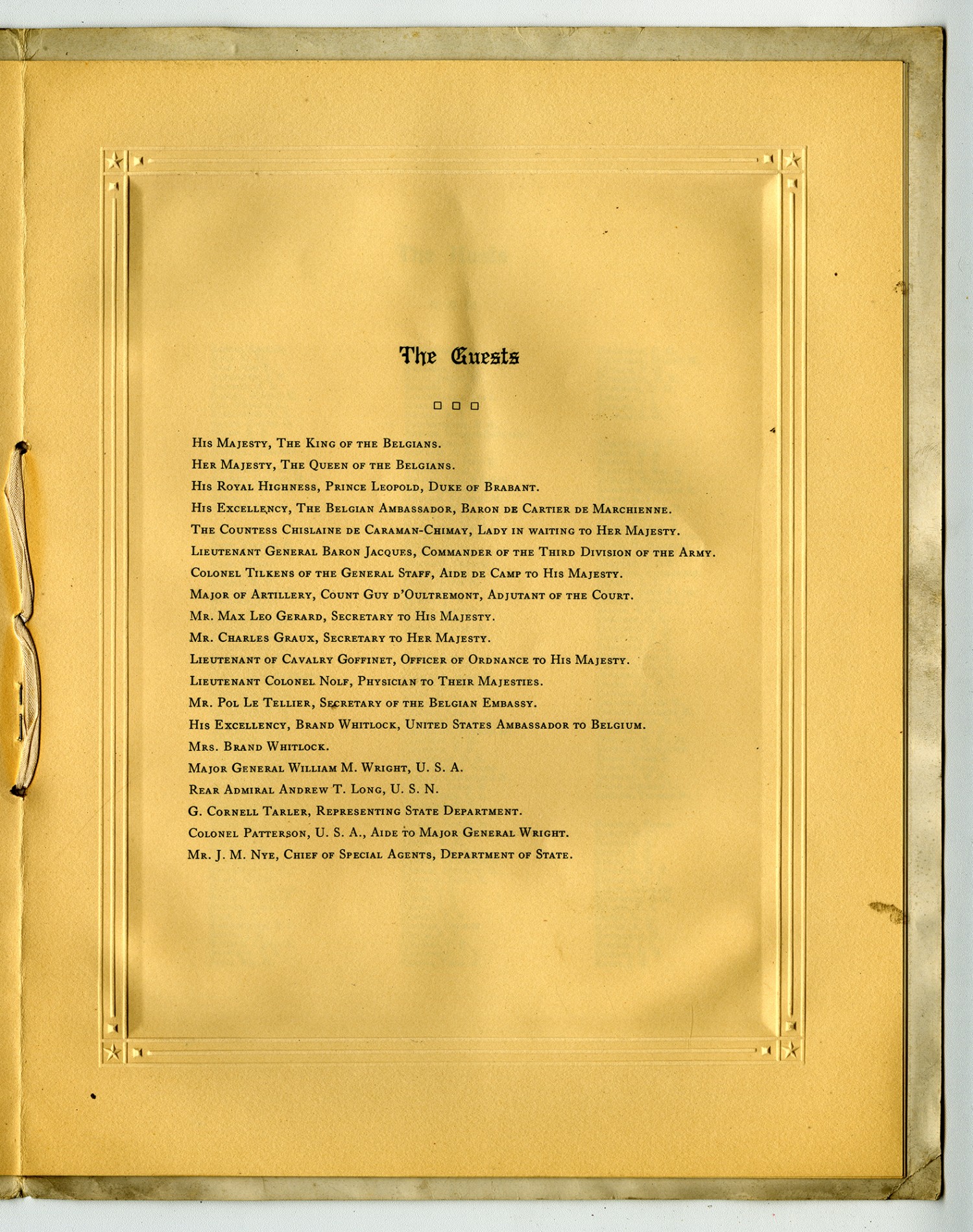 The Guests His Majesty, The King of the Belgians. Her Majesty, The Queen of the Belgians. His Royal Highness, Prince Leopold, Duke of Brabant. His Excellency, The Belgian Ambassador, Baron De Cartier De Marchienne. The Countess Chislaine De Caraman-Chimay, Lady in waiting to Her Majesty. Lieutenant General Baron Jacques, Commander of the Third Division of the Army. Colonel Tilkens of the General Staff, Aide de Camp to His Majesty. Major of Artillery, County Guy d
