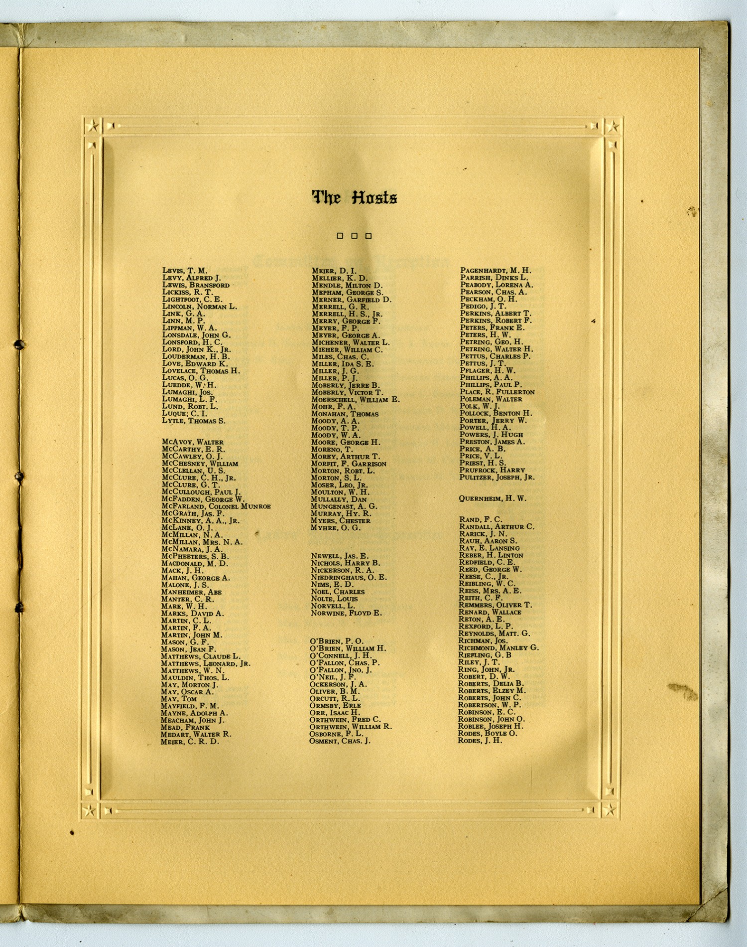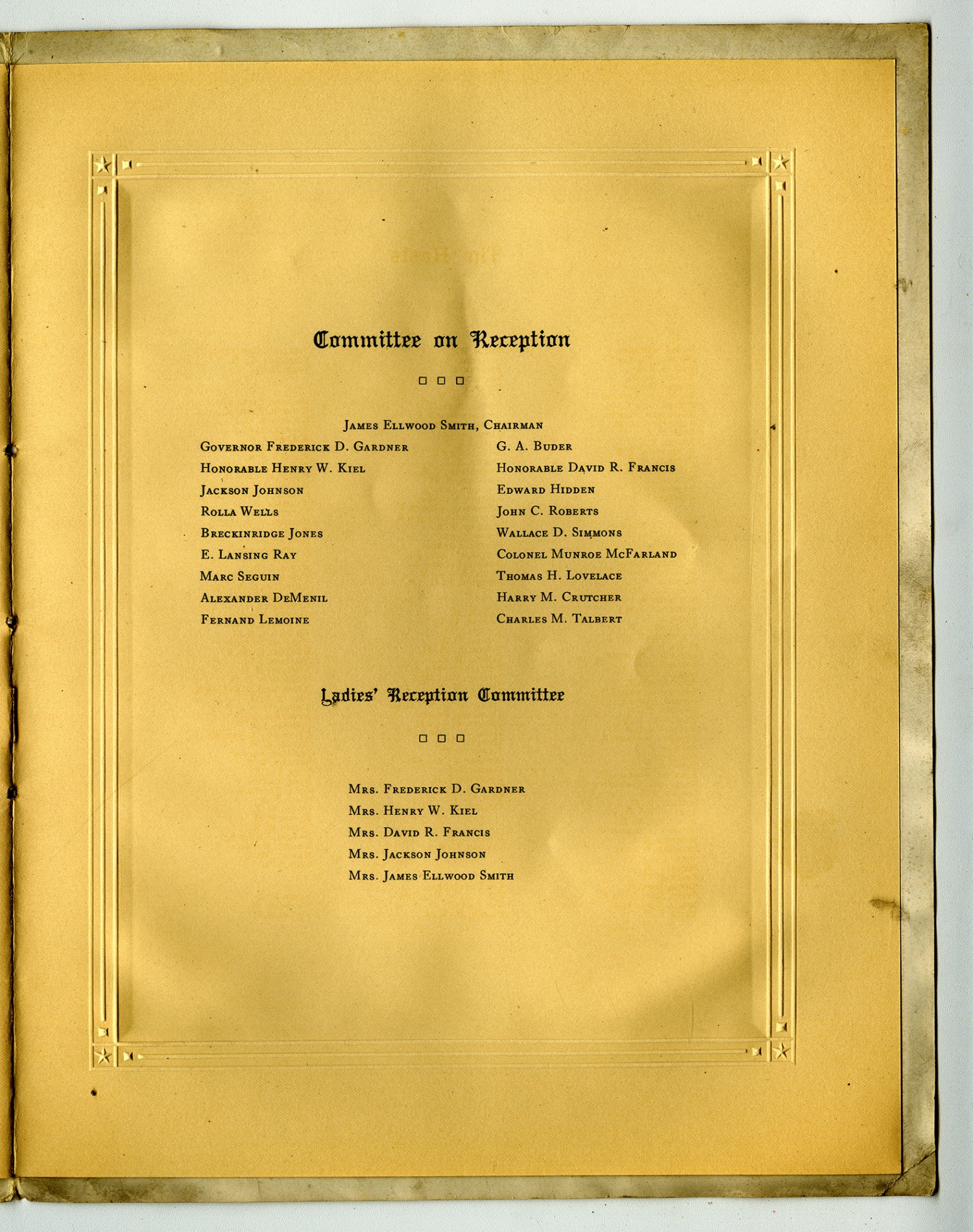 Committee on Reception James Ellwood Smith, Chairman Governor Frederick D. Garner G.A. Buder Honorable Henry W. Kiel Honorable David R. Francis Jackson Johnson Edward Hidden Rolla Wells John C. Roberts Breckinridge Jones Wallace D. Simmons E. Lansing Ray Colonel Munroe McFarland Marc Seguin Thomas H. Lovelace Alexander DeMenil Harry M. Crutcher Fernand Lemoine Charles M. Talbert Ladies