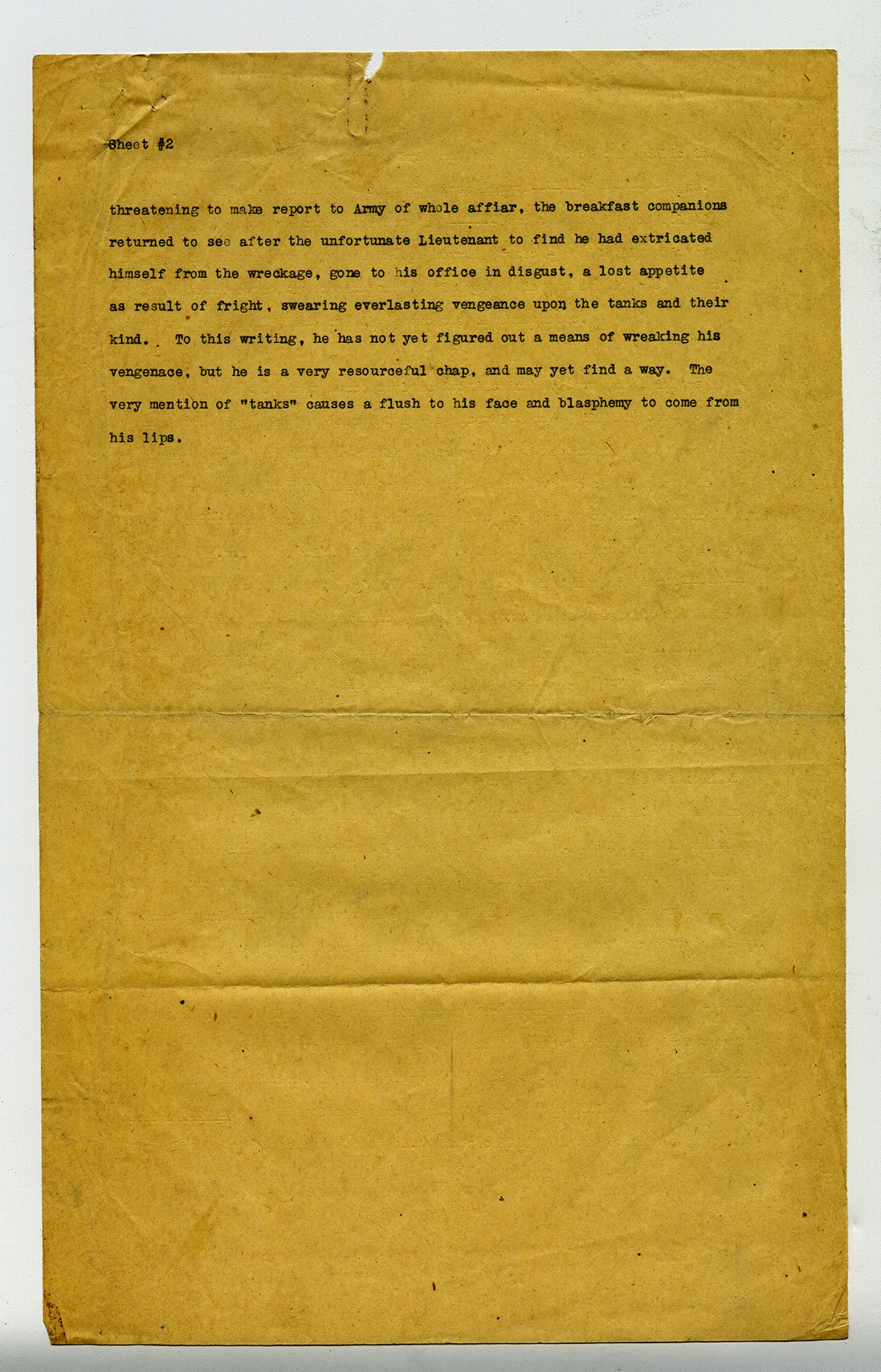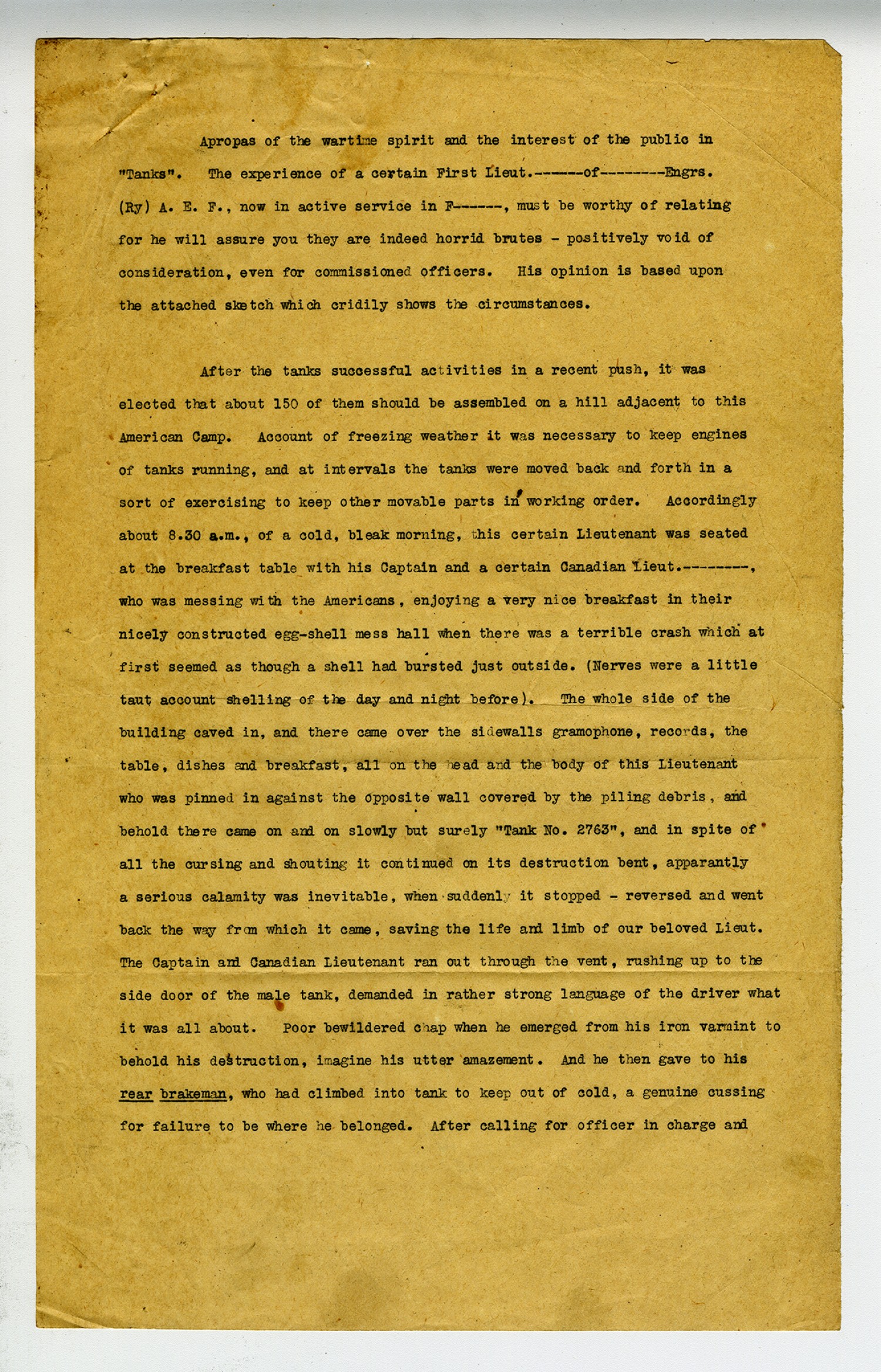 Sheet #2 threatening to make report to Army of whole affair, the breakfast companions returned to see after the unfortunate Lieutenant to find he had extricated himself from the wreckage, gone to his office in disgust, a lost appetite as result of fright, swearing everlasting vengeance upon the tanks and their kind. To this writing, he has not yet figured out a means of wreaking his vengenace, but he is a very resourceful chap, and may yet find a way. The very mention of