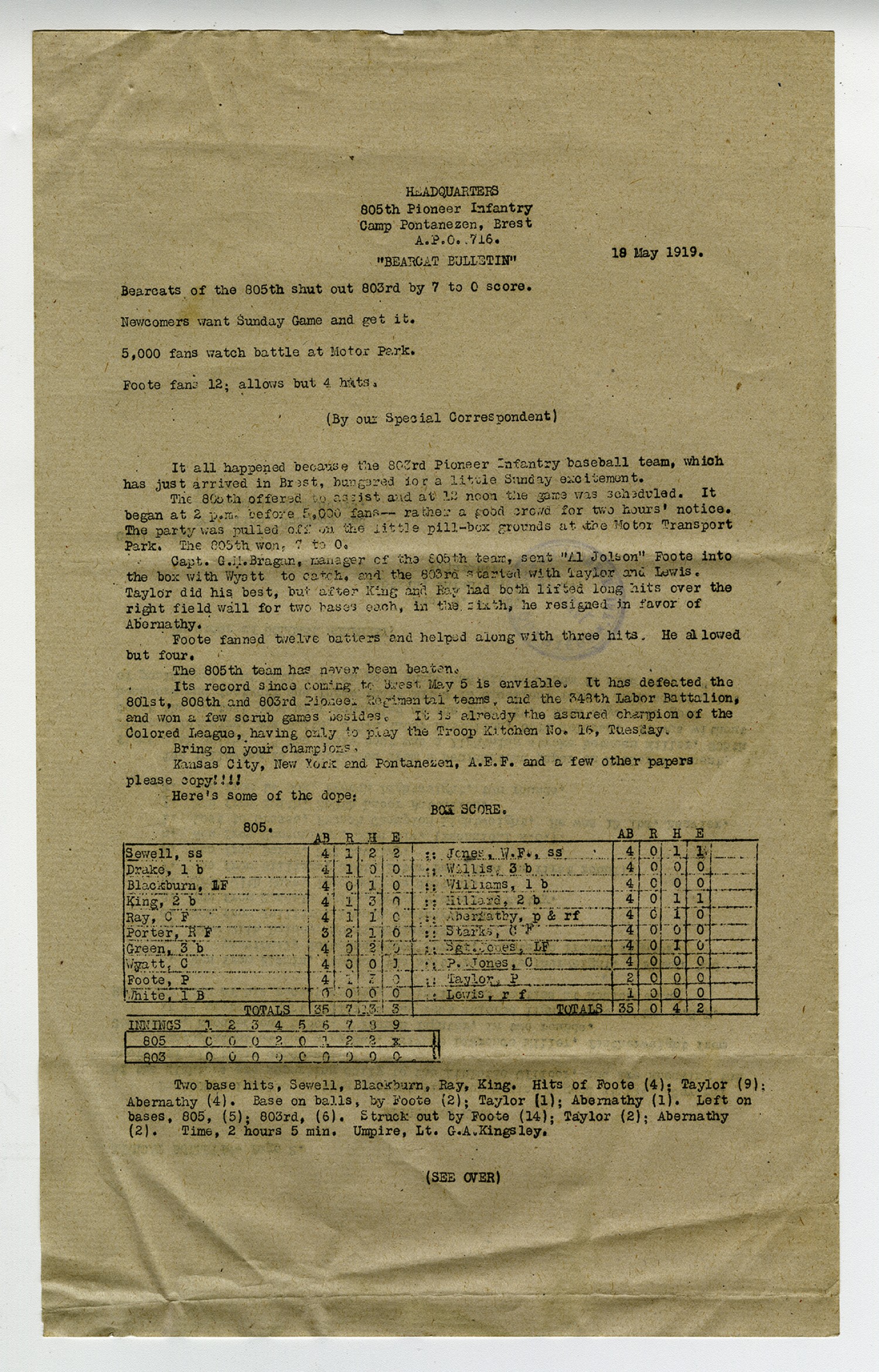 | Description | Baseball report of a game between the 805th and 803rd Pioneer Infantry Regiments. Includes roster and score card from the game. |