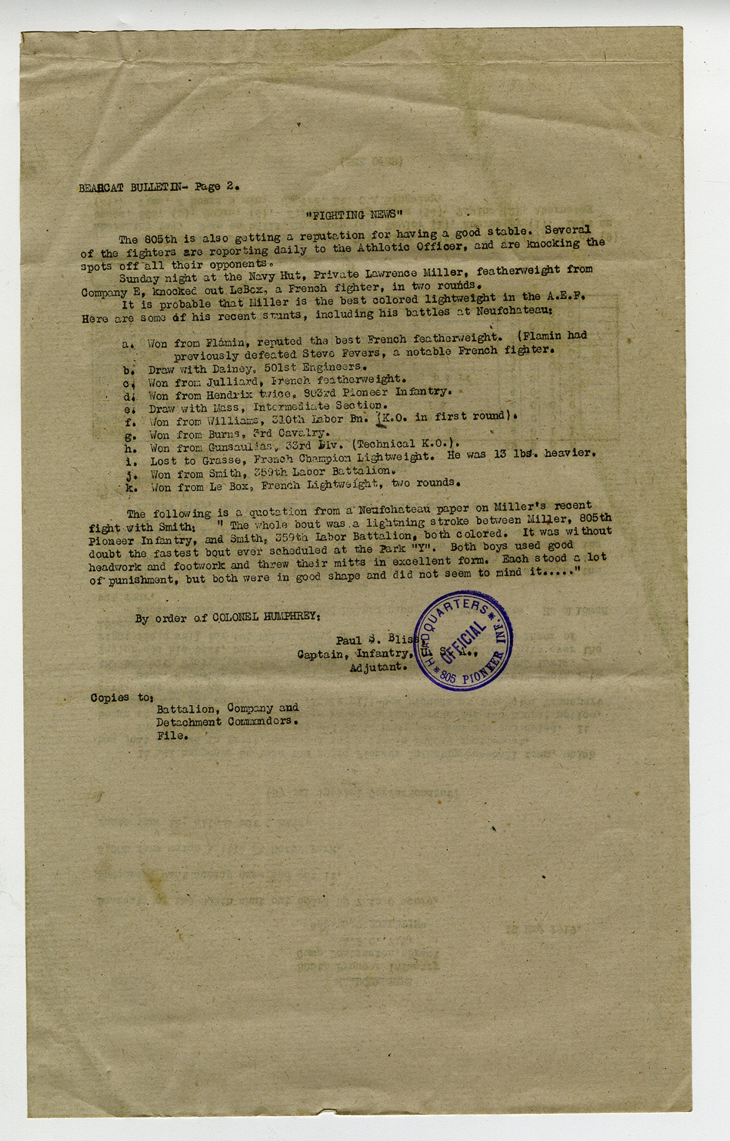 Headquarters 805th Pioneer Infantry Camp Pontanezen, Brest A.P.O. 716.