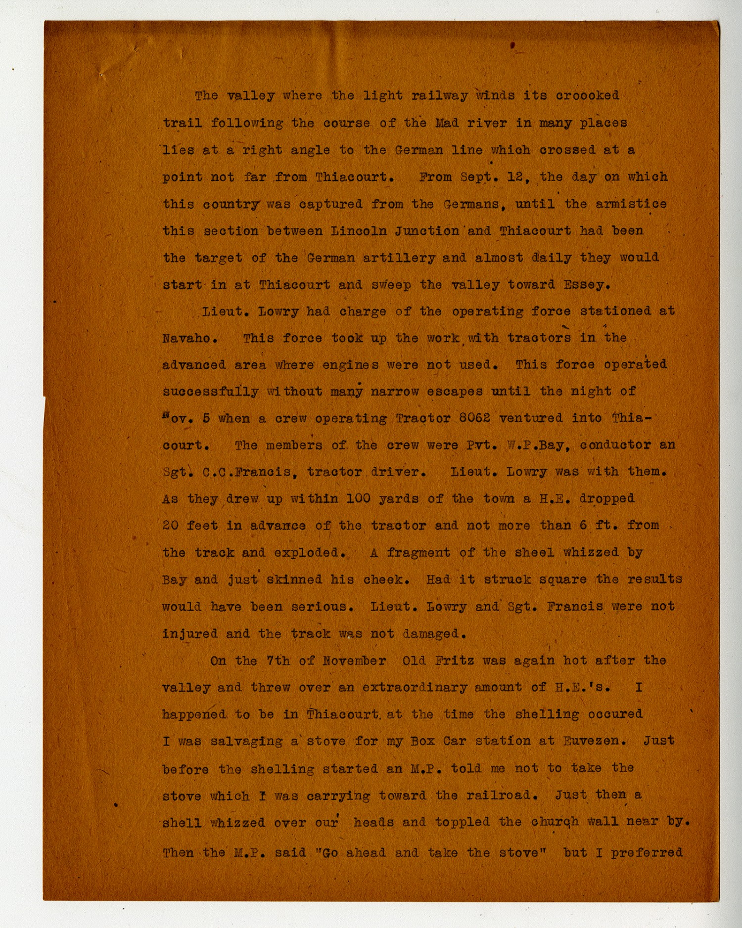 The valley where the light railway winds its crooked trail following the course of the Mad river in many places lies at a right angle to the German line which crossed at a point not far from Thiacourt. From [September] 12, the day on which this country was captured from the Germans, until the armistice this section between Lincoln Junction and Thiacourt had been the target of the German artillery and almost daily they would start in at Thiacourt and sweep the valley toward Essey. Lieut. Lowry had charge of the operating force stationed at Navaho. This force took up the work with tractors in the advanced area where engines were not used. This force operated successfully without many narrow escapes until the night of [November] 5 when a crew operating Tractor 8062 ventured into Thiacourt. The members of the crew were Pvt. W.P. Bay, conductor an Sgt. C.C. Francis, tractor driver. Lieut. Lowry was with them. As they drew up within 100 yards of the town a H.E. dropped 20 feet in advance of the tractor and not more than 6 ft. from the track and exploded. A fragment of the shell whizzed by Bay and just skinned his cheek. Had it struck square the results would have been serious. Lieut. Lowry and Sgt. Francis were not injured and the track was not damaged. On the 7th of November Old Fritz was again hot after the valley and threw over an extraordinary amount of H.E.