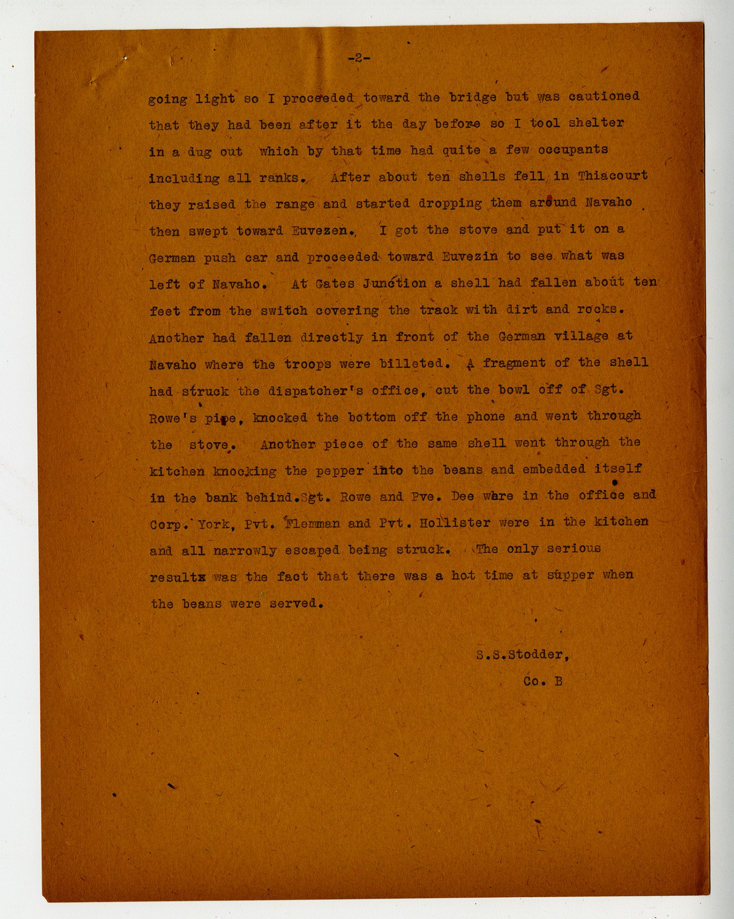 [page 2] going light so I proceeded toward the bridge but was cautioned that they had been after it the day before so I took shelter in a dug out which by that time had quite a few occupants including all ranks. After about ten shells fell in Thiacourt they raised the range and started dropping them around Navaho then swept toward Euvezen. I got the stove and put it on a German push car and proceeded toward Euvezin to see what was left of Navaho. At Gates Junction a shell had fallen about ten feet from the switch covering the track with dirt and rocks. Another had fallen directly in front of the German village at Navaho where the troops were billeted. A fragment of the shell had struck the dispatcher