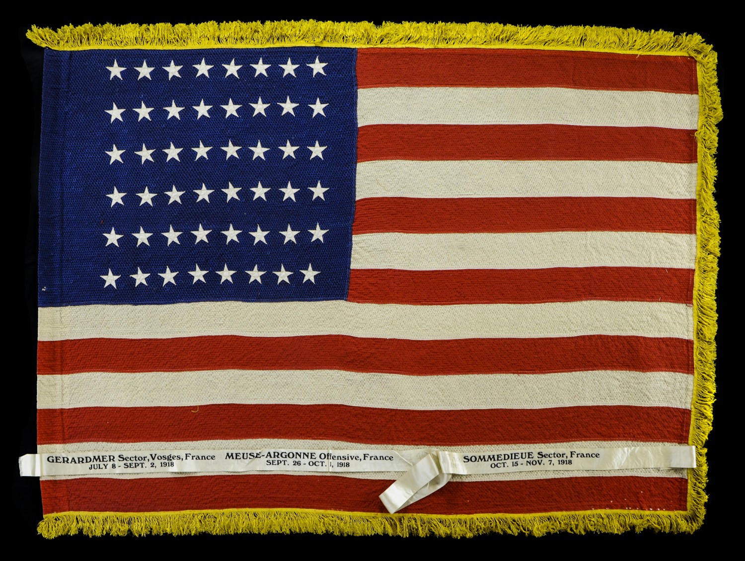 United States National colors with 48 stars for the 138th Infantry. The county flags and regimental banner collection contains thirty-three regimental flags from World War I.