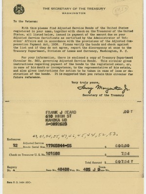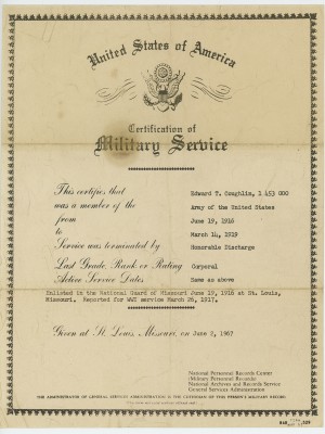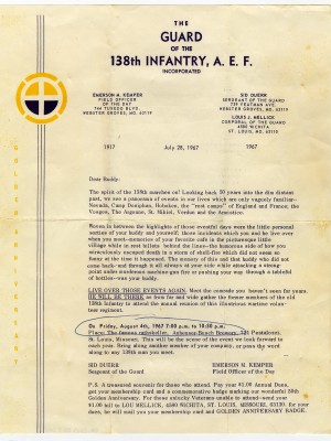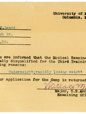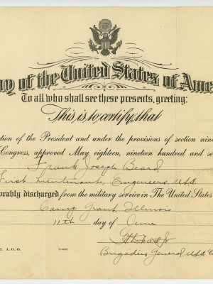 This collection from the Missouri State Museum, located in the State Capitol at Jefferson City, Missouri, is comprised of letters documents and photographs primarily related to the military service of Frank J. Beard, Company G of the 138th Machine Gun regiment, and lists of soldiers who served from certain counties in Missouri. Various other WWI related items and photographs are also present in the collection.