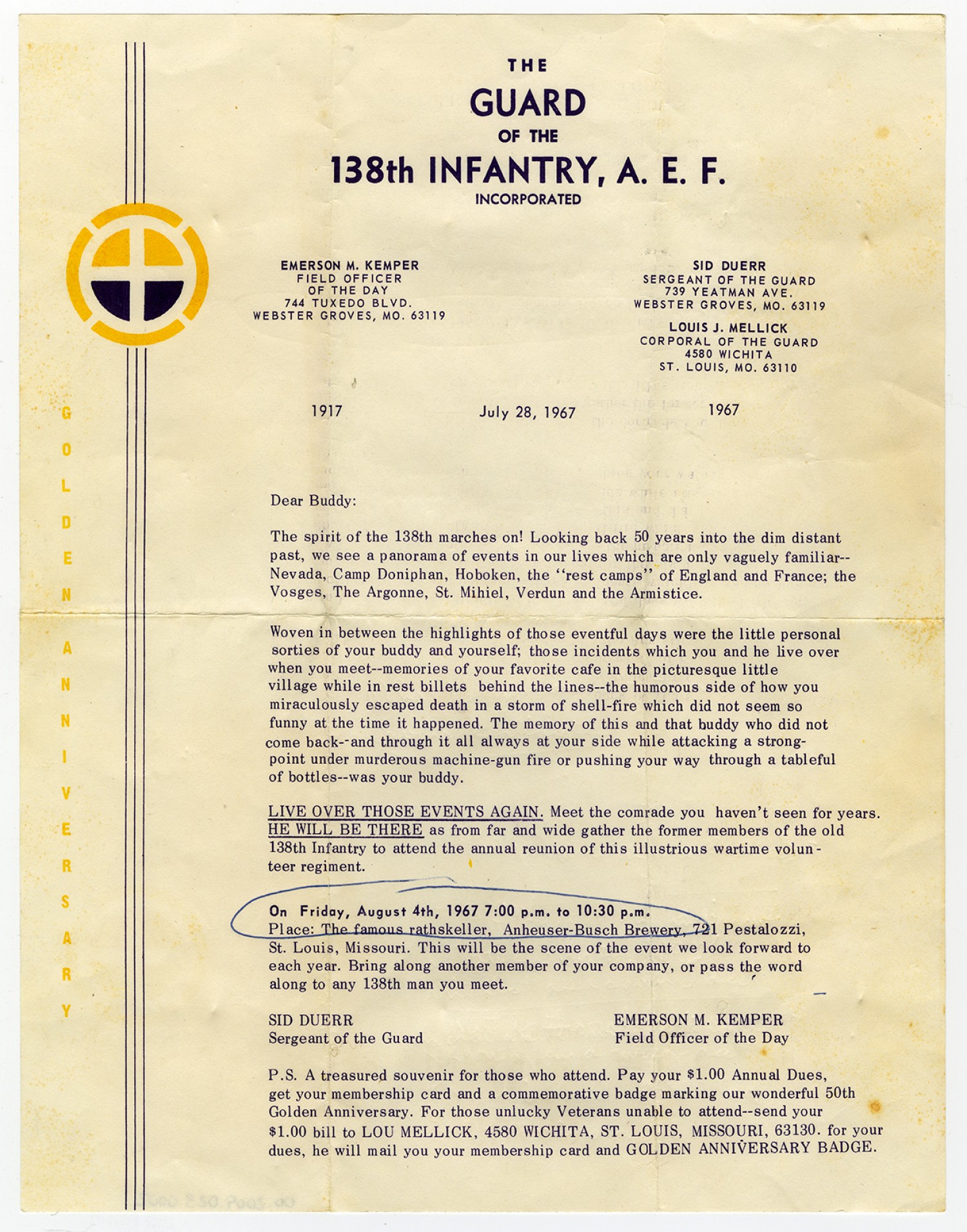 138th Infantry Reunion Information Letter - July 28, 1967