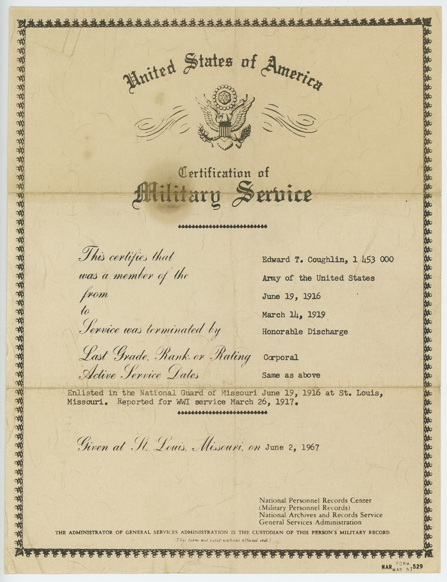 | Title | Certification of Military Service for Edward T. Caughlin - June 2, 1967 |