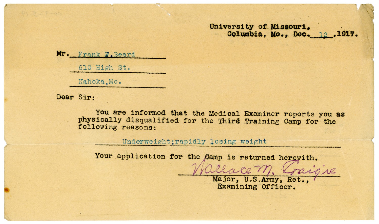 | Description | A notice informing Frank J. Beard he has been physically disqualified by the Medical Examiner due to being underweight and rapidly losing weight. December 18, 1917. |