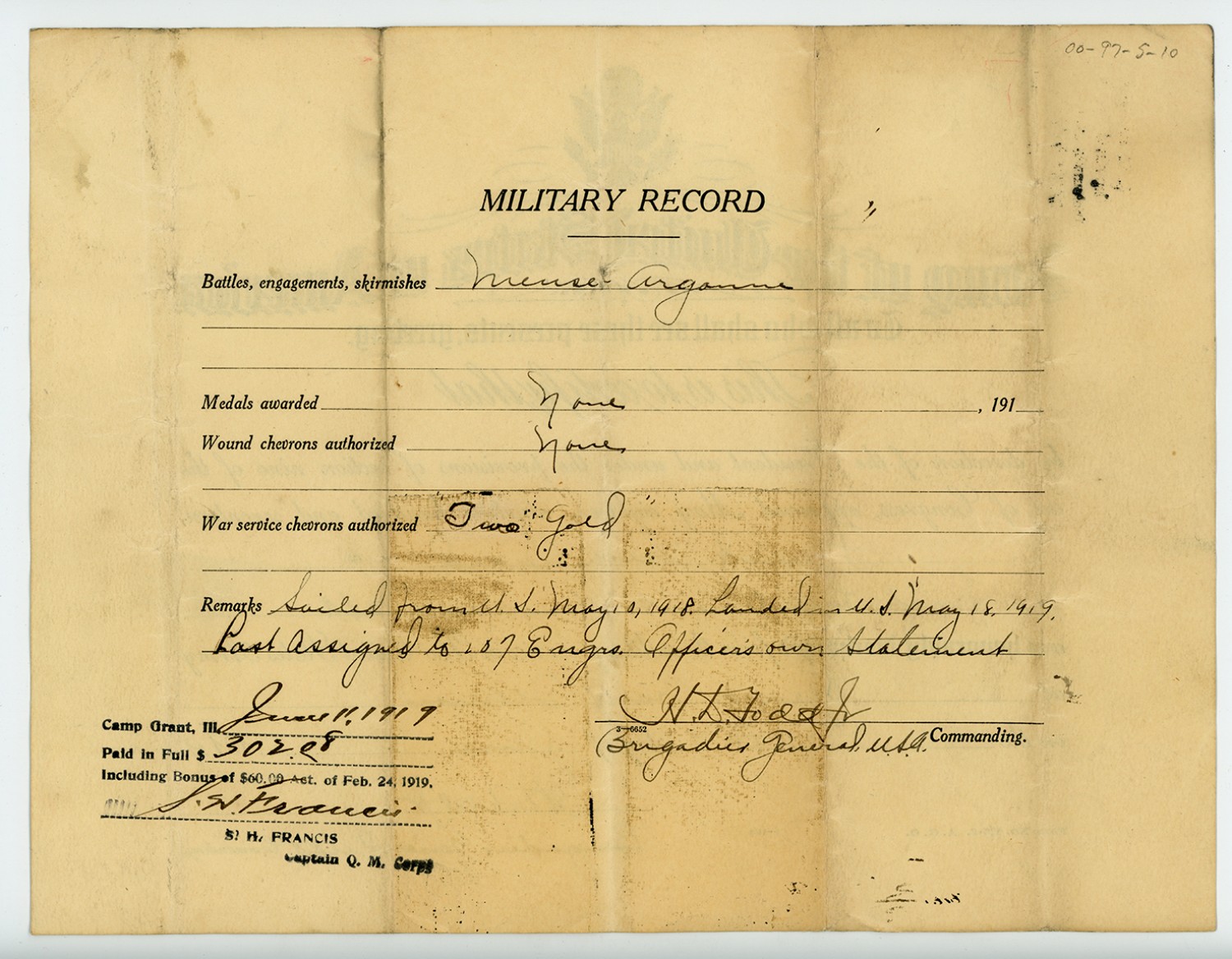 | Description | Honorable discharge for Frank Joseph Beard, with his service record on the document's back, June 11, 1919. |