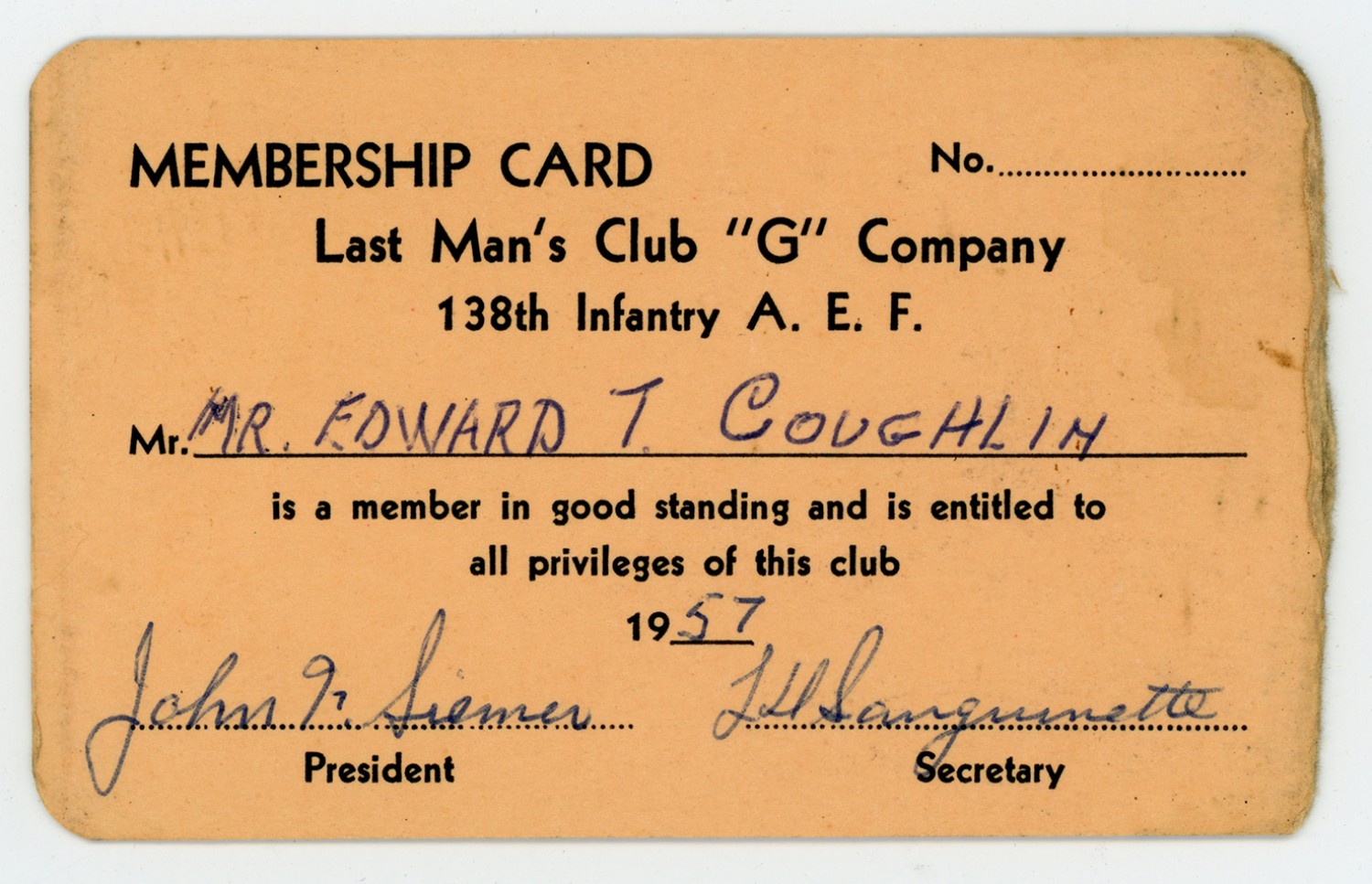 | Description | A membership card belonging to Edward T. Coughlin listing him as a member of the Last Man's Company G of the 138th Infantry, 1957. |