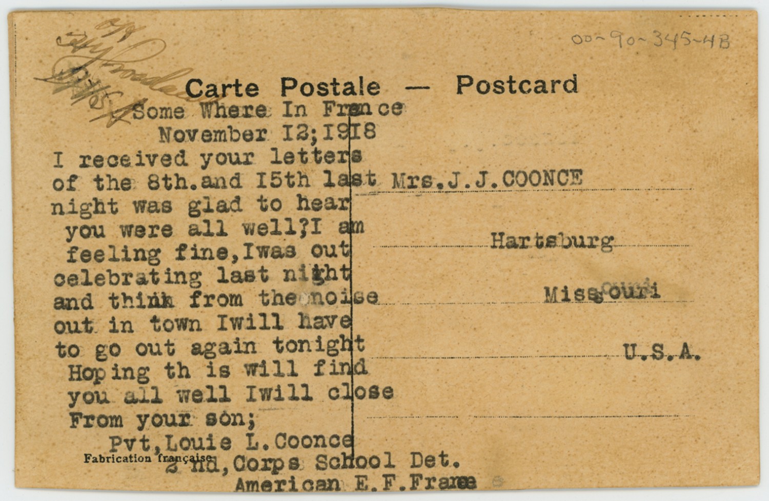 Postcard to Mrs. J.J. Coonce from Louie L. Coonce - November 12, 1918