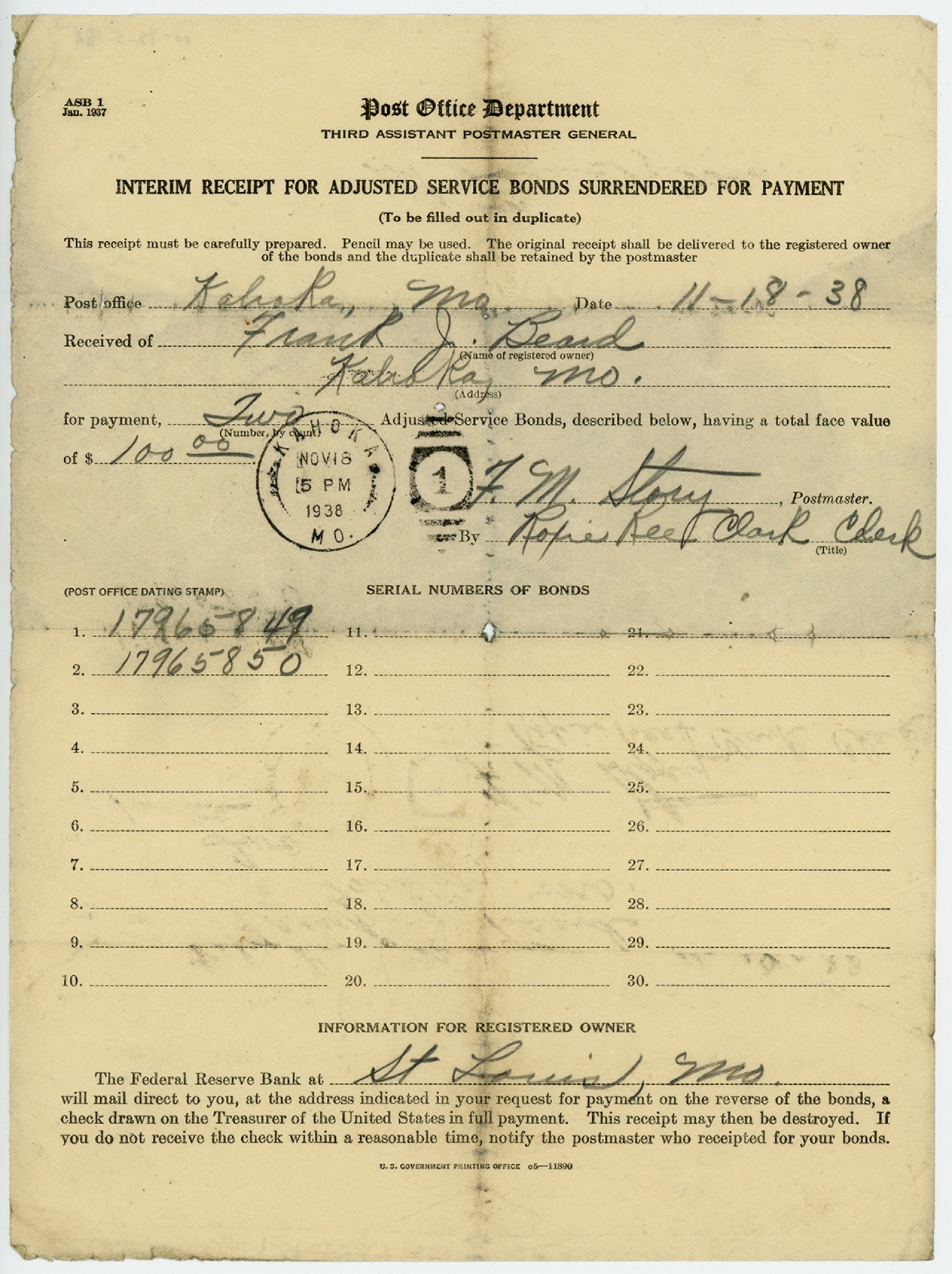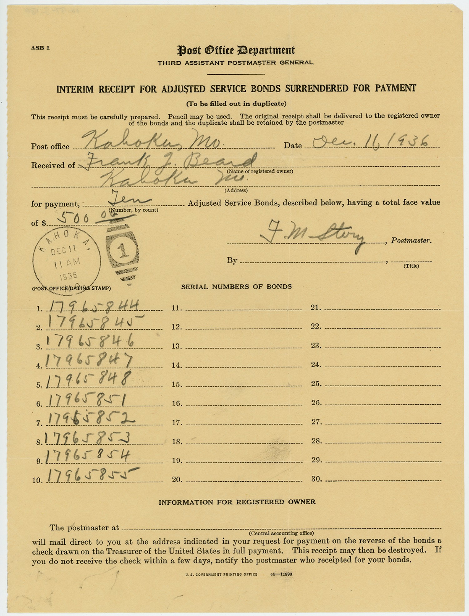 | Description | <p>A receipt for the adjusted service bonds surrendered for payment from the post office of Kahoka, Missouri, December 11, 1936.</p> |
