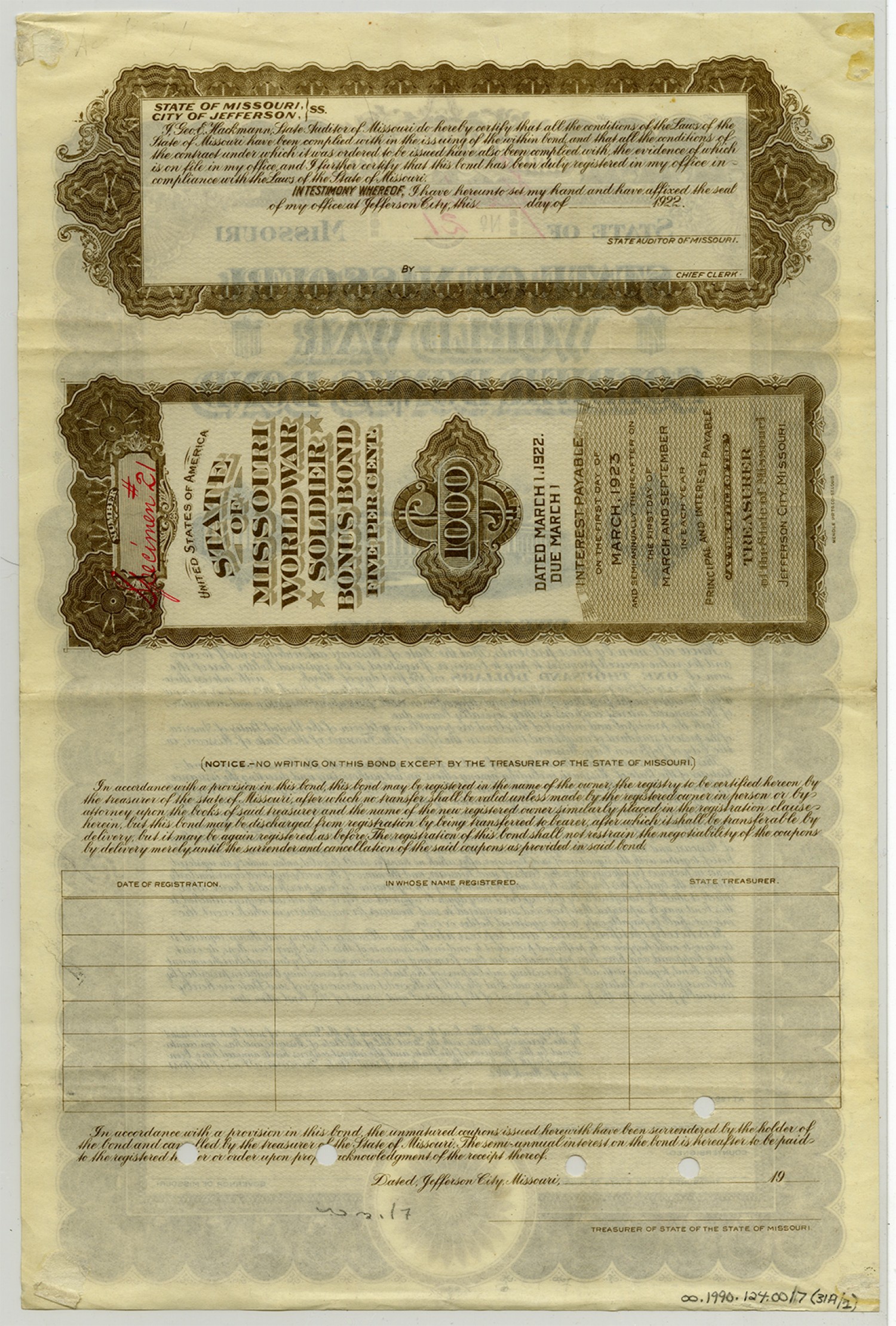 | Description | A five percent Soldier Bonus Bond for $1000.00, ca. 1922. |