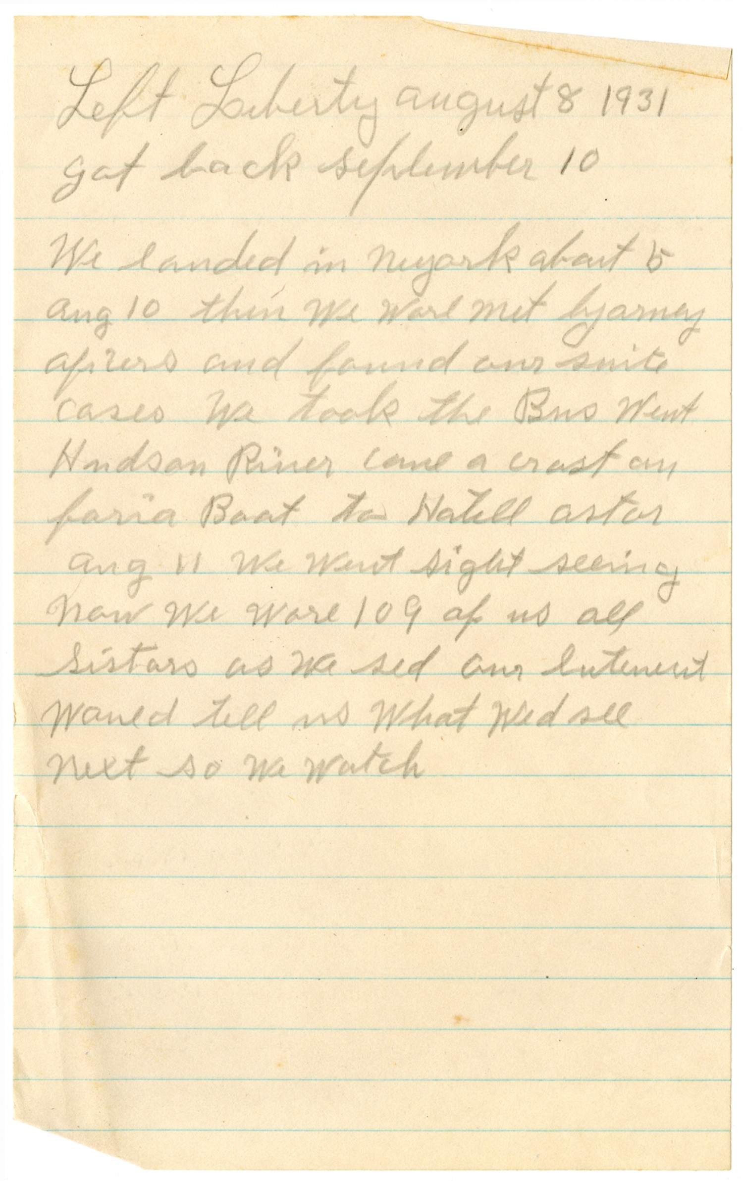 Left Liberty August 8 1931 got back September 10 We landed in New York about 5 [August] 10 then We ware met by armey oficers and found our suite cases We took the Bus Went Hudson River came a crost on faria Boat to Hotell Astar [August] 11 We went sight seeing now we ware 109 of us all Sistars as We sed our lutenent would tell us What Wed see next so we watch
