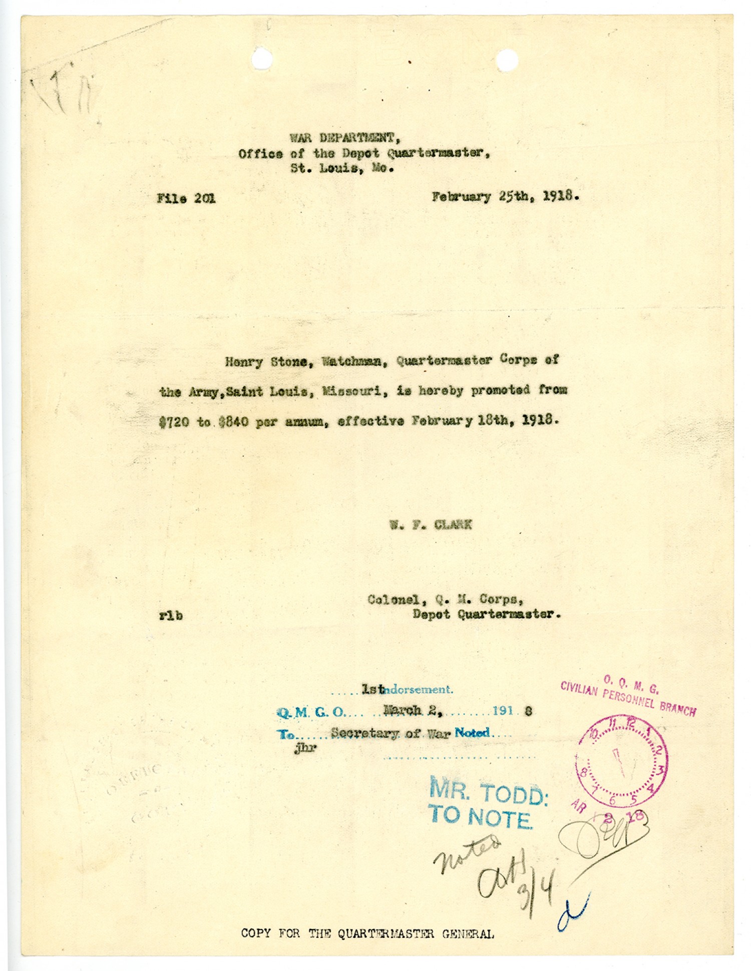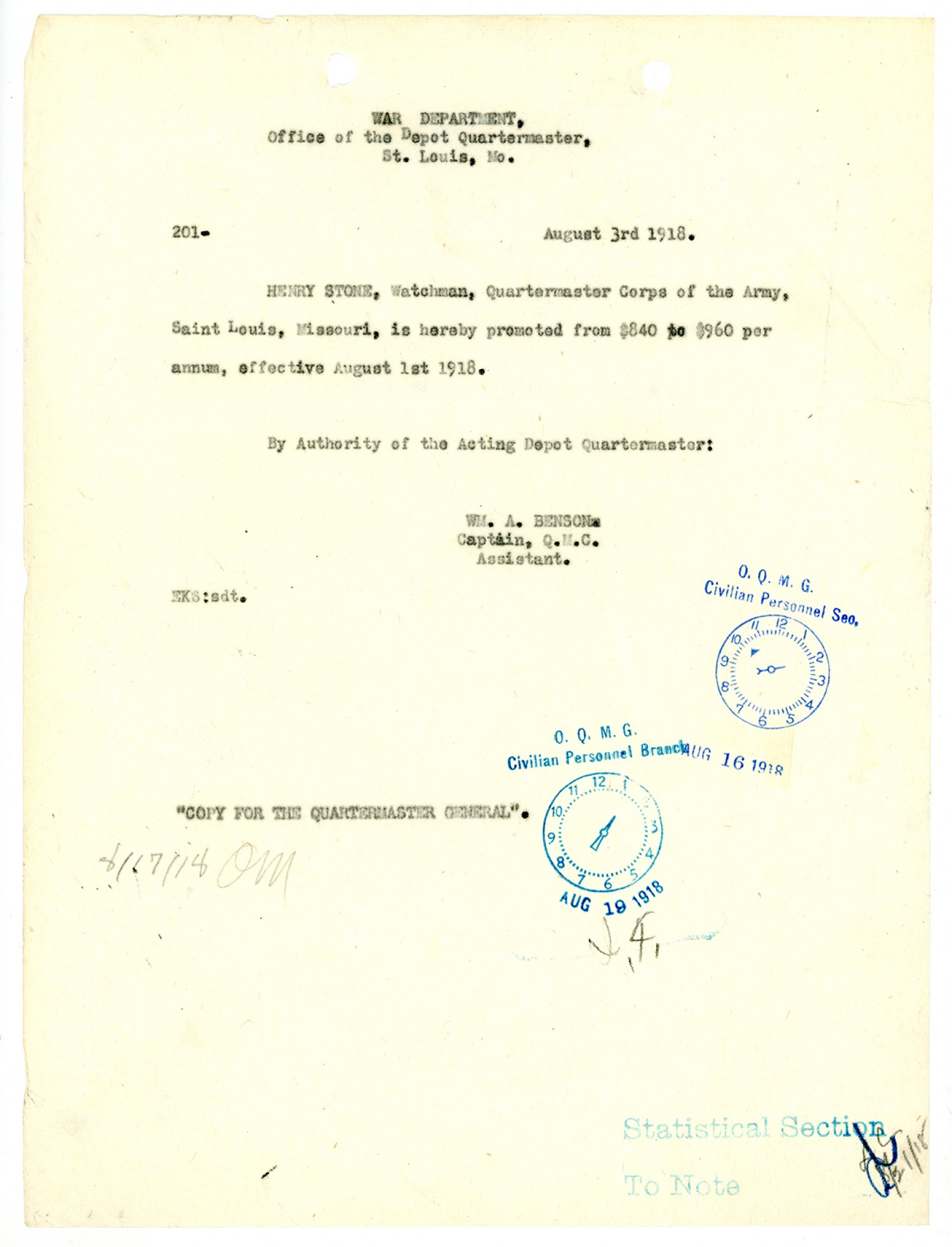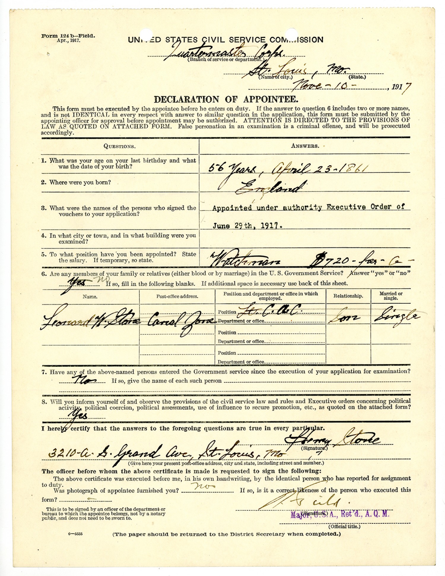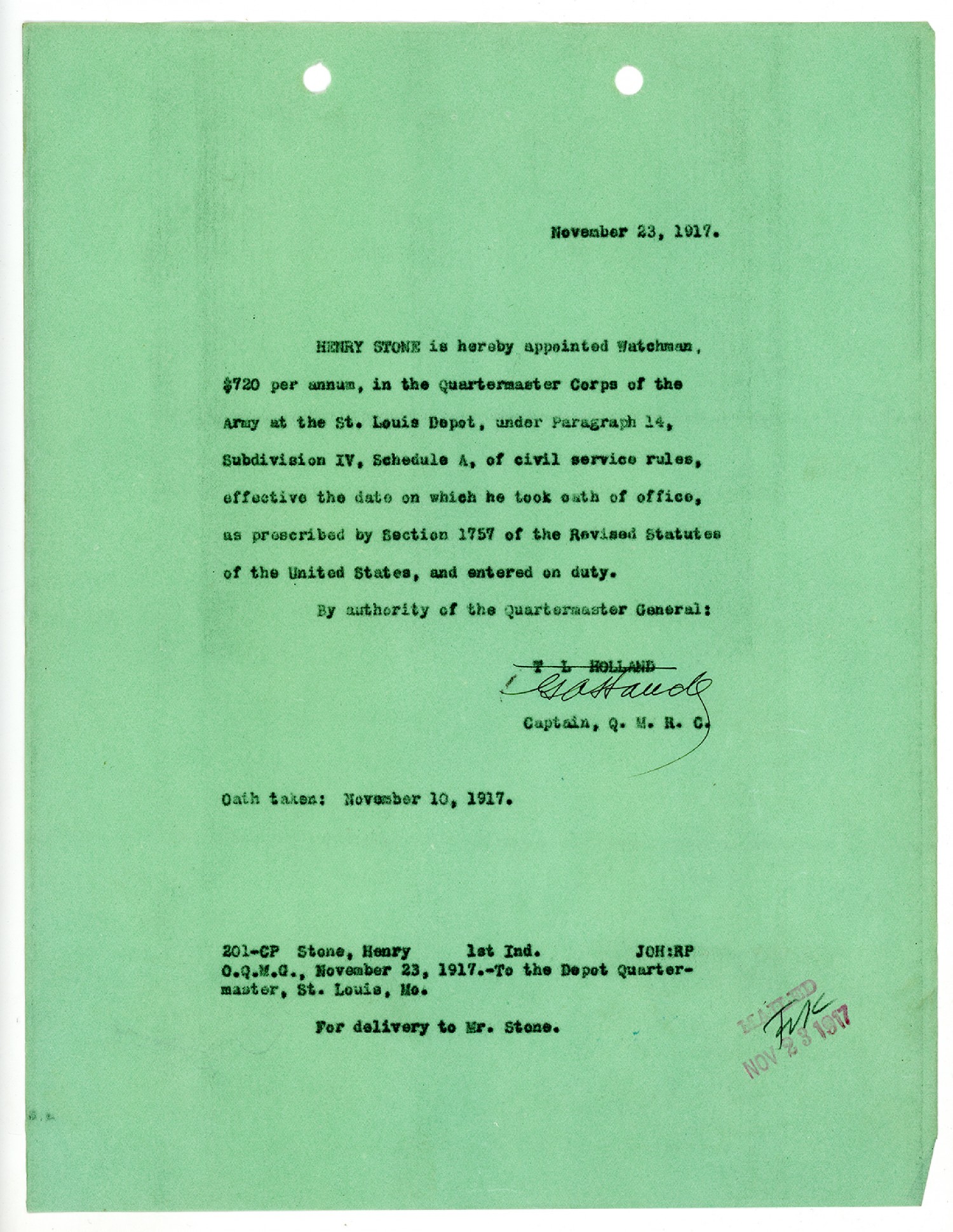 | Description | <p>Personnel files for Henry Stone containing records of payroll, oath of service, notices of salary increases and promotion. Henry Stone was appointed as Watchman in the Quartermaster Corps with the Civilian Personnel Division of the War Department In Missouri on November 10, 1917. He was born in England on April 23, 1861</p> |
