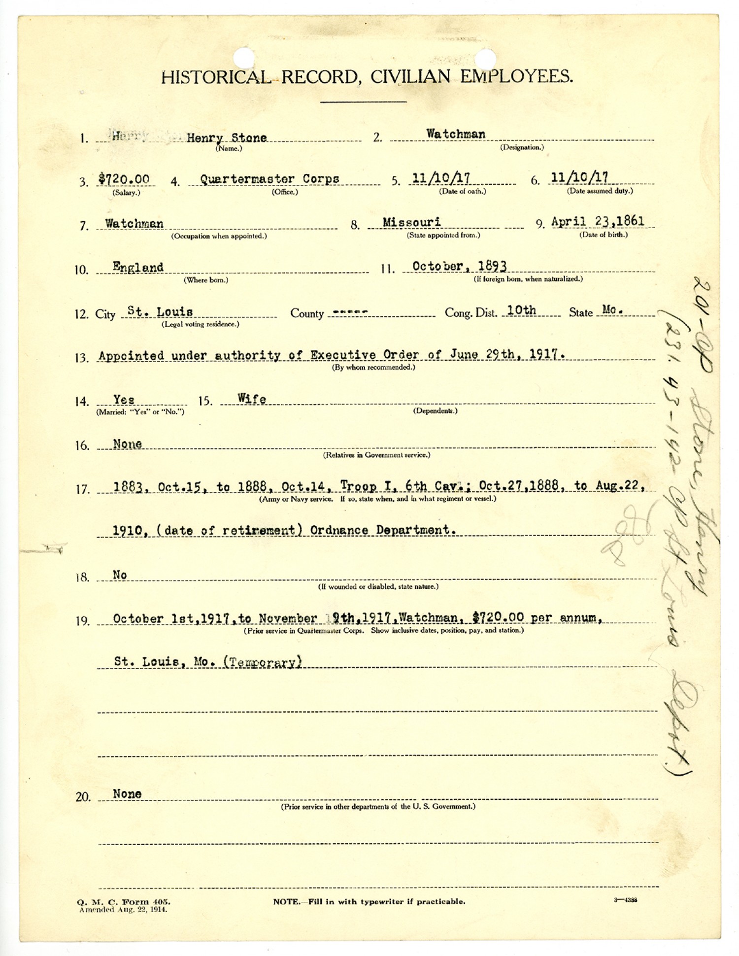 | Source | Stone, Henry; War Department; Records of the U.S. Civil Service Commission, 1871-1981, Record Group 146; National Archives and Records Administration-National Personnel Records Center (St. Louis). |