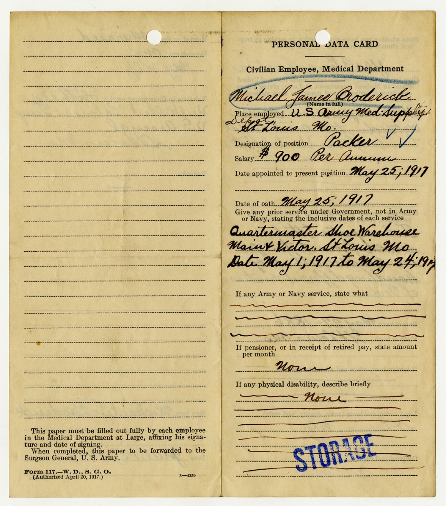 Personal Data Card - May 25, 1917