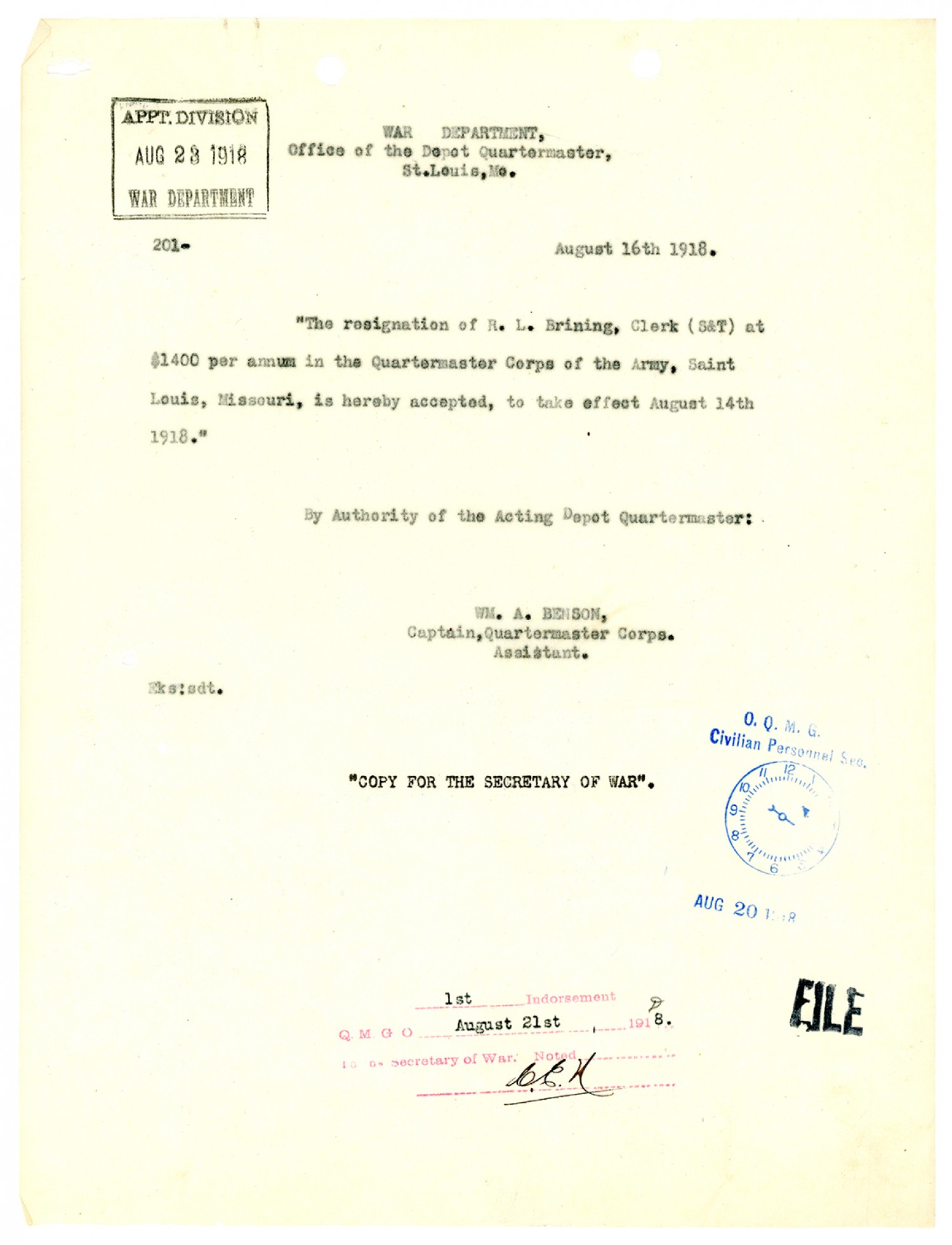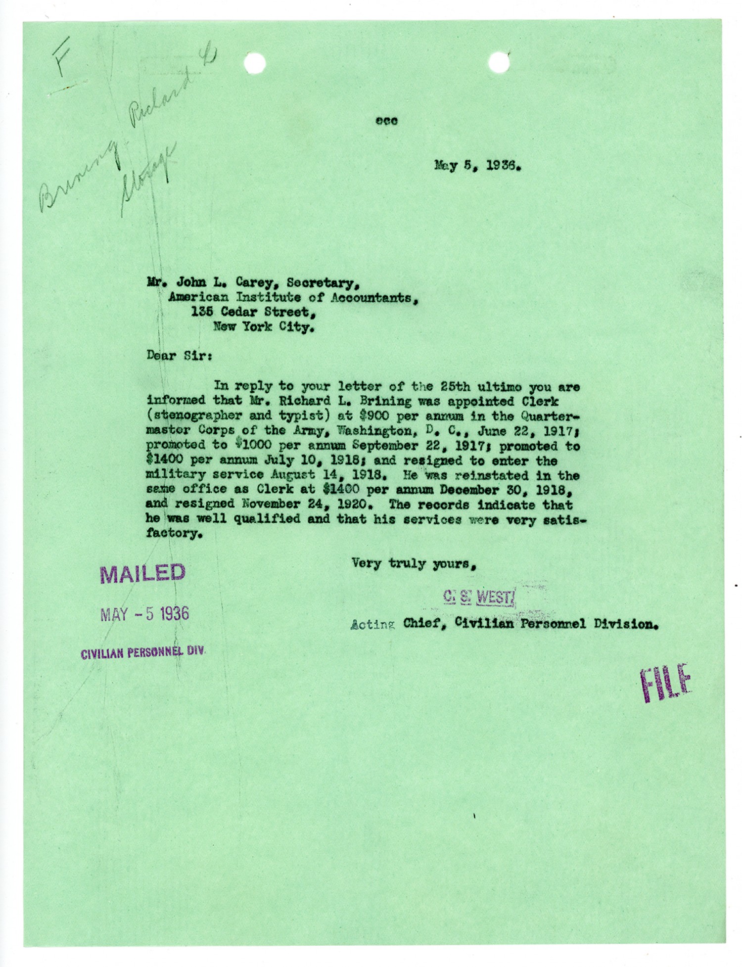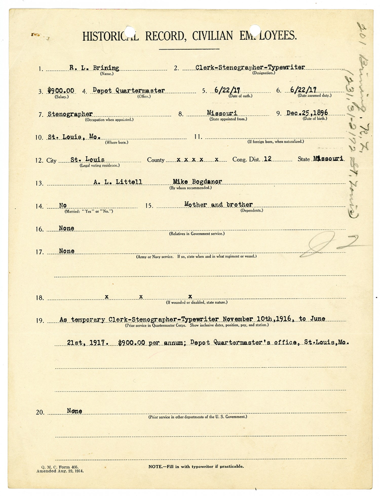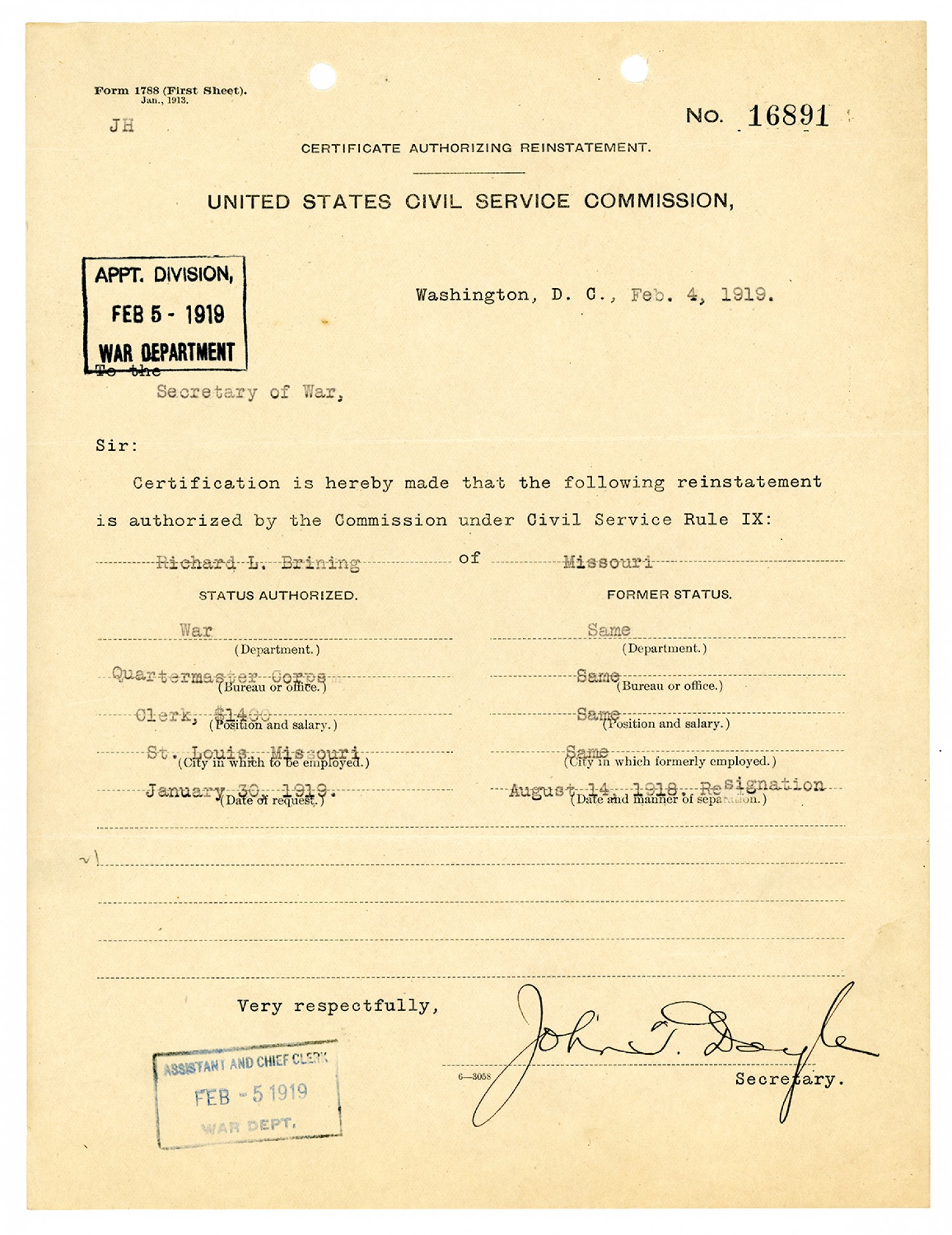| Source | Brining, Richard; War Department; Records of the U.S. Civil Service Commission, 1871-1981, Record Group 146; National Archives and Records Administration-National Personnel Records Center (St. Louis). |
