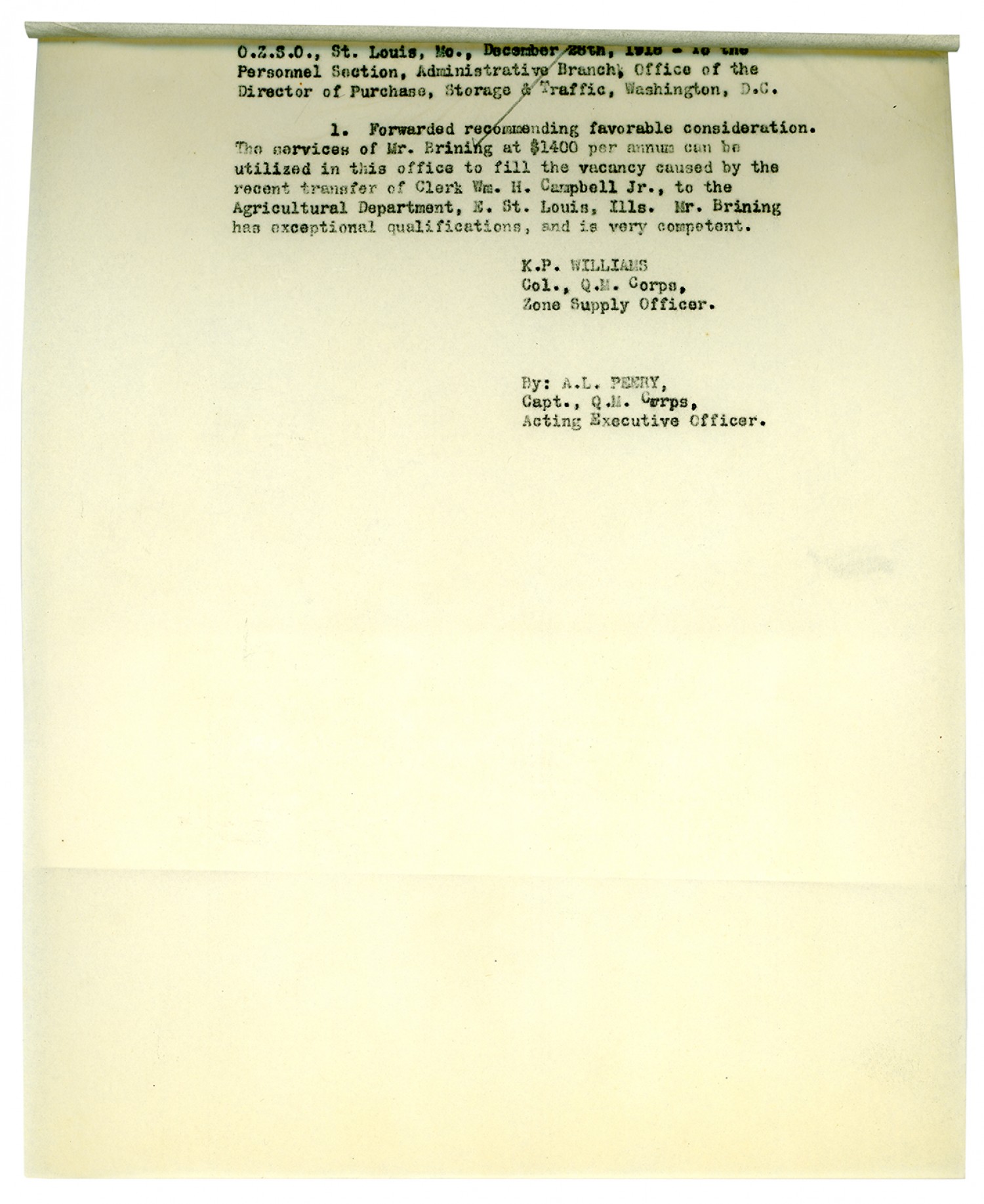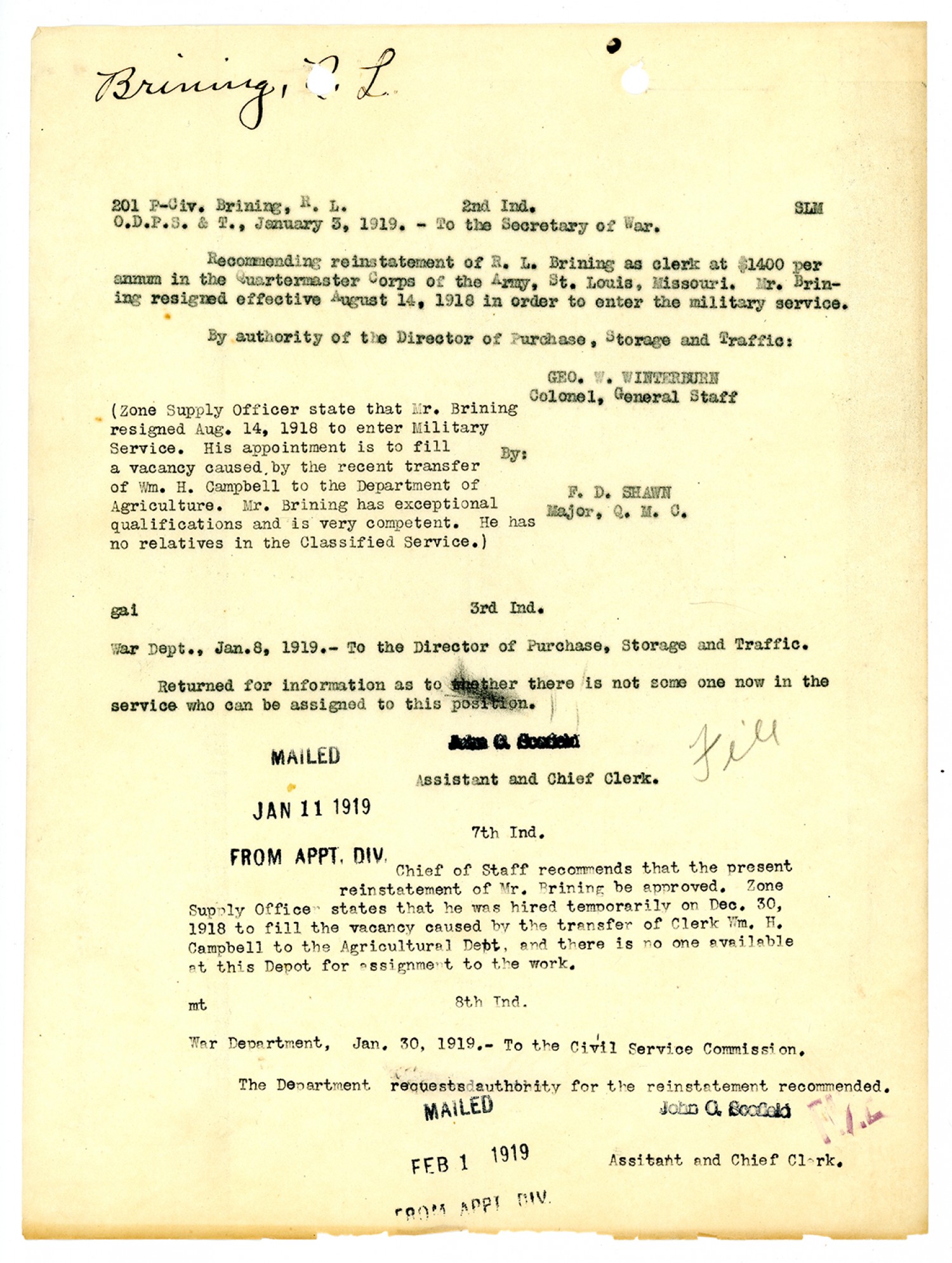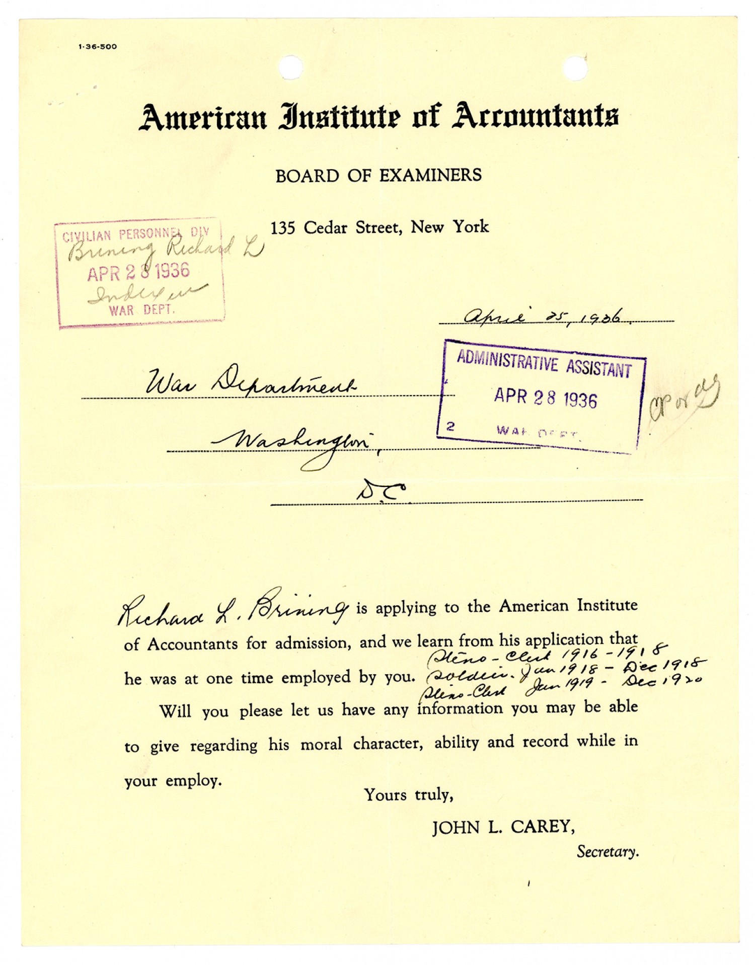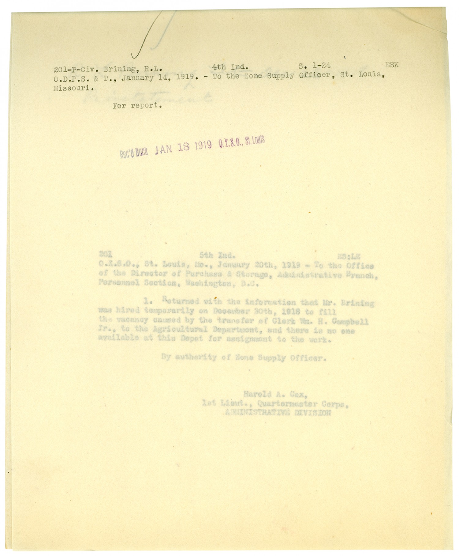 | Source | Brining, Richard; War Department; Records of the U.S. Civil Service Commission, 1871-1981, Record Group 146; National Archives and Records Administration-National Personnel Records Center (St. Louis). |
