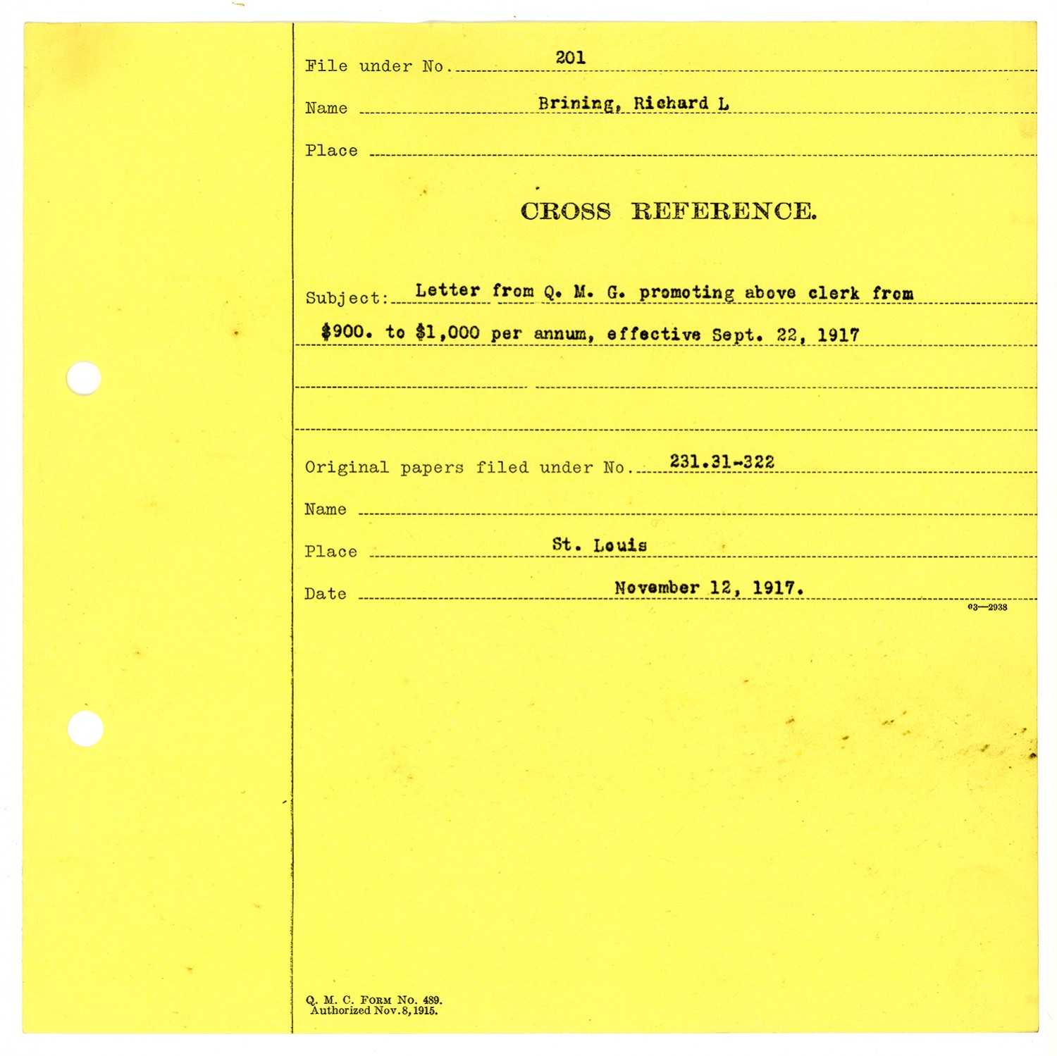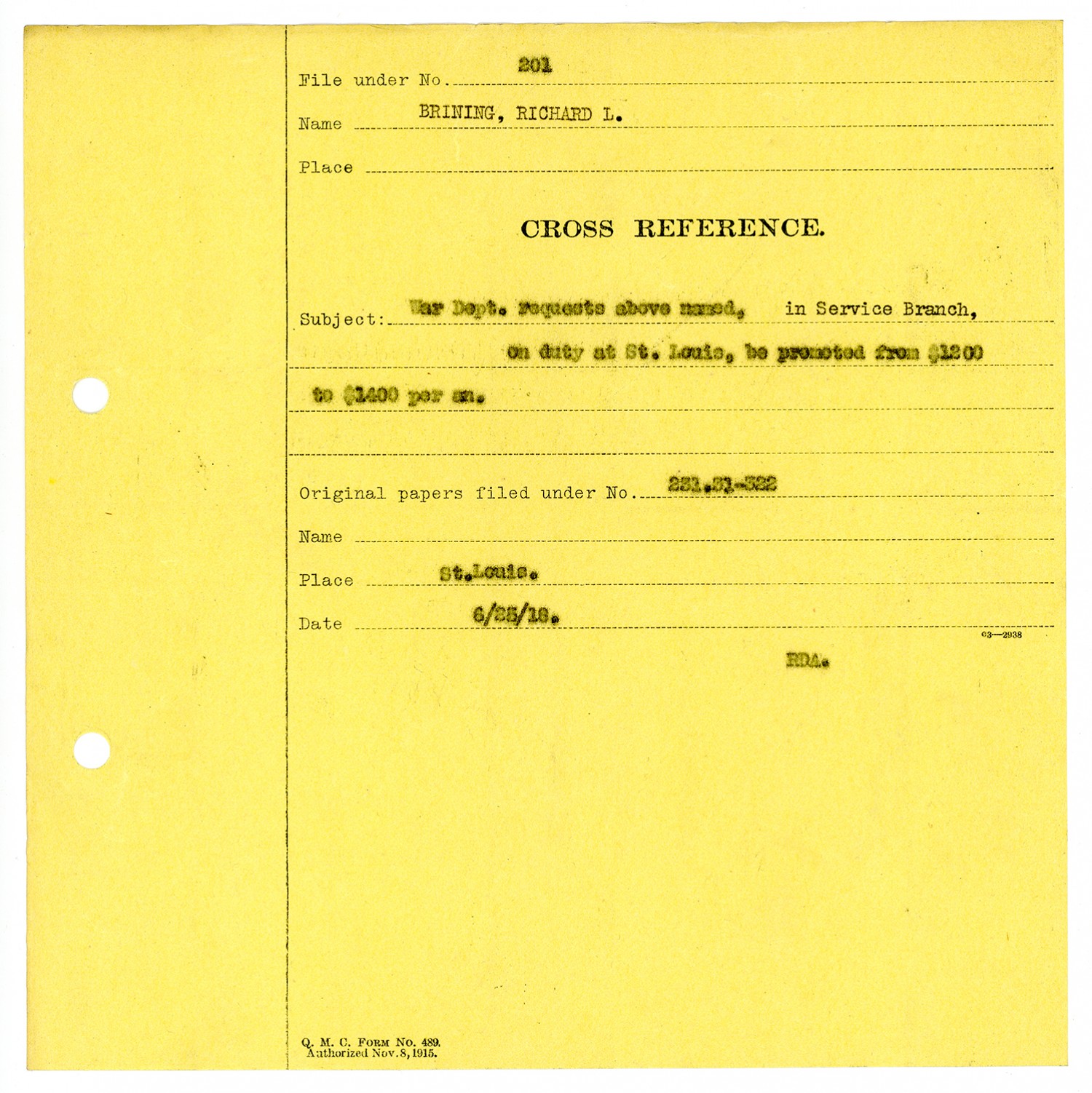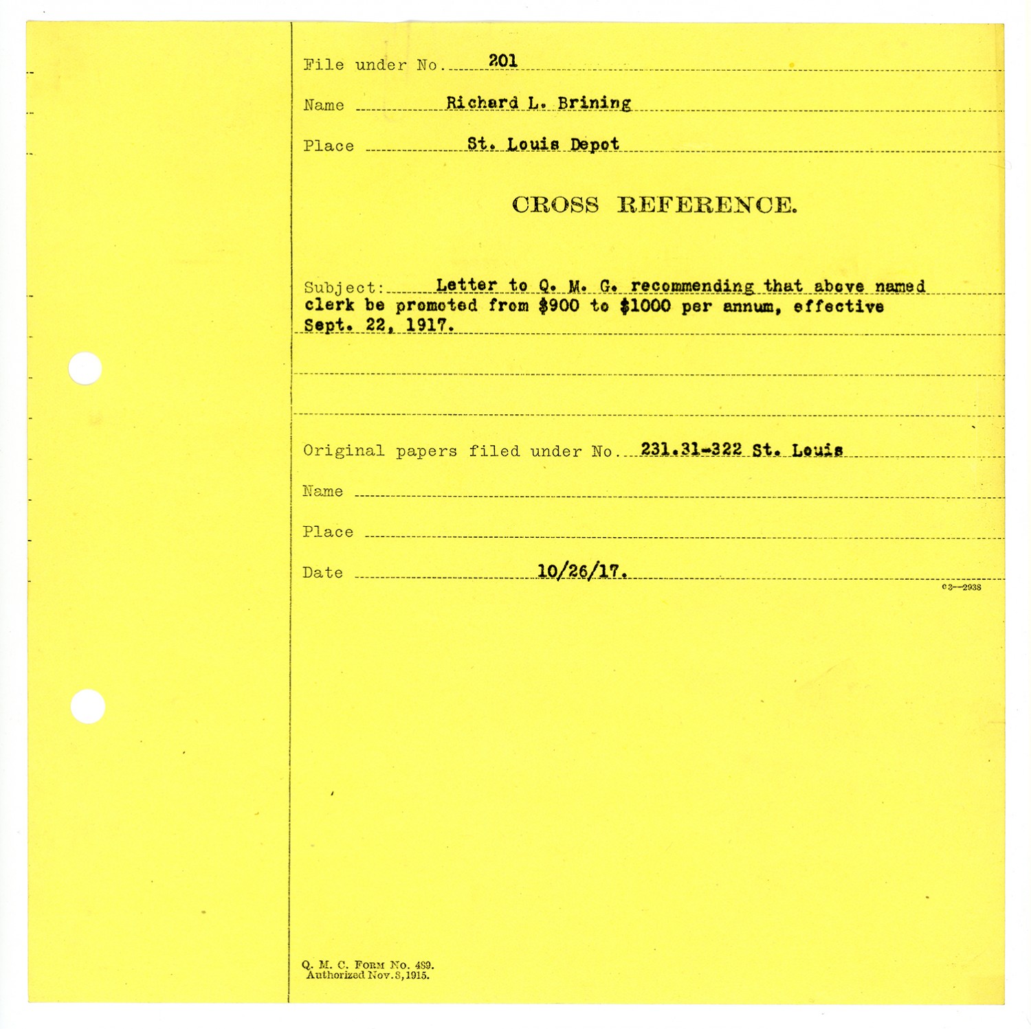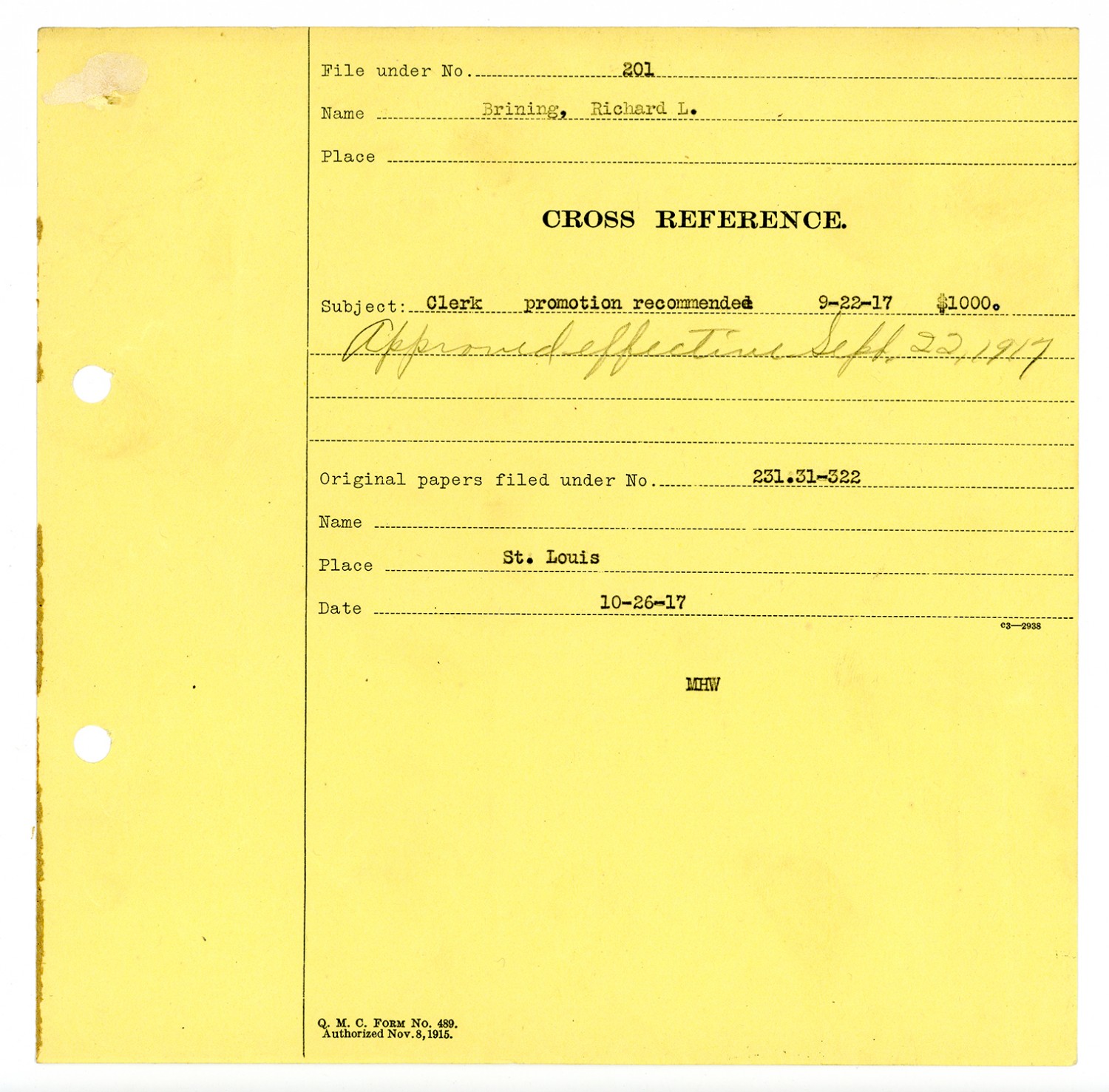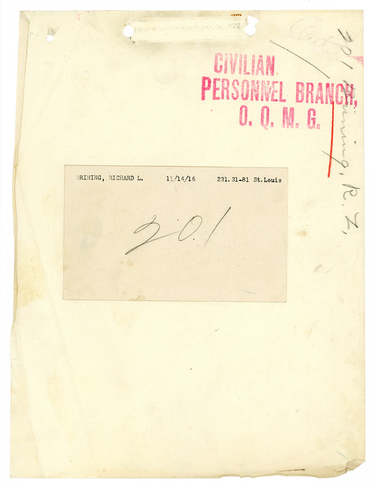 | Description | <p>Civilian personnel record file for Richard Brining. Richard Brining provided civilian service as a clerk at the office of the Depot Quartermaster in St. Louis. The file documents Richard's appointment, promotion, and personnel file while working as a civilian in military service.</p> |