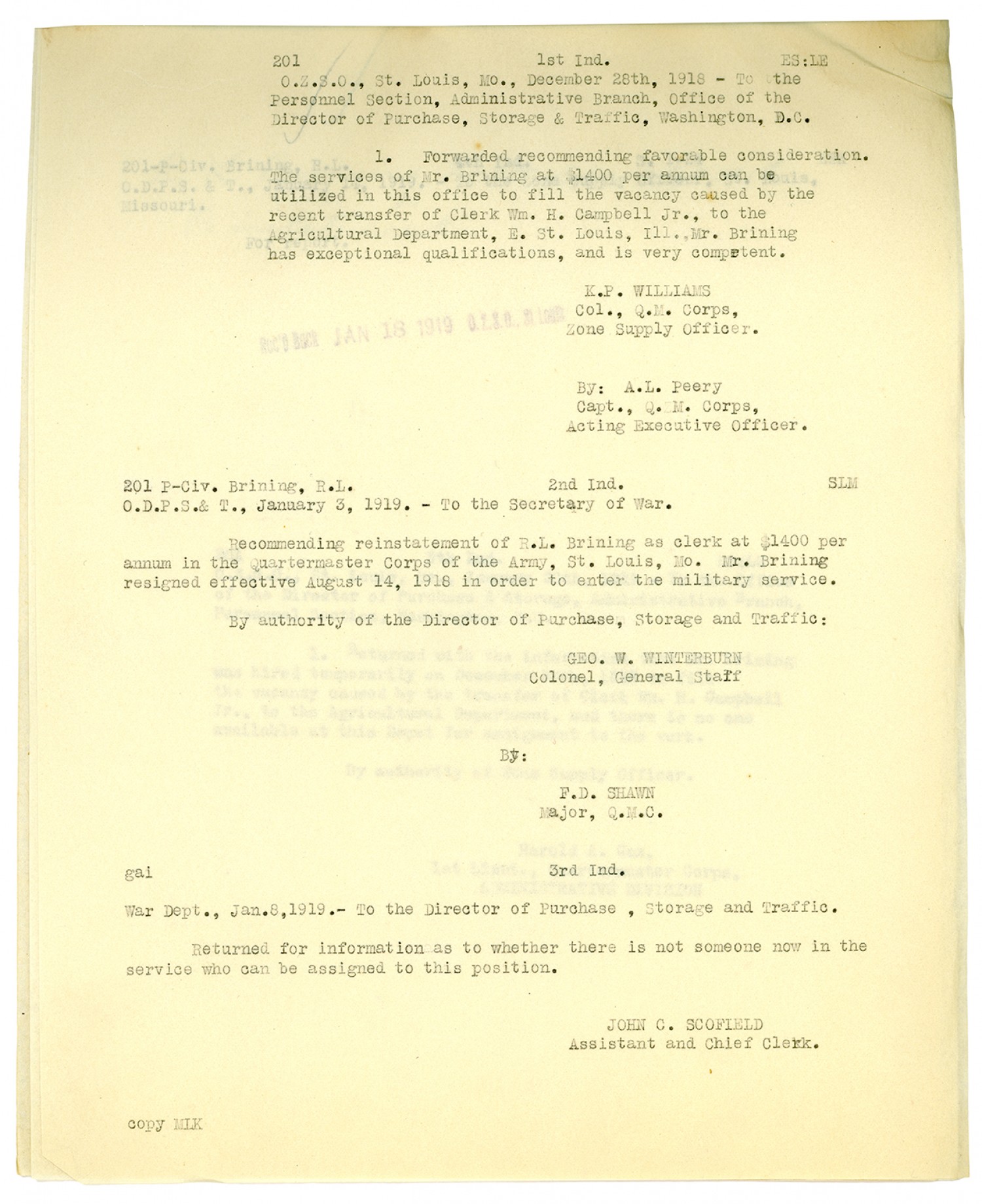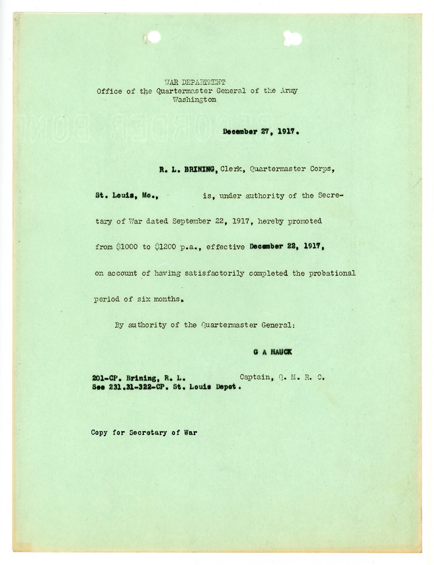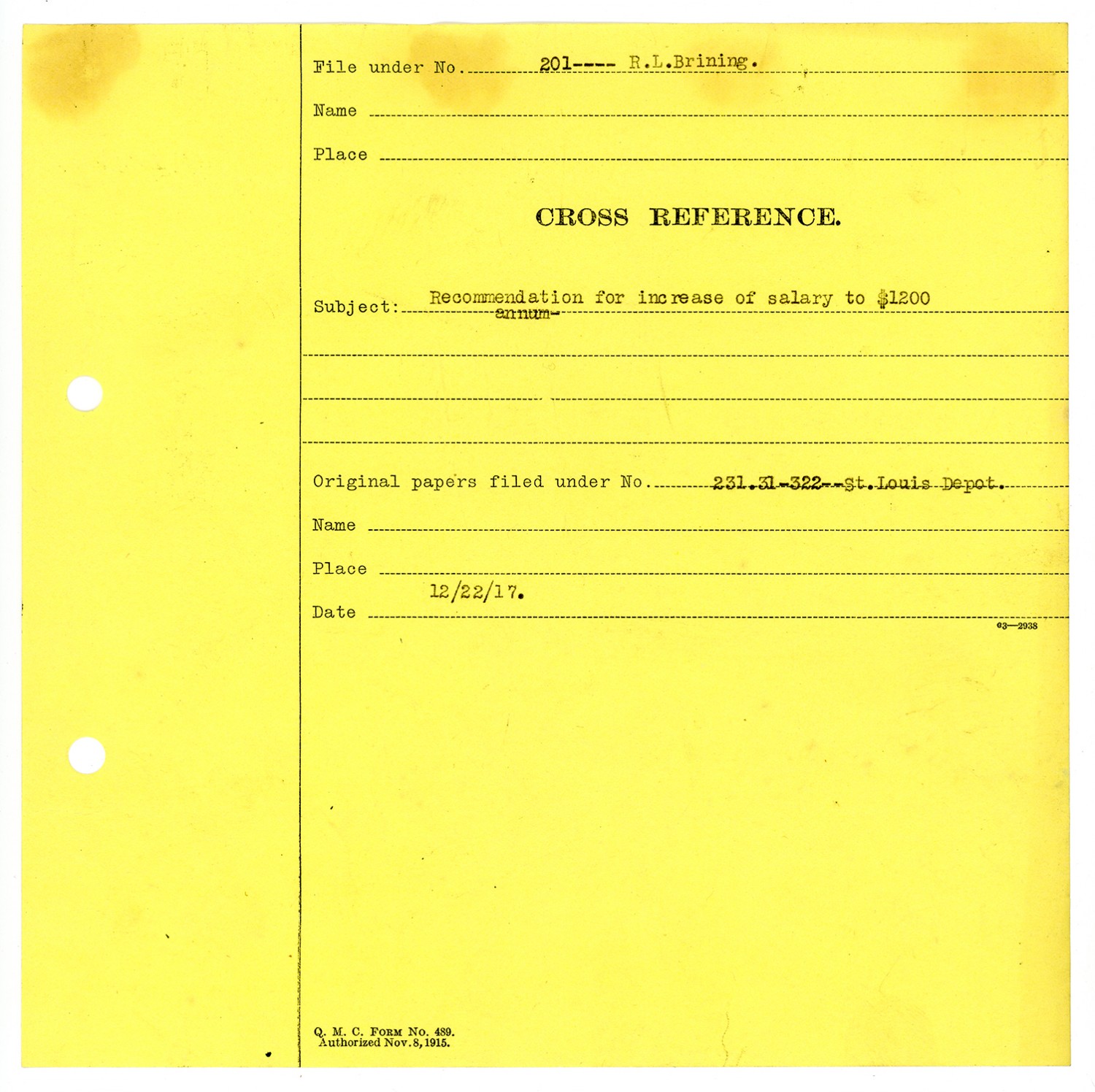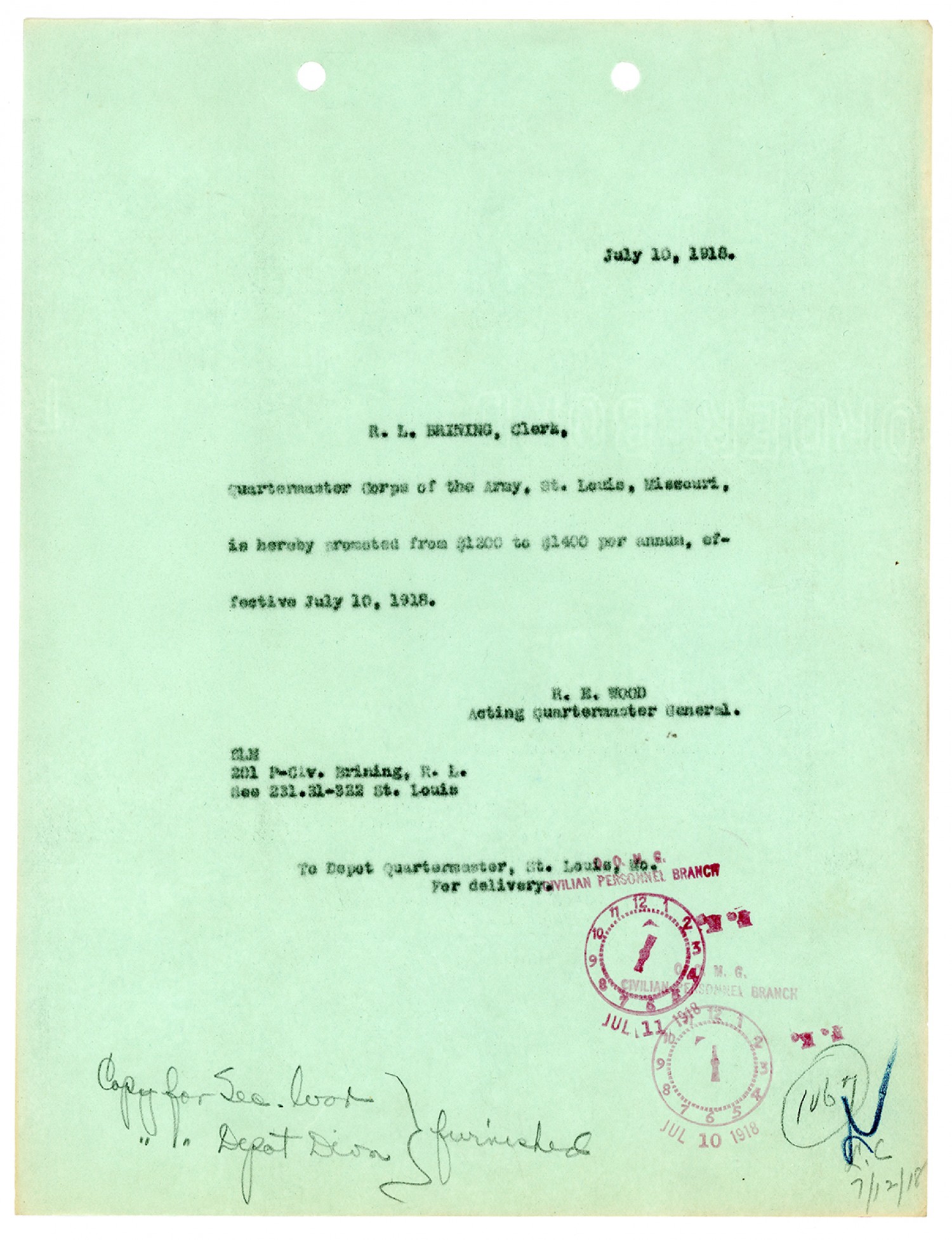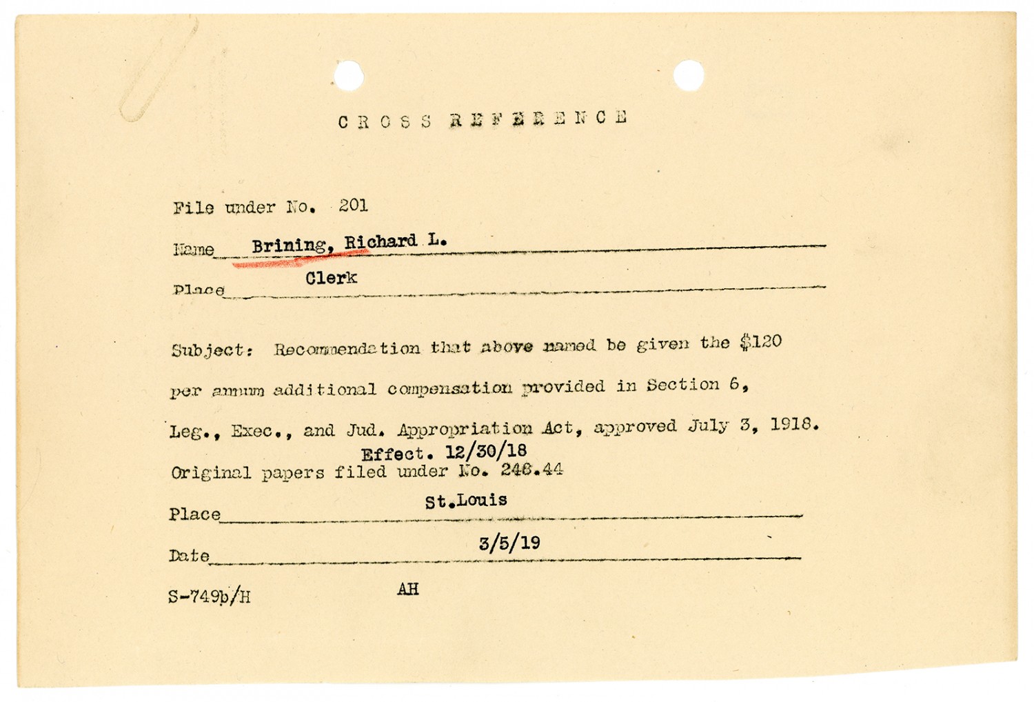 | Description | <p>Civilian personnel record file for Richard Brining. Richard Brining provided civilian service as a clerk at the office of the Depot Quartermaster in St. Louis. The file documents Richard's appointment, promotion, and personnel file while working as a civilian in military service.</p> |