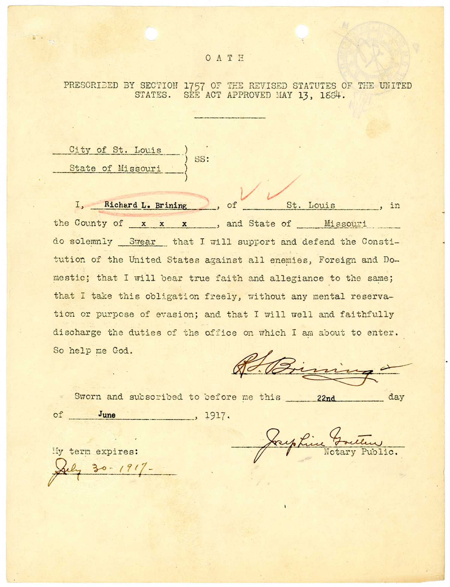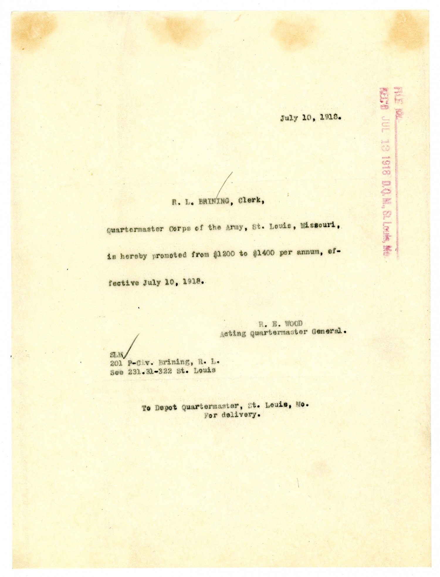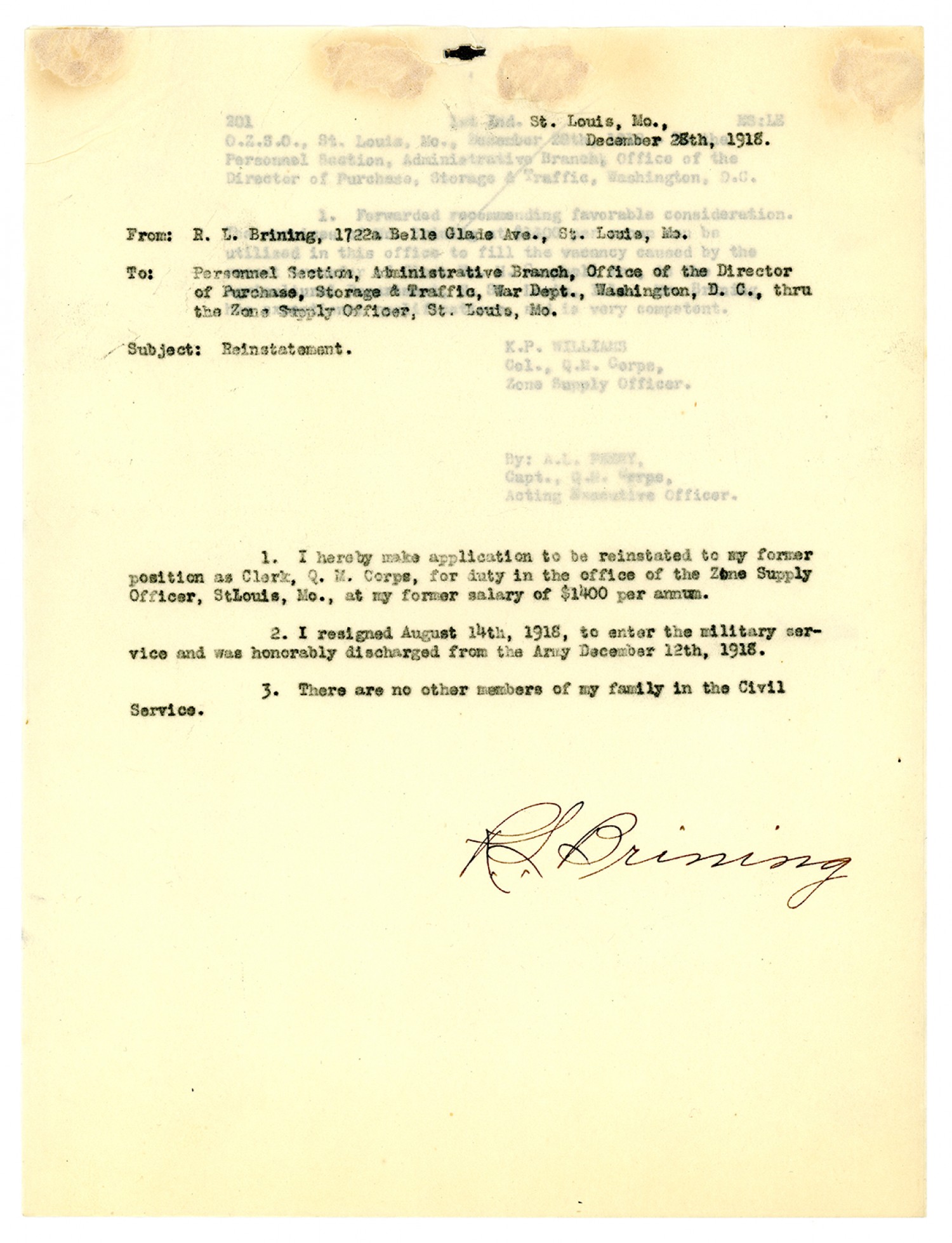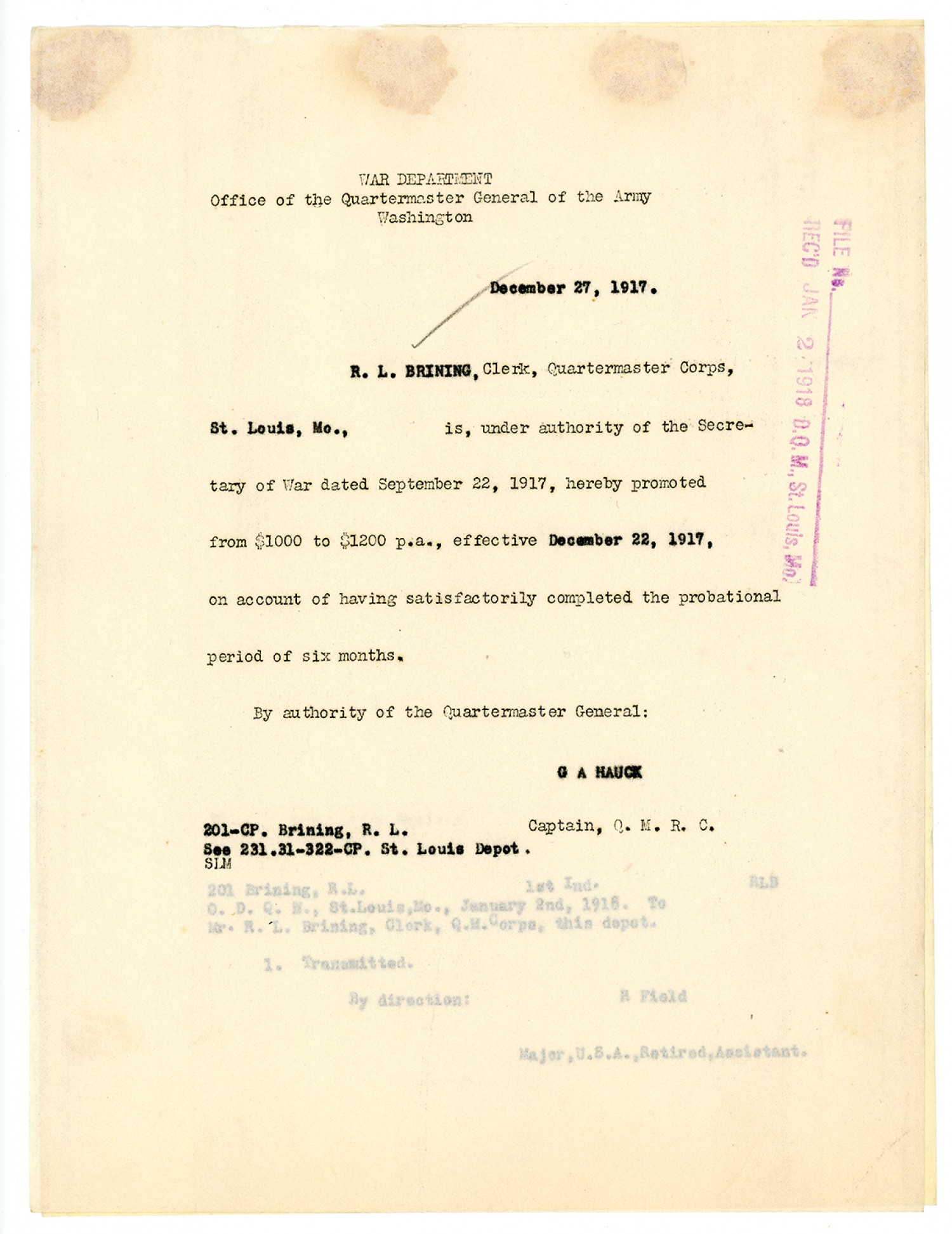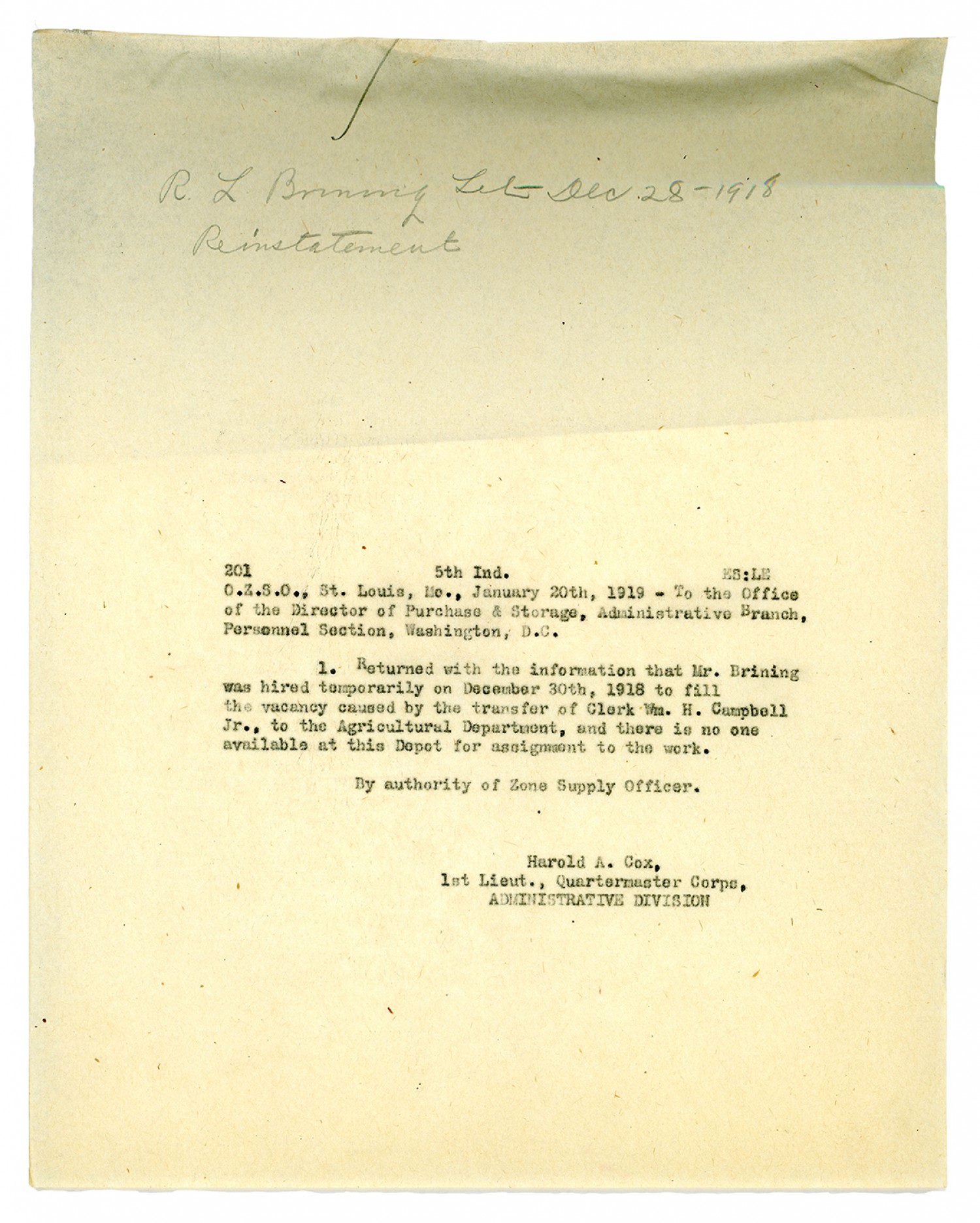 | Description | <p>Civilian personnel record file for Richard Brining. Richard Brining provided civilian service as a clerk at the office of the Depot Quartermaster in St. Louis. The file documents Richard's appointment, promotion, and personnel file while working as a civilian in military service.</p> |