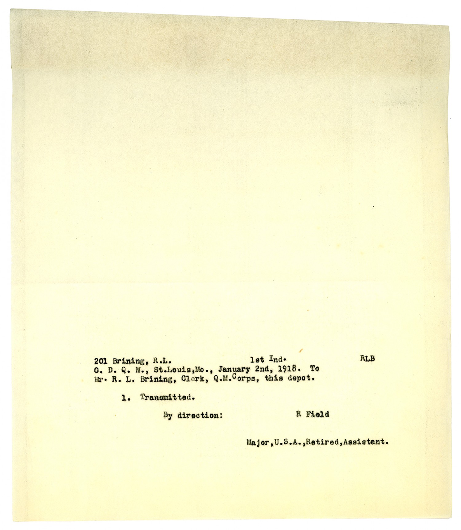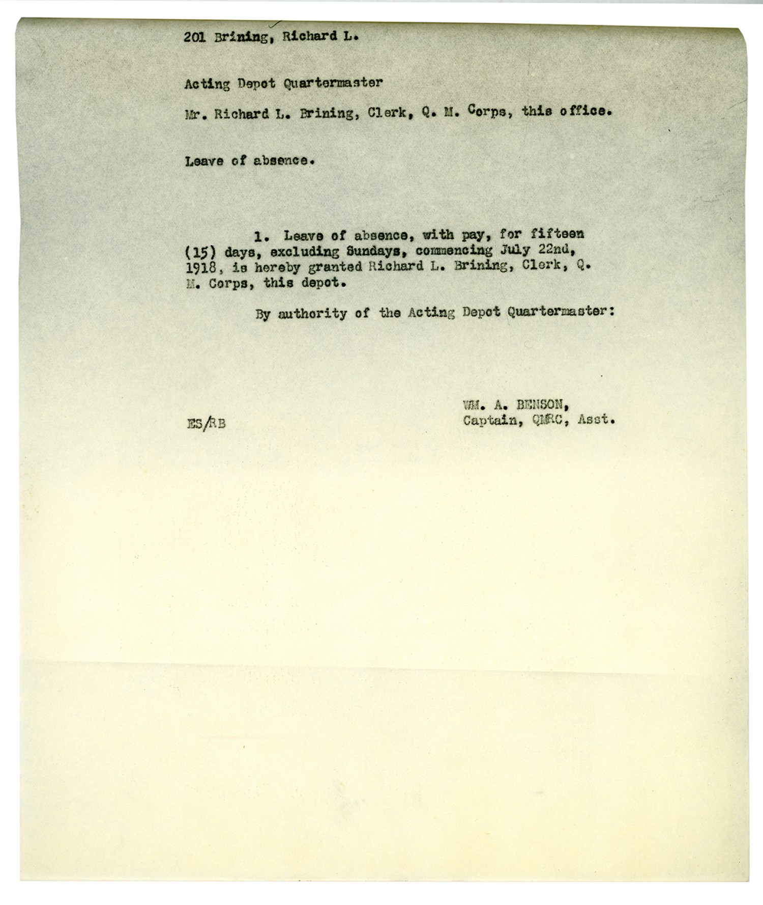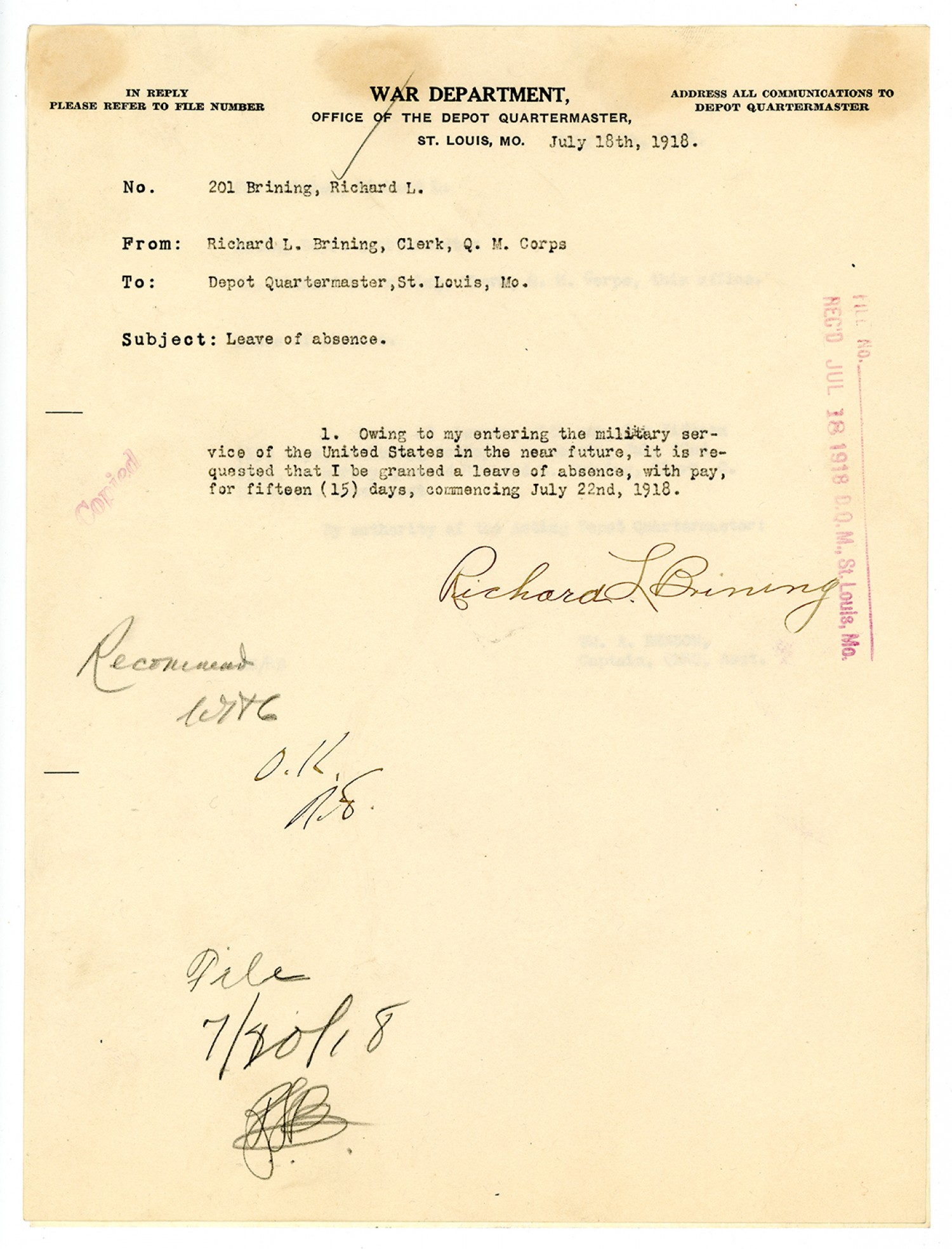 Richard Brining letter to the Depot Quartermaster - July 18, 1918