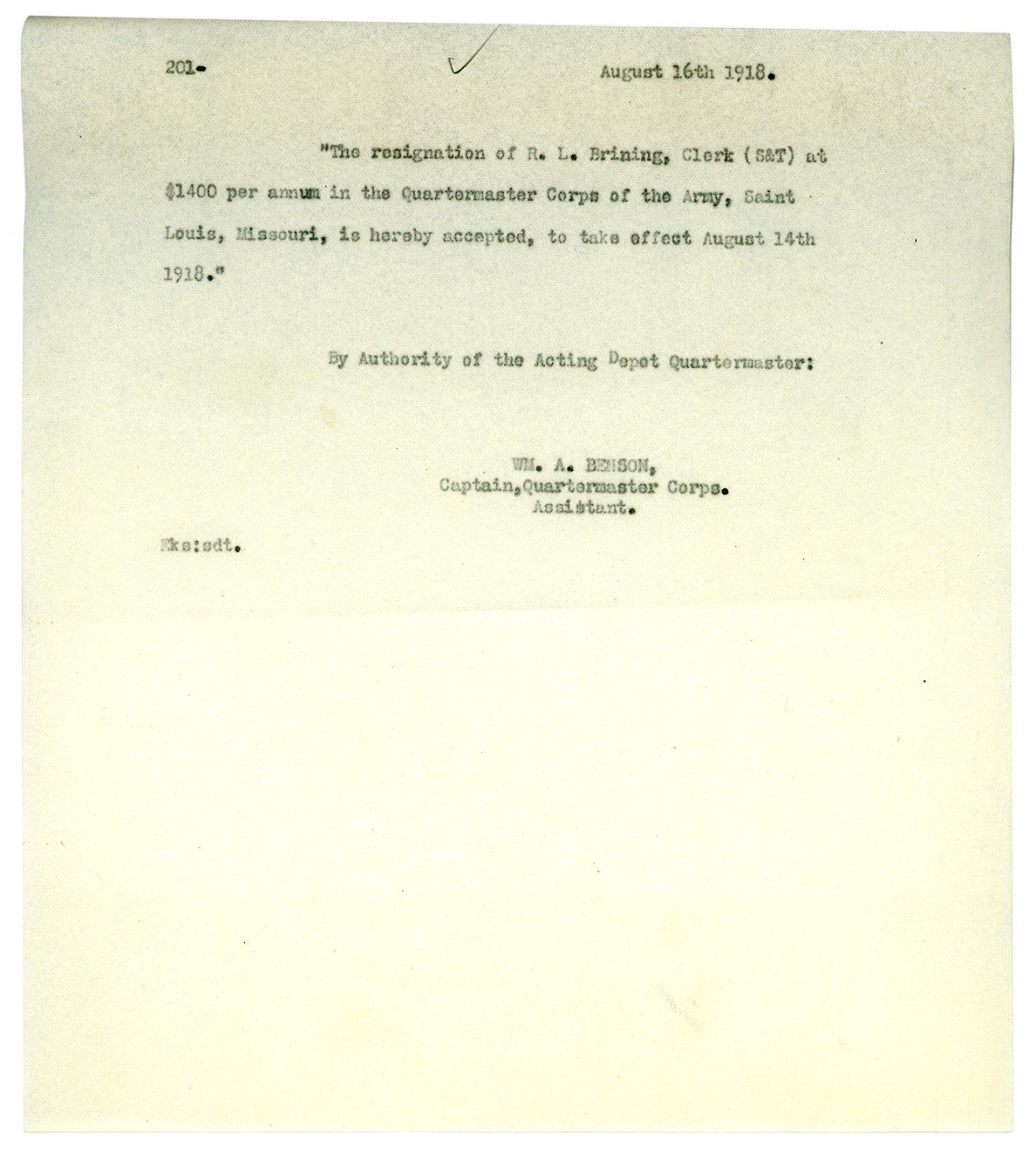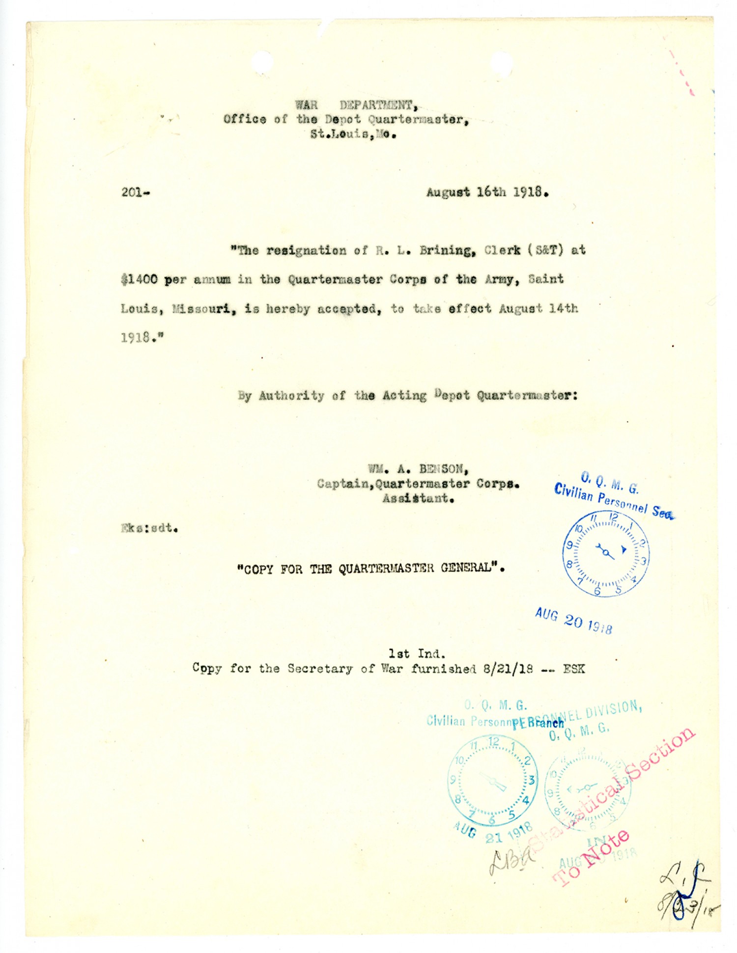 Richard Brining letter to the Depot Quartermaster - August 14, 1918