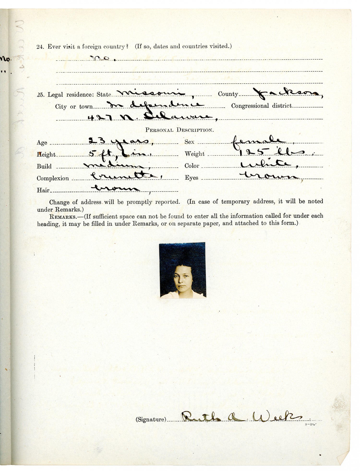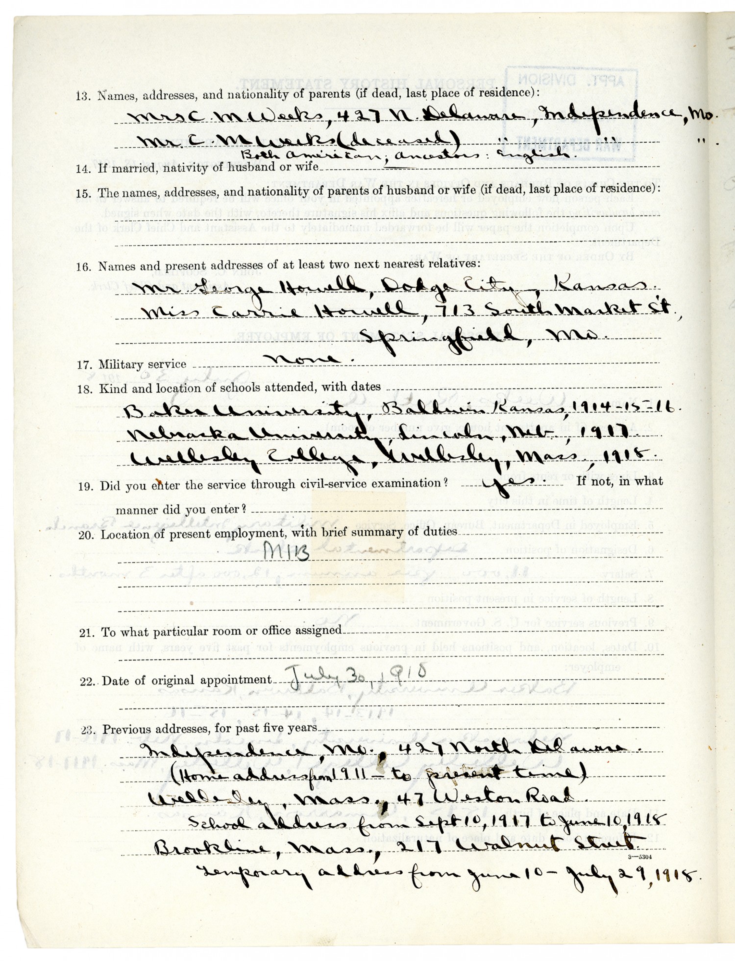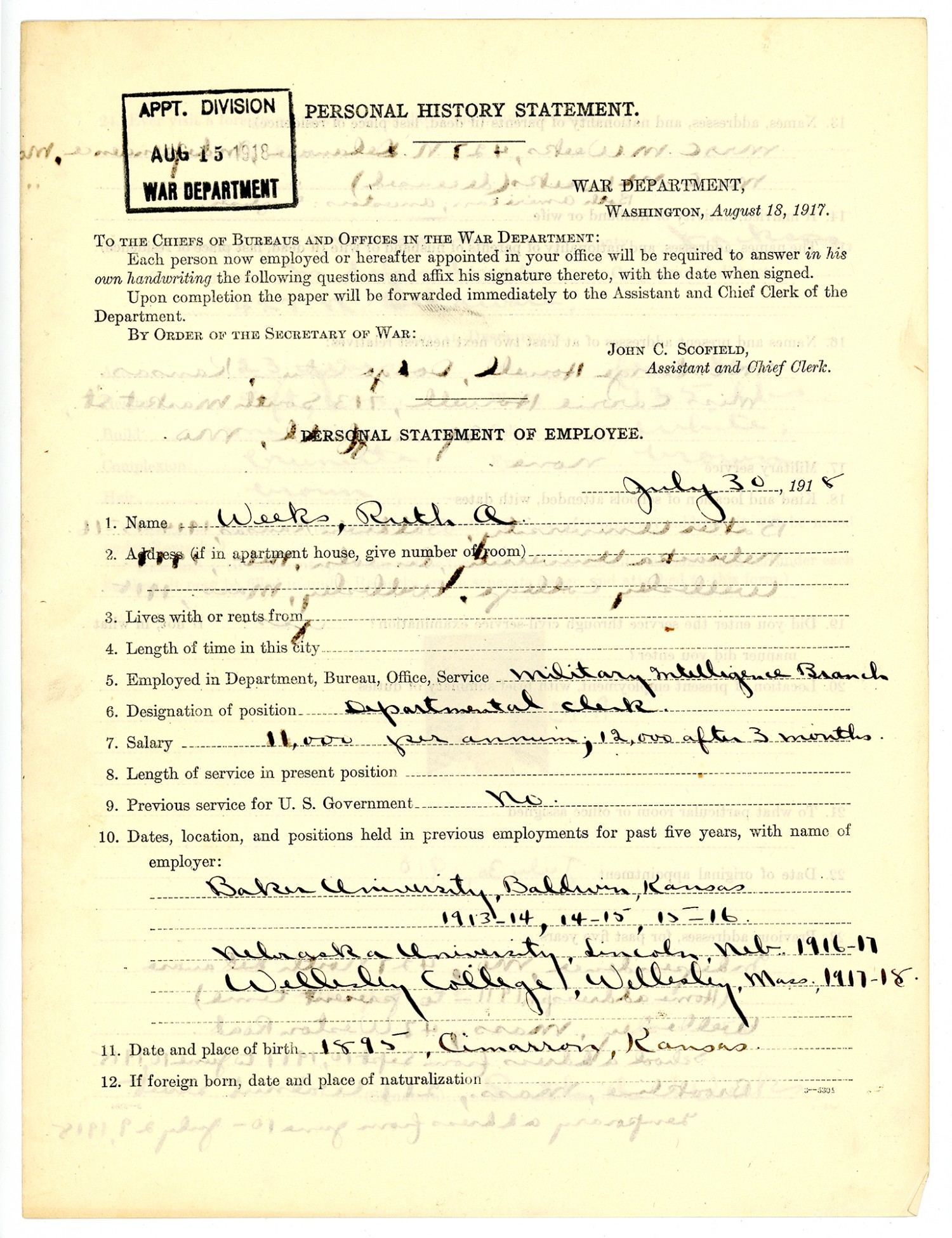 | Description | <p>Personnel files for Ruth A. Weeks containing a declaration of appointee, personal history records, and letters of correspondence. Ruth Weeks was appointed with the Quartermaster Corps as Filing Clerk for temporary duty with the Director of Military Intelligence Division in Washington D.C. and then later for duty in Berne, Switzerland at the Military Attache, American Legation on November 5, 1918. She was born in 1895 in Cimarron, Kansas and was a resident of Independence, Missouri when first appointed to civilian military service on November 5, 1918. </p> |