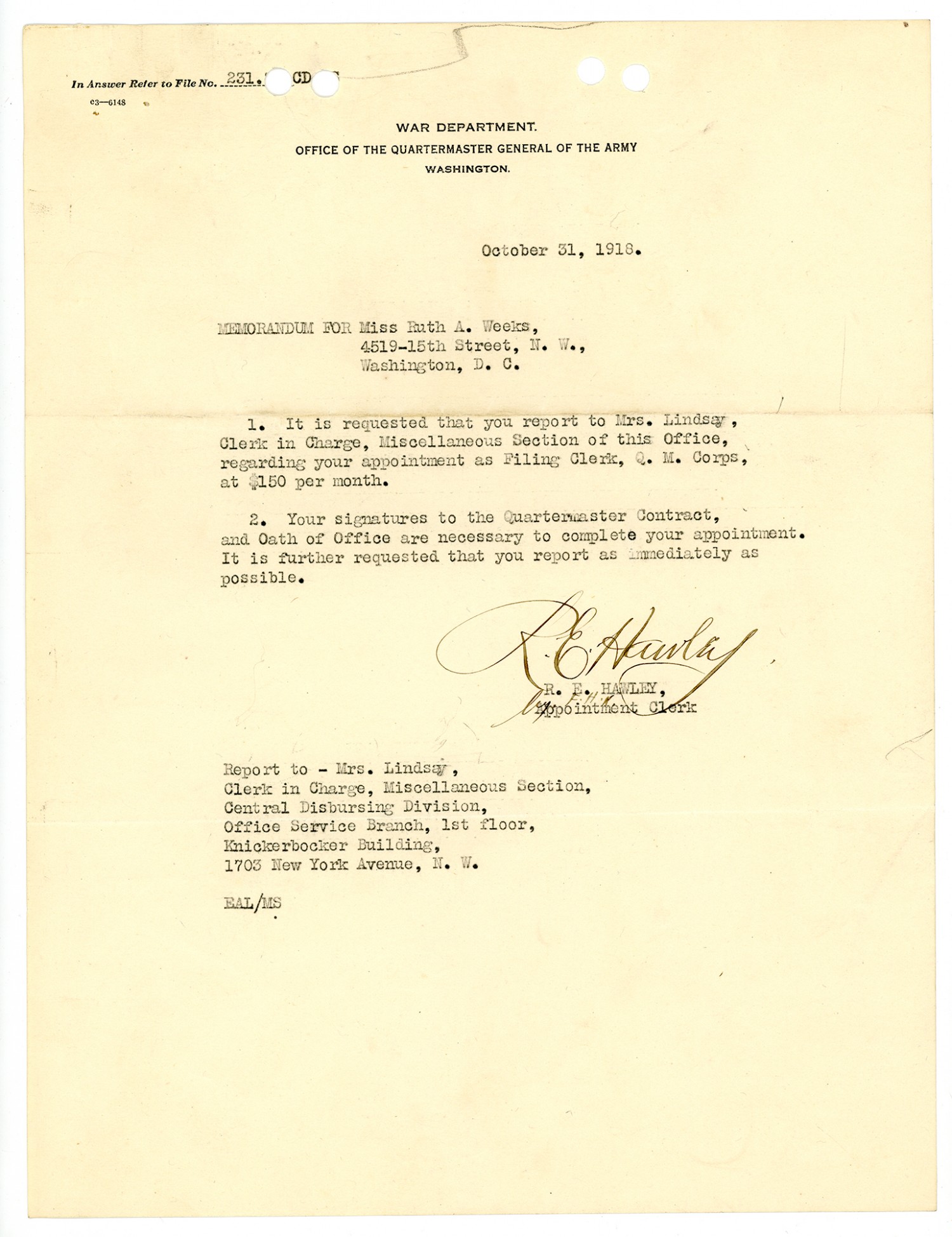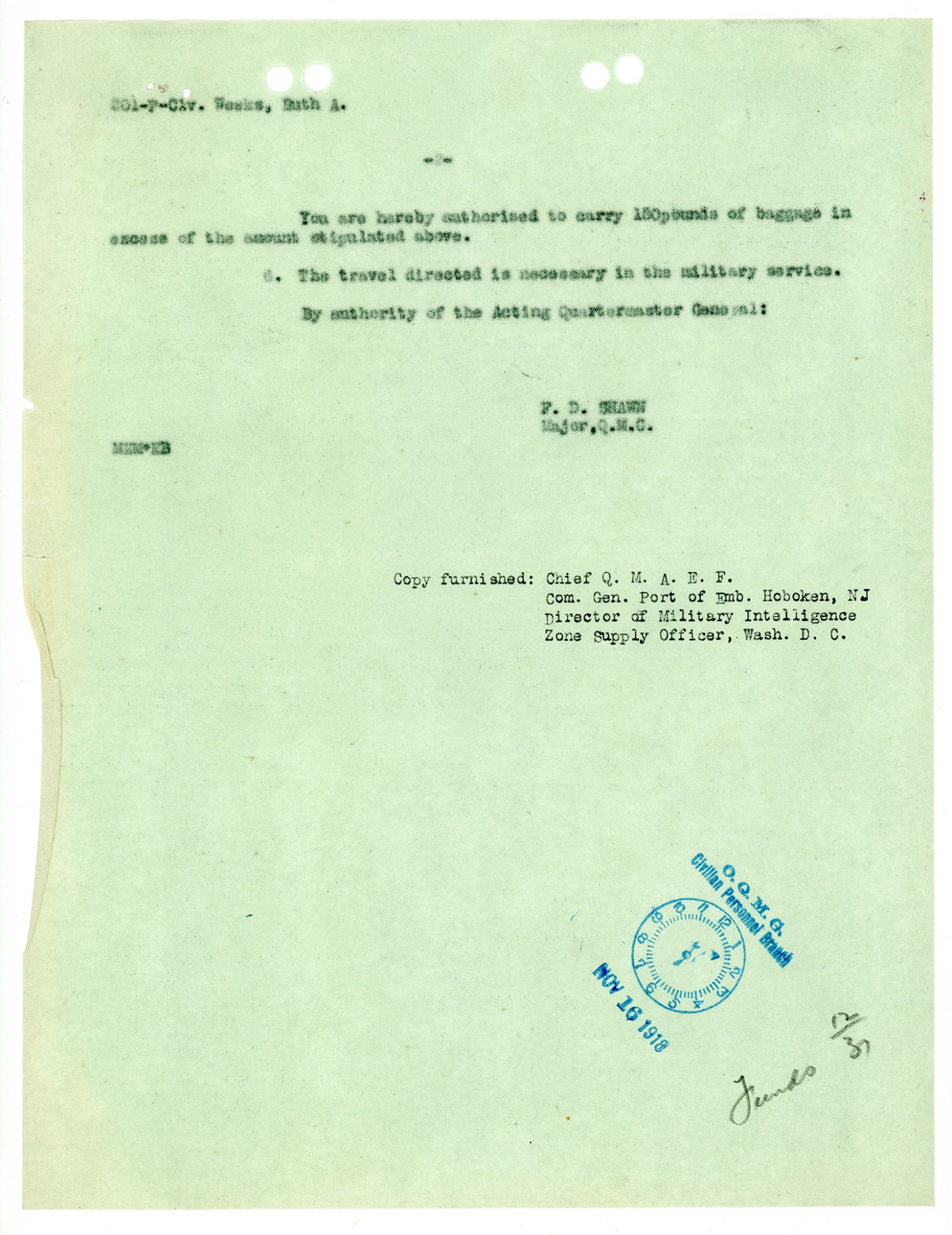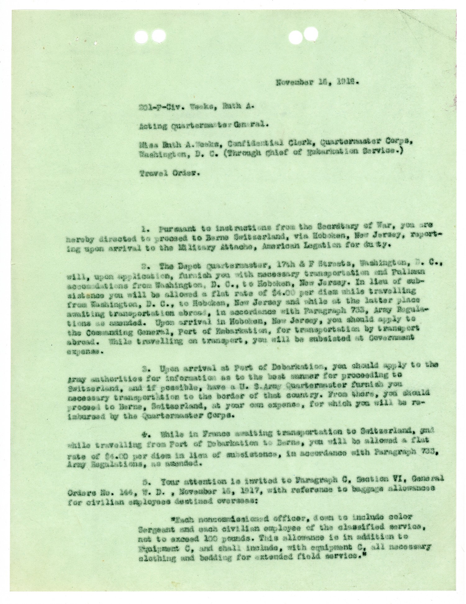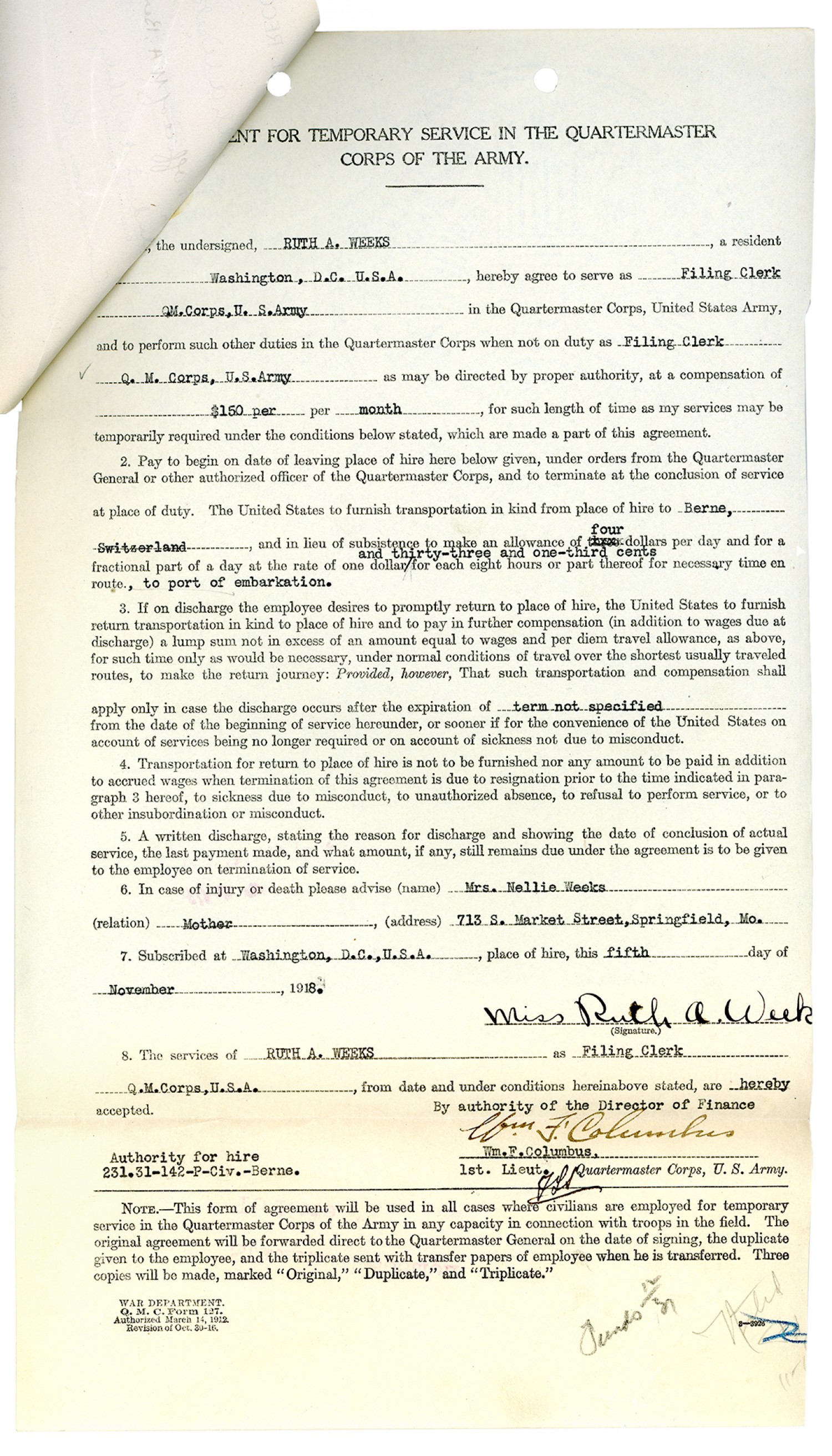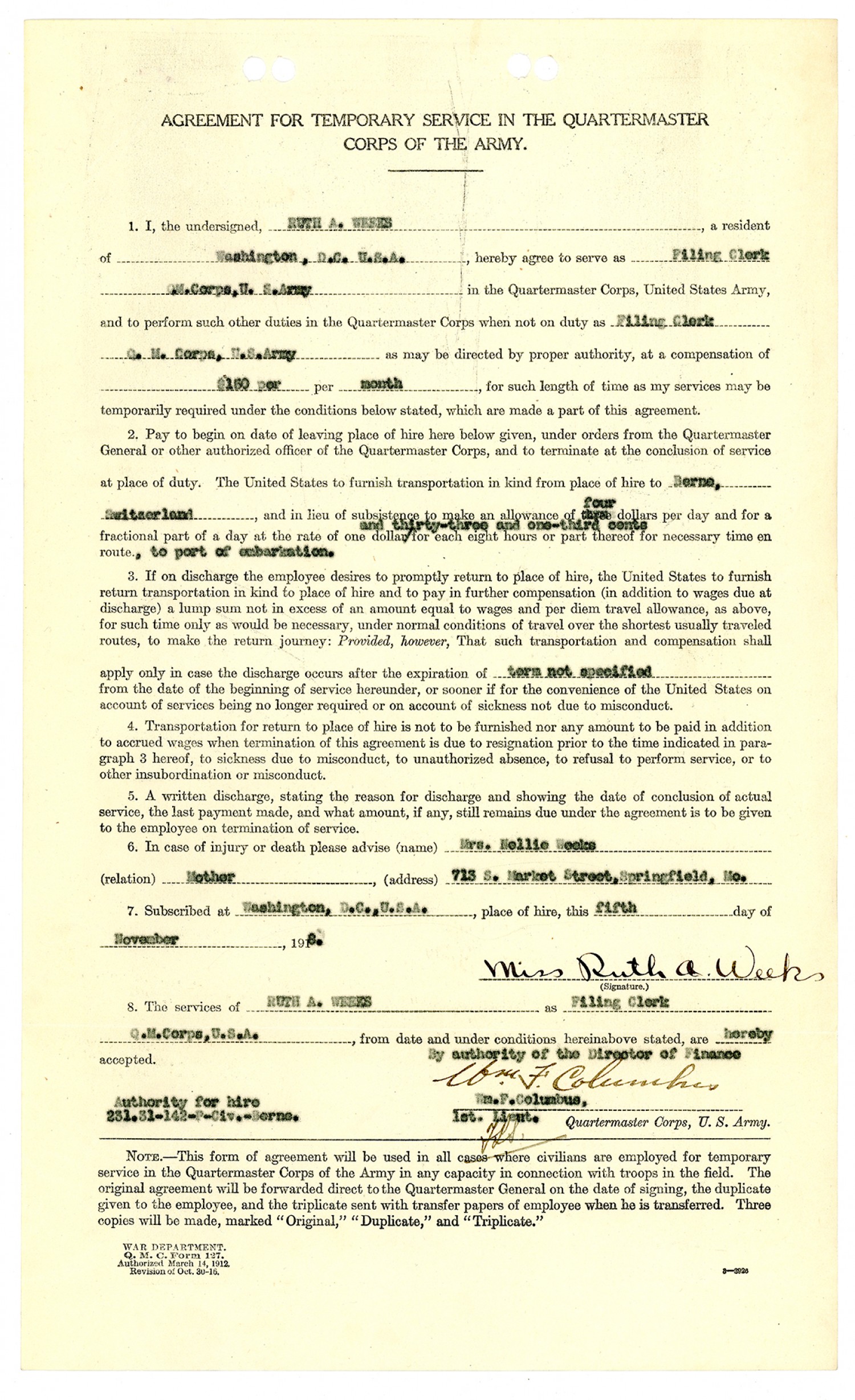 Ruth Weeks Quartermaster Corps Service Agreement - November 5, 1918