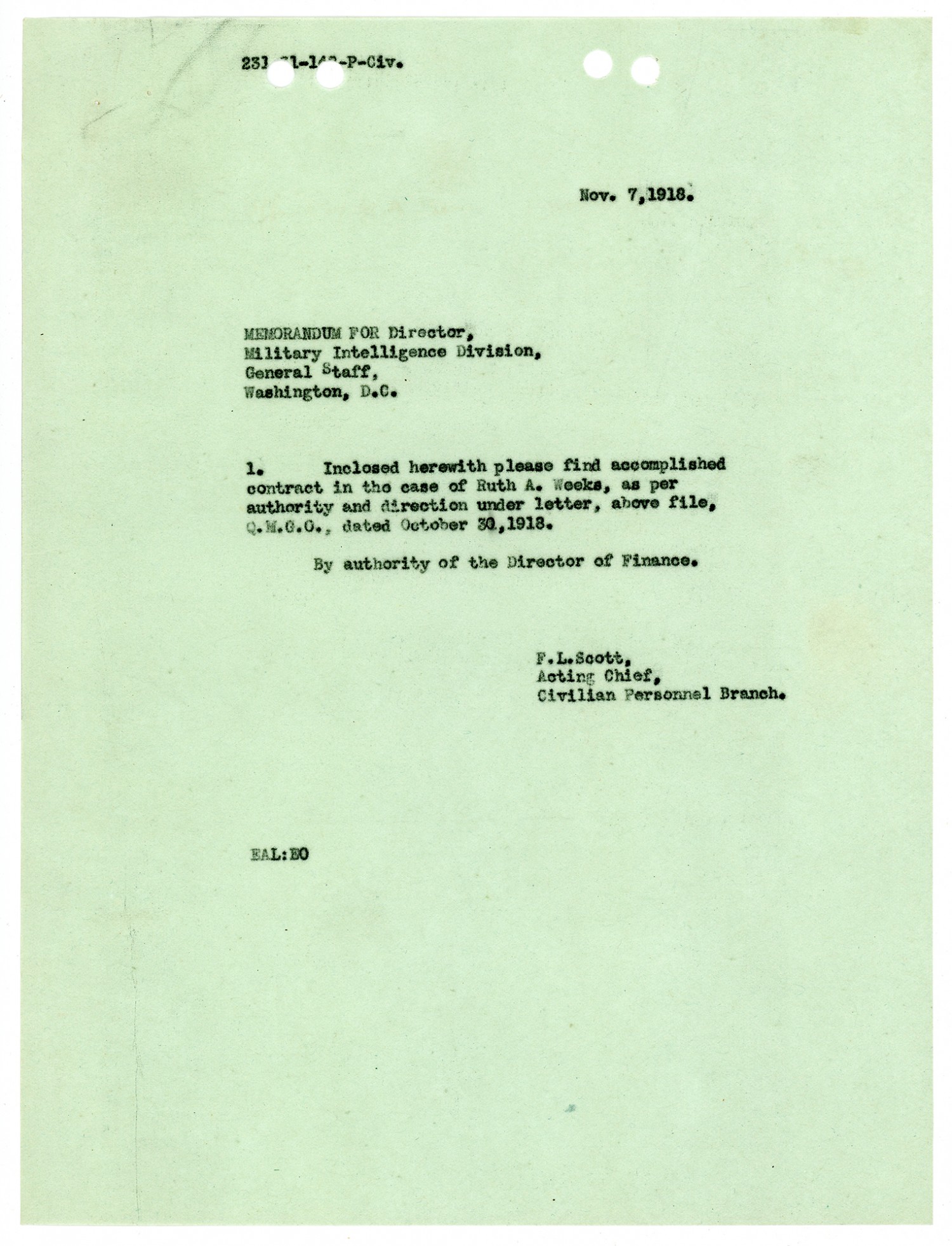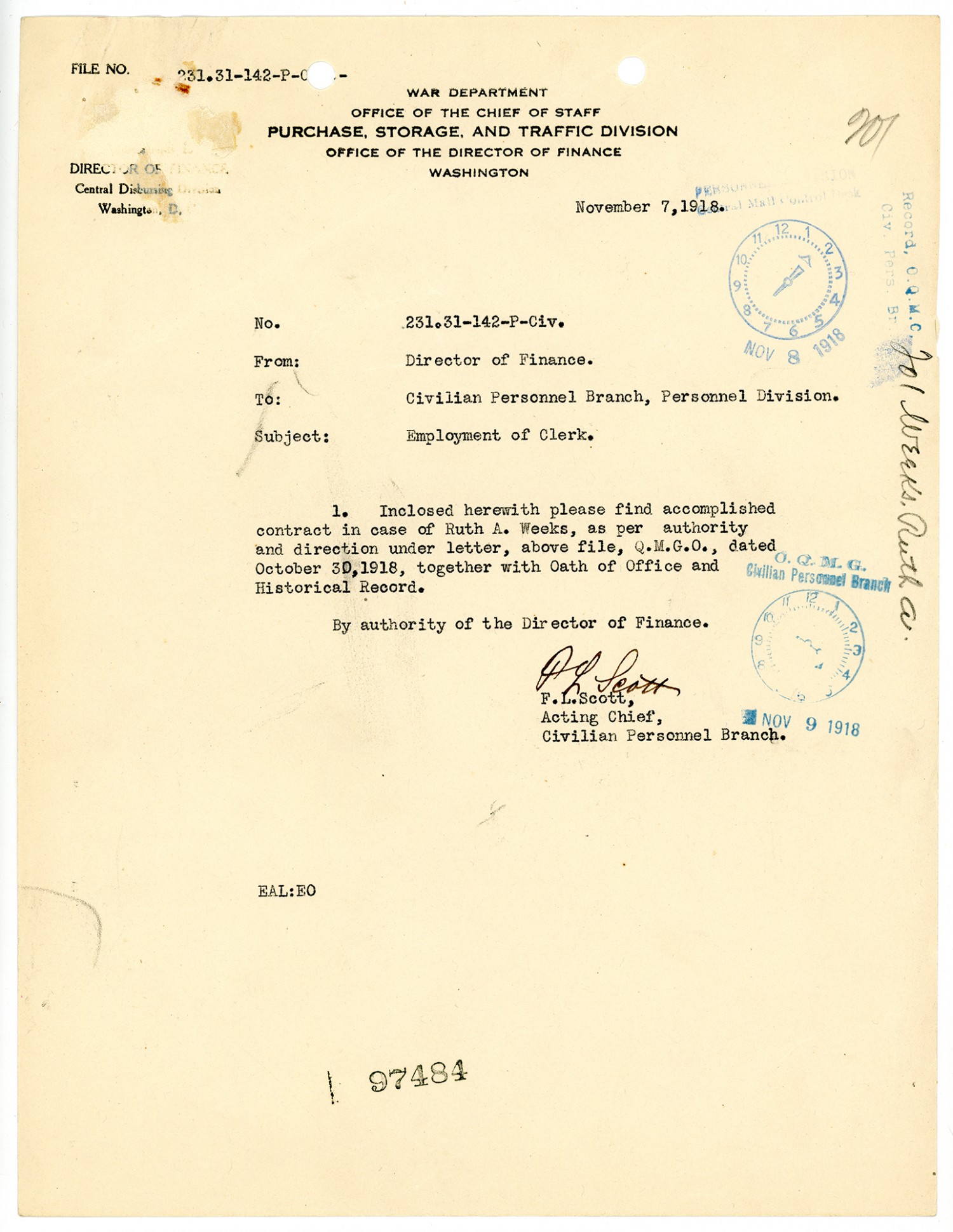 F.L. Scott letter to Civilian Personnel Branch - November 7, 1918