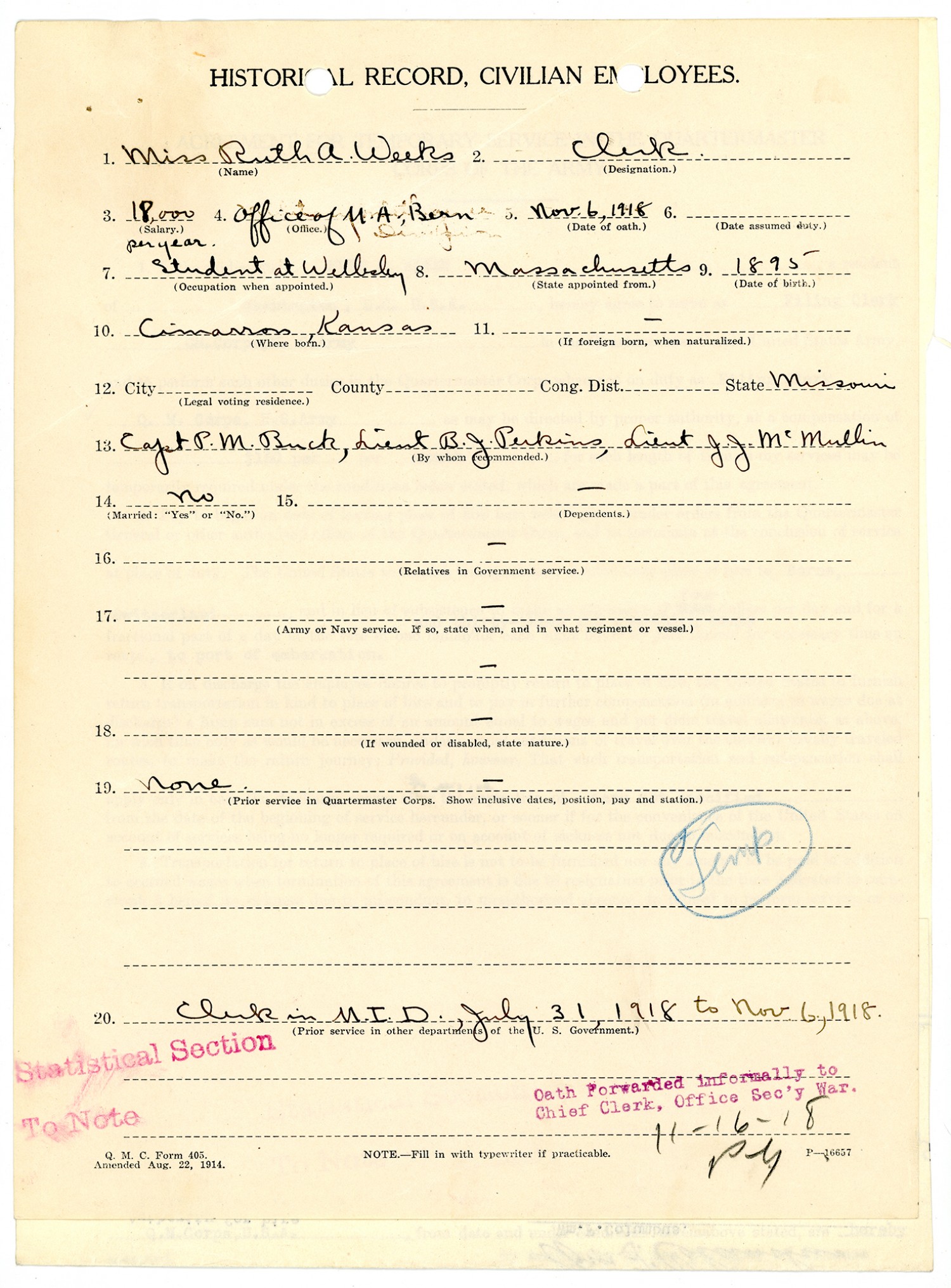 | Source | Weeks, Ruth A.; War Department; Records of the U.S. Civil Service Commission, 1871-1981, Record Group 146; National Archives and Records Administration-National Personnel Records Center (St. Louis). |