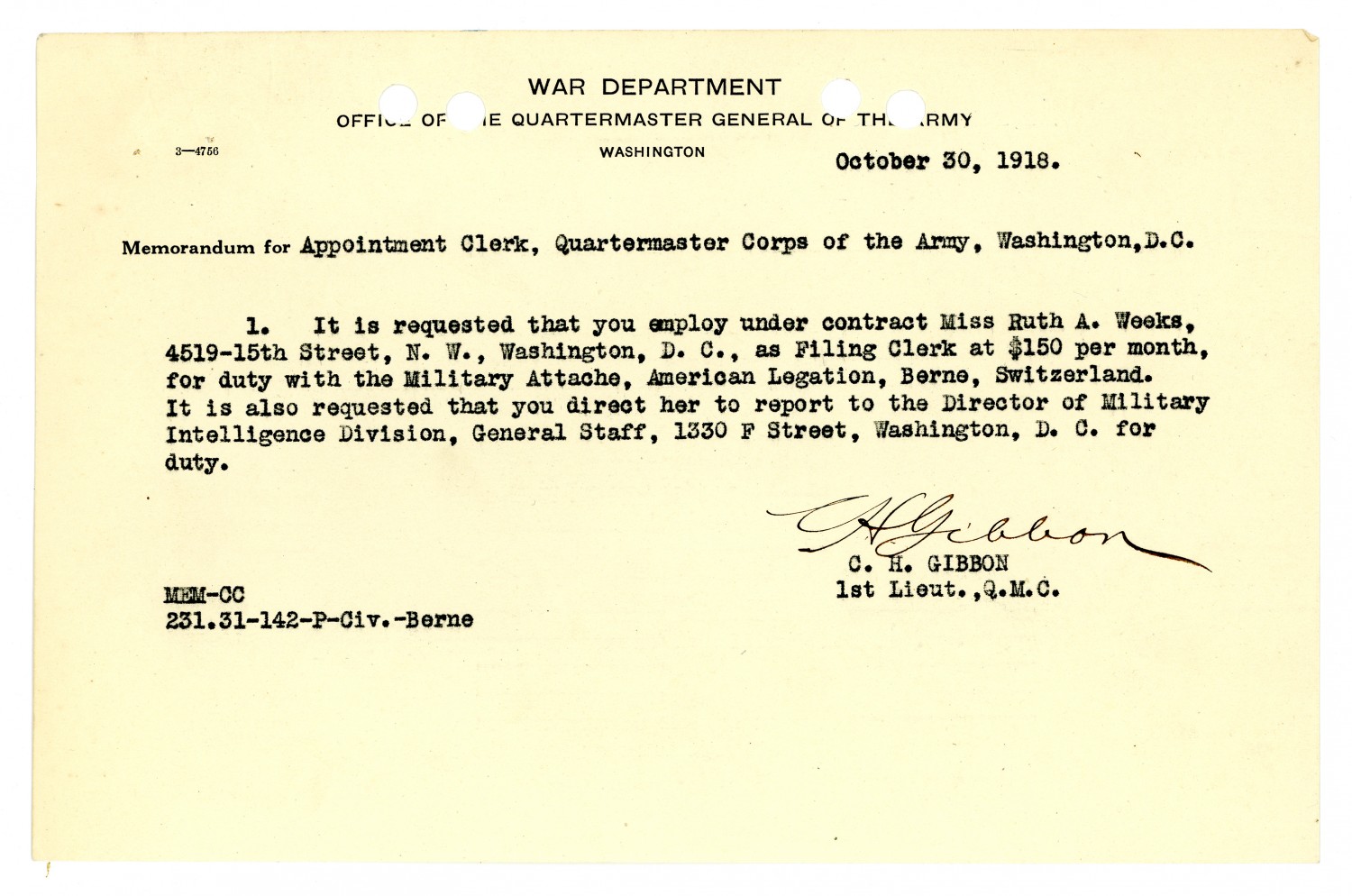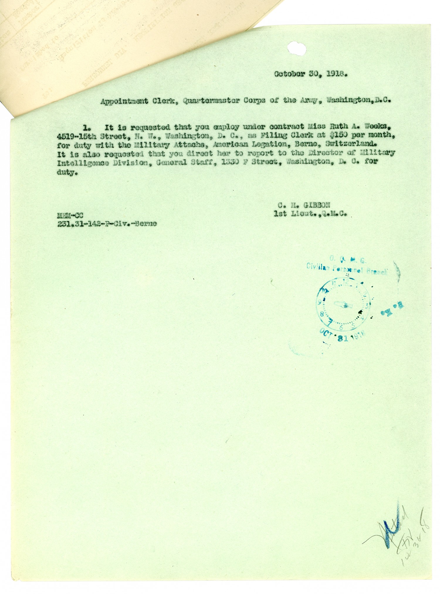 C.H. Gibbon letter to Appointment Clerk, Quartermaster Corps - October 30, 1918