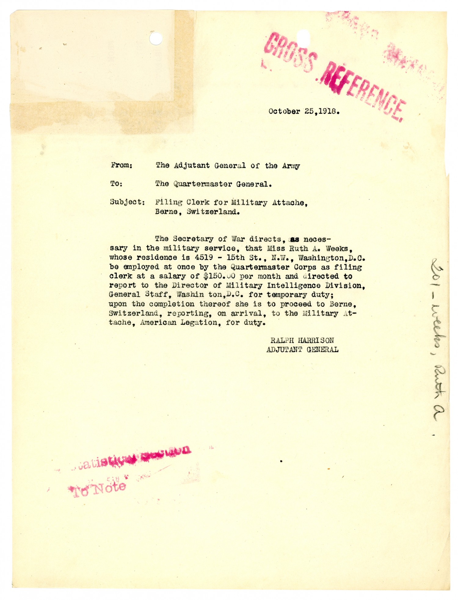 Ralph Harrison letter to the Quartermaster General - October 25, 1918
