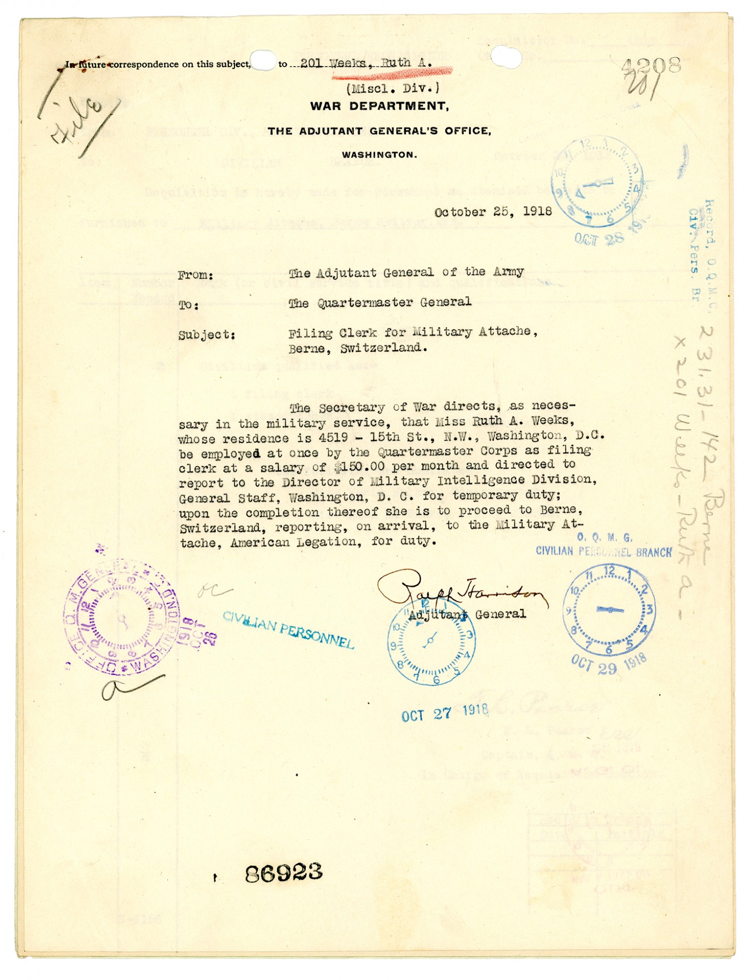 F.L. Pearce letter to Civilian Branch - October 29, 1918