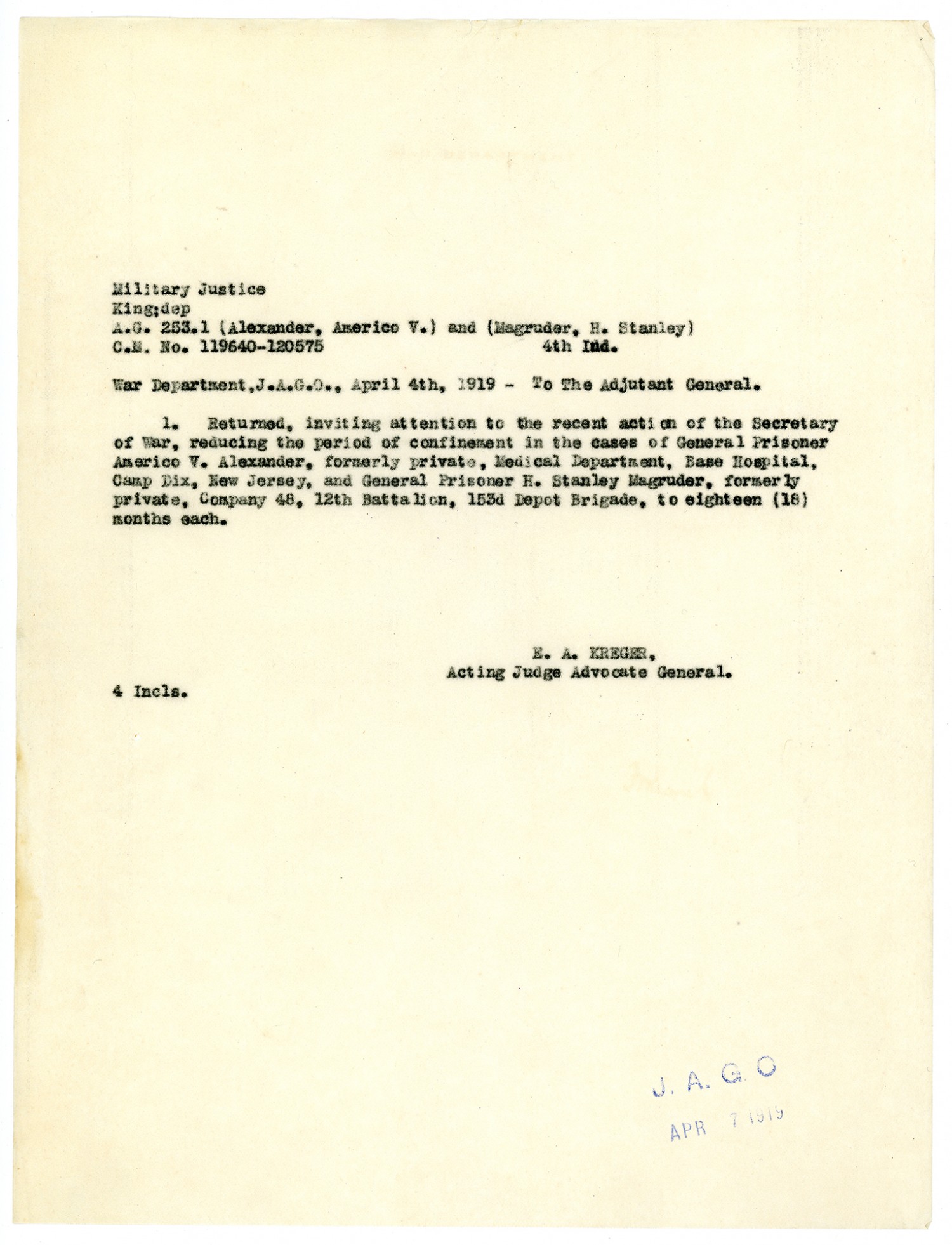 E.A. Kreger letter to the War Department - April 4, 1919
