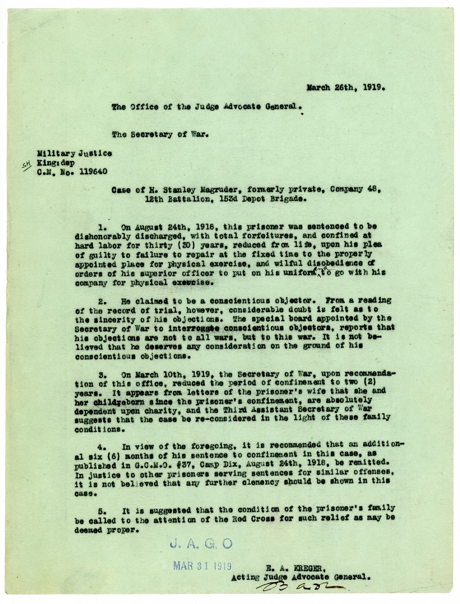 E.A. Kreger letter to the Secretary of War - March 26, 1919