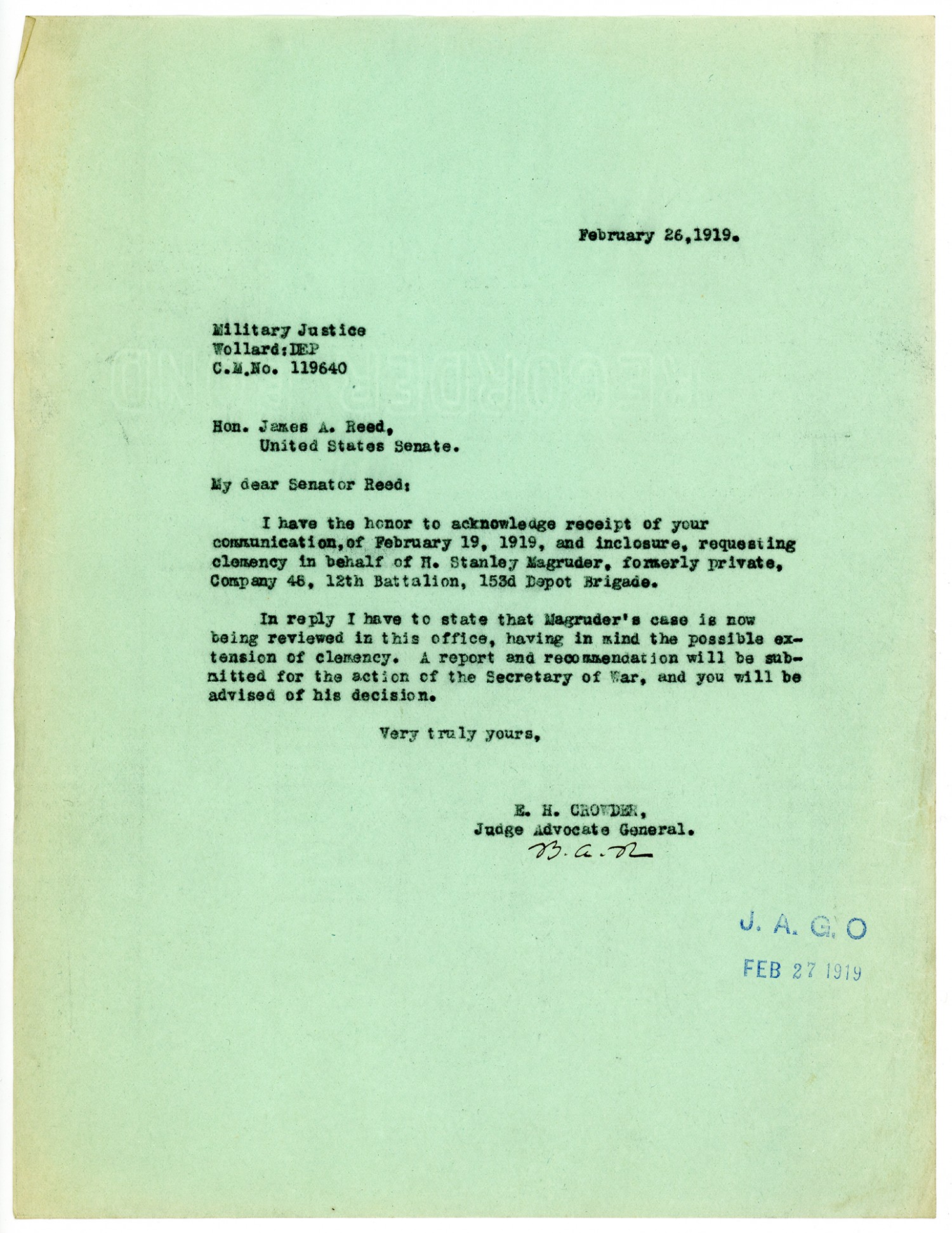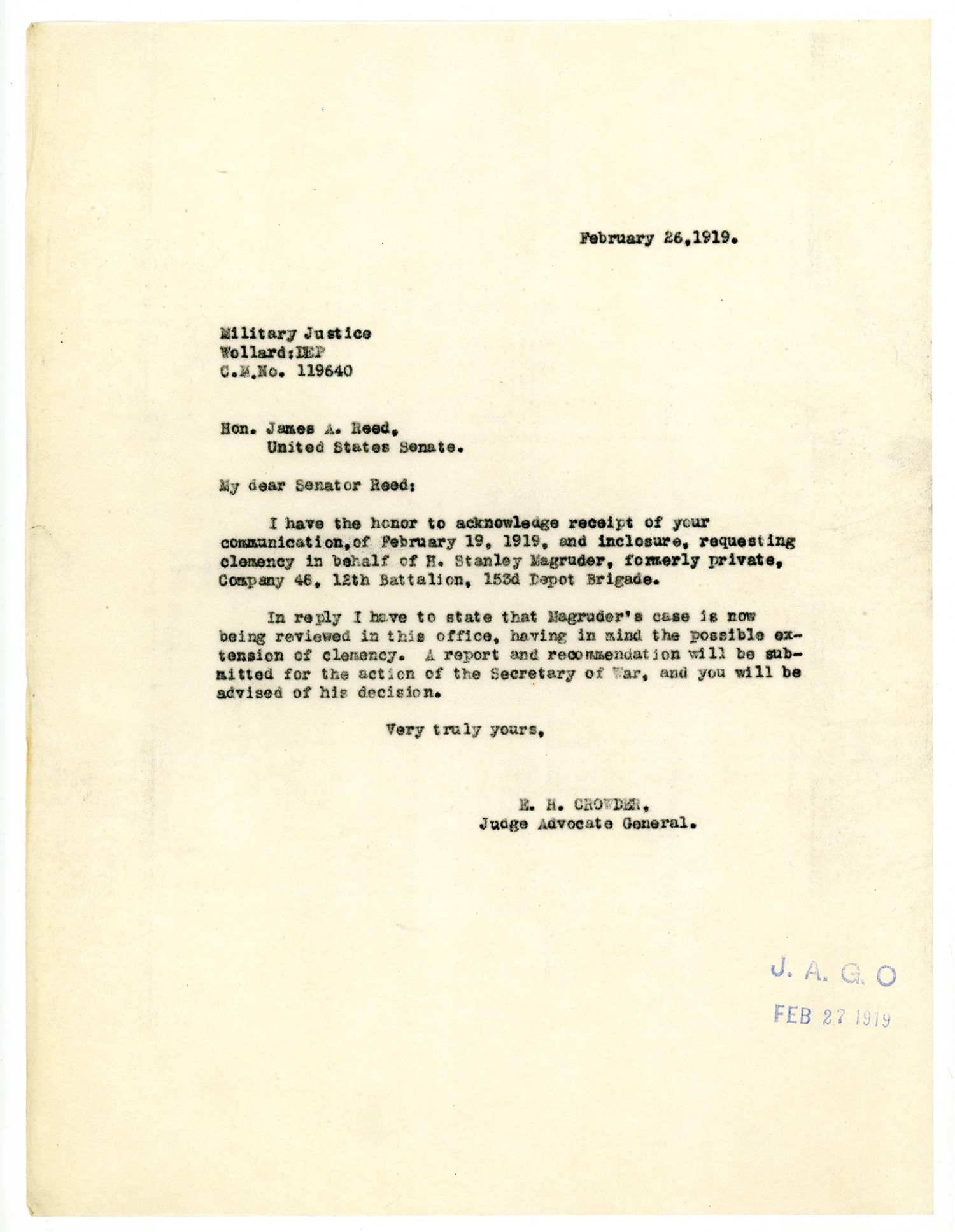 Enoch H. Crowder letter to Senator Reed - February 26, 1919