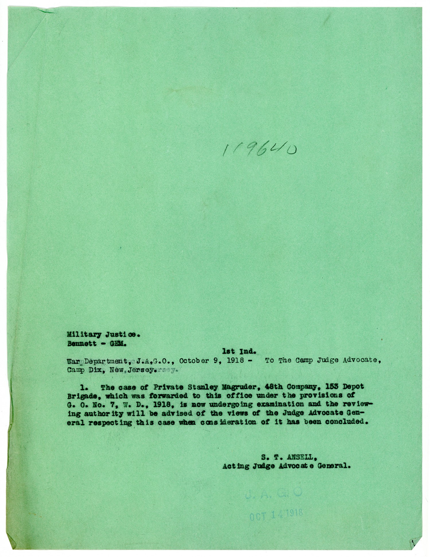 S.T. Ansell letter to the Camp Judge Advocate - October 9, 1918