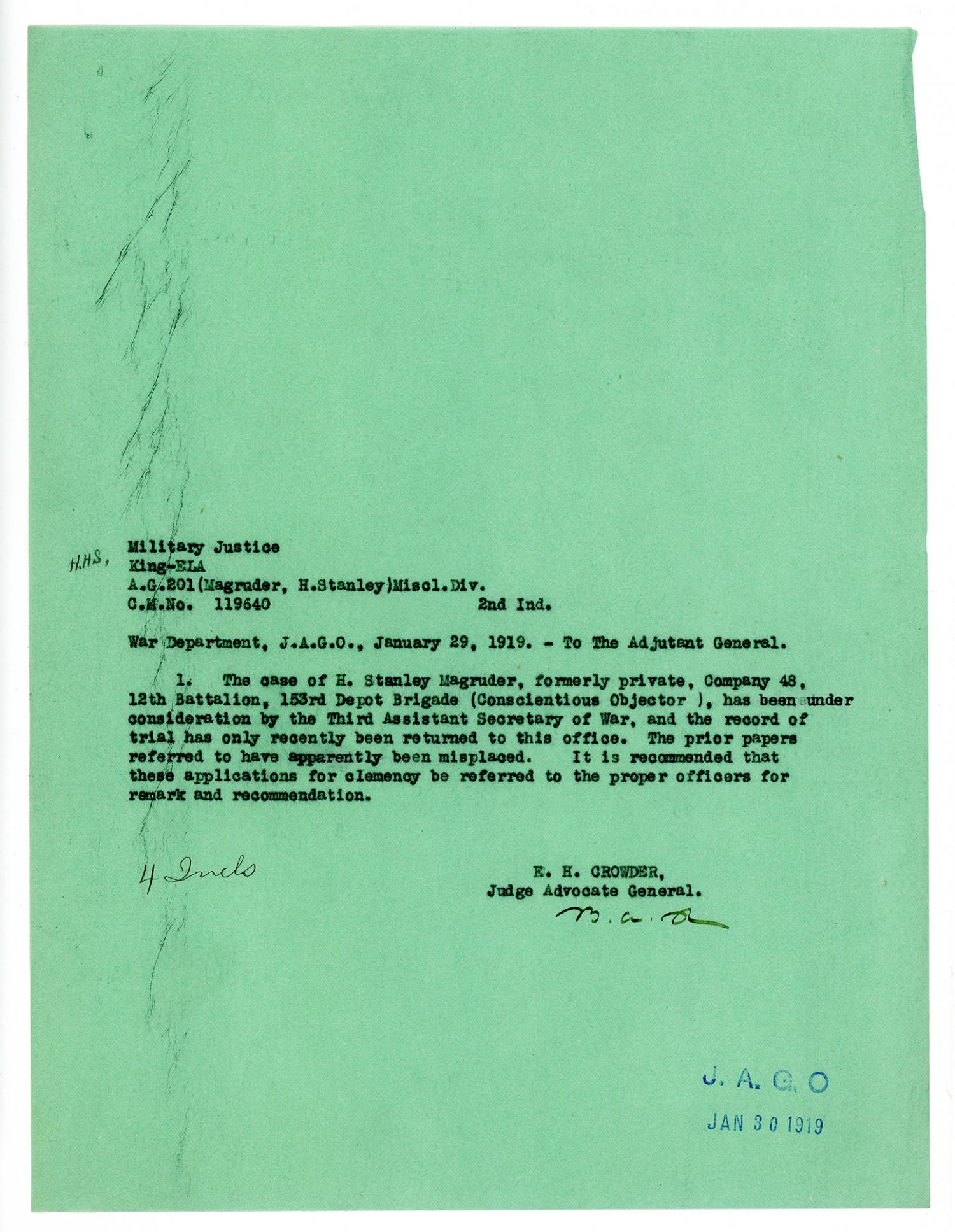Enoch H. Crowder letter to the Adjutant General - January 29, 1919
