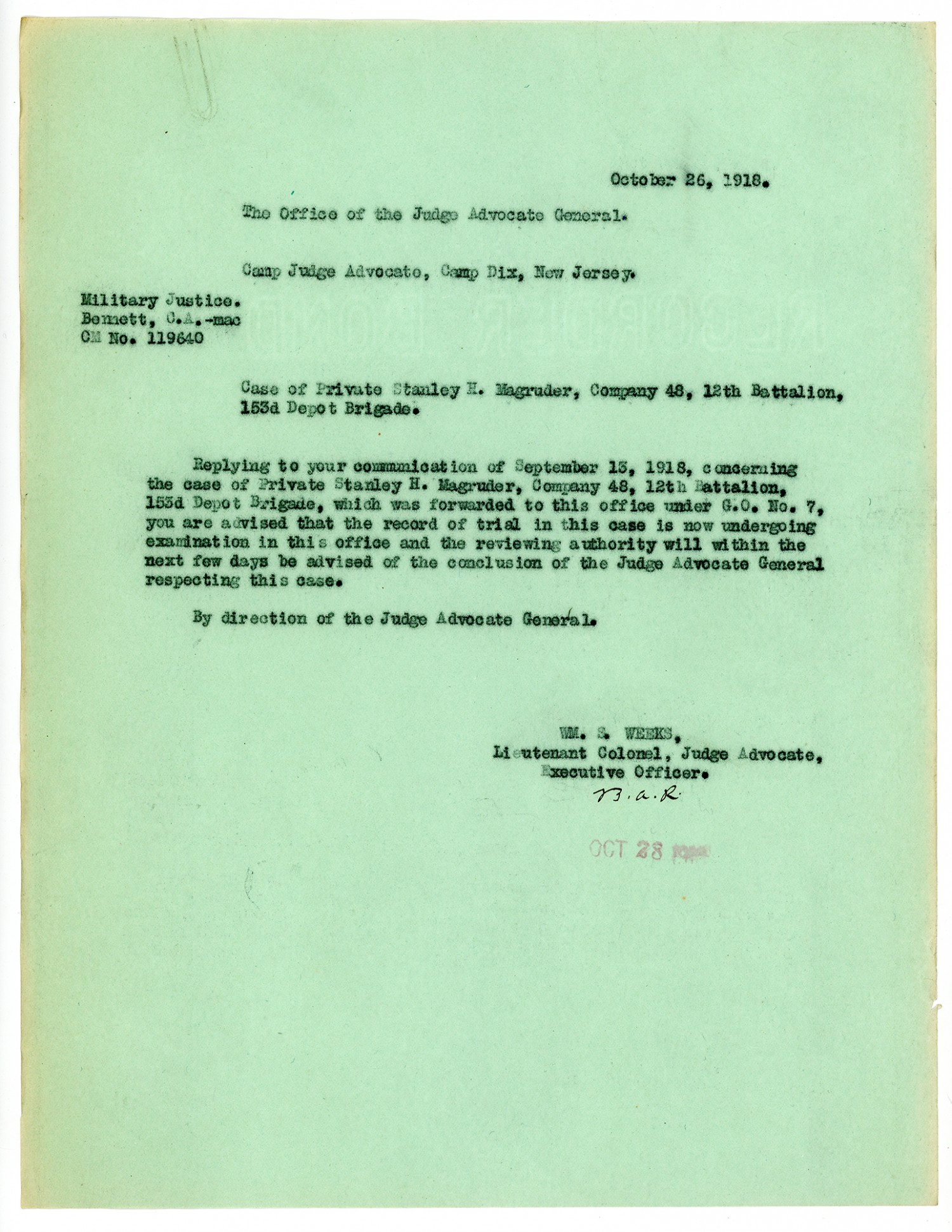 William S. Weeks letter to the Camp Judge Advocate - October 26, 1918