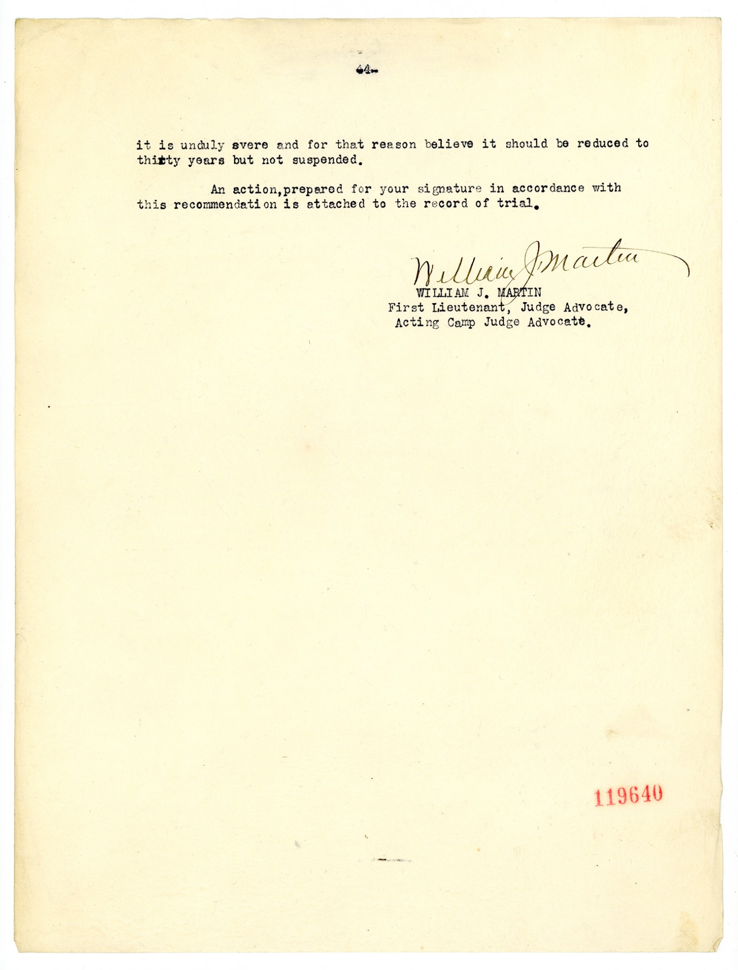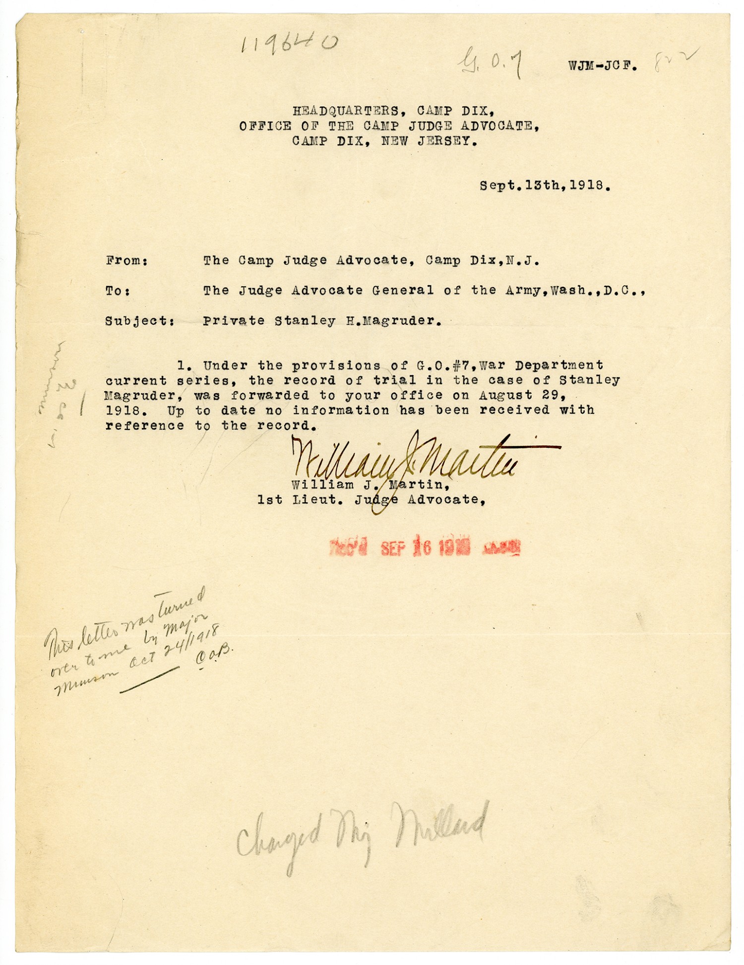 William J. Martin letter to the Judge Advocate General of the Army - September 13, 1918