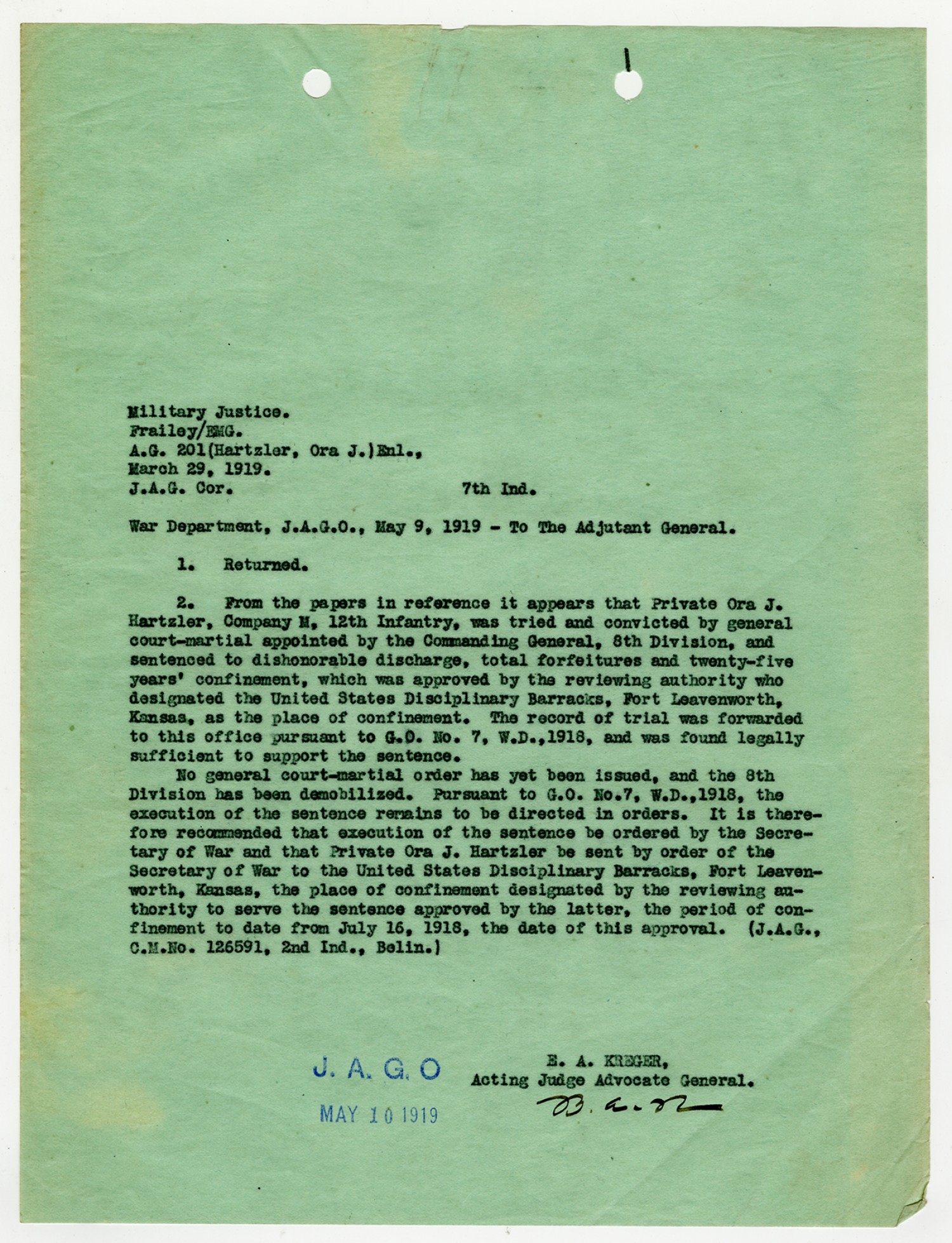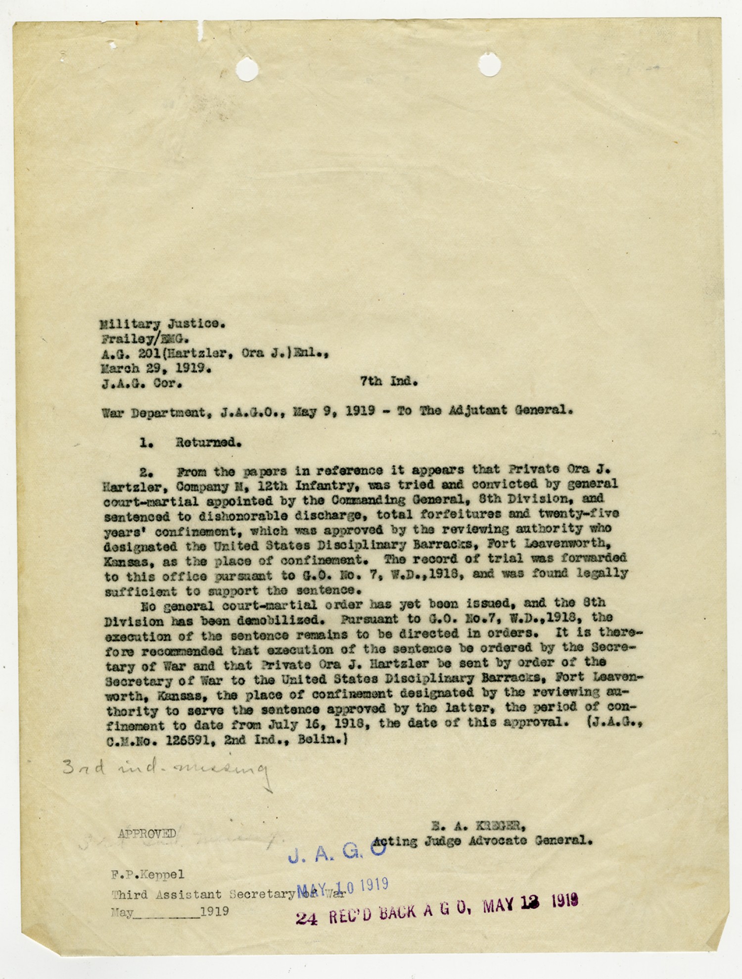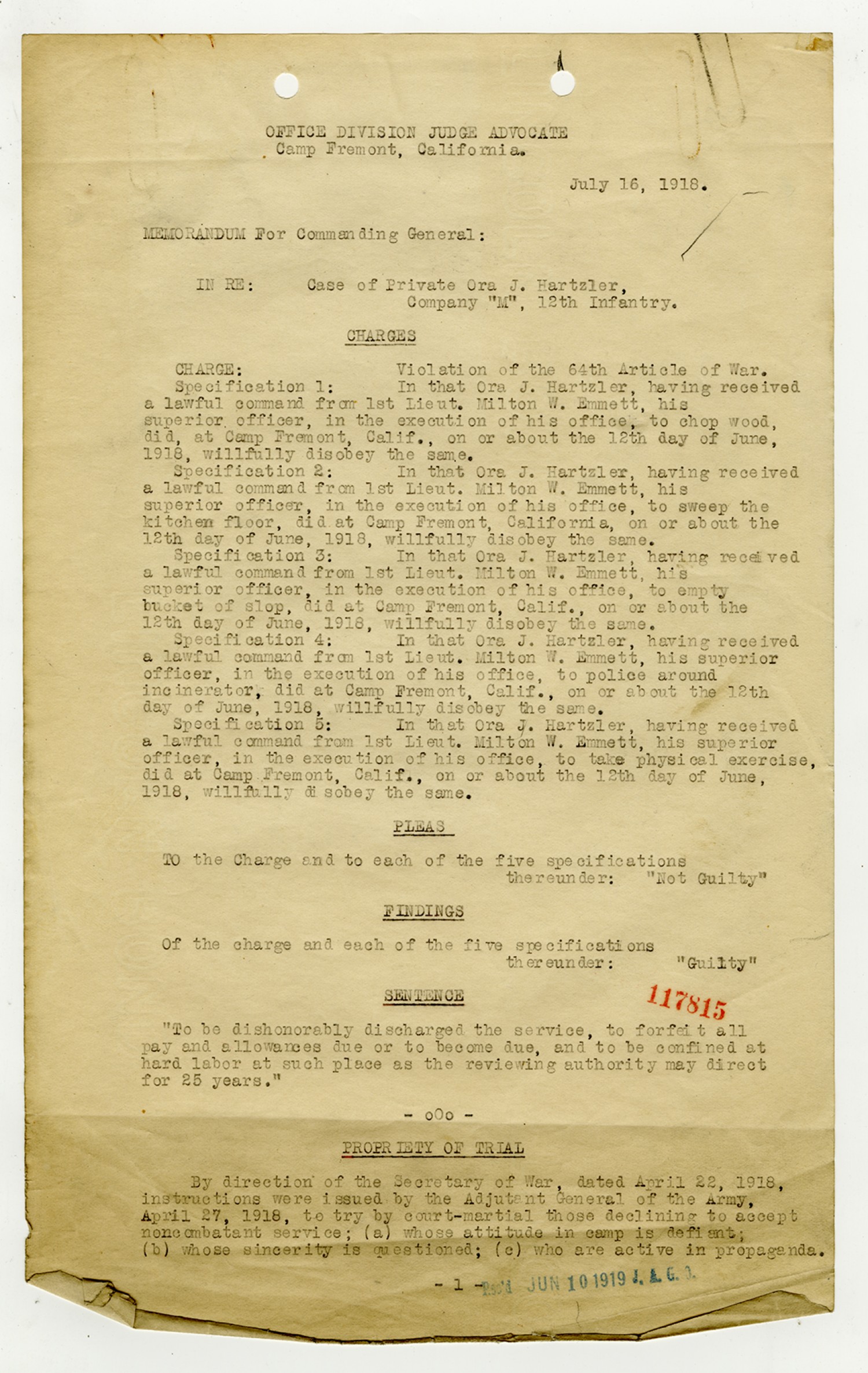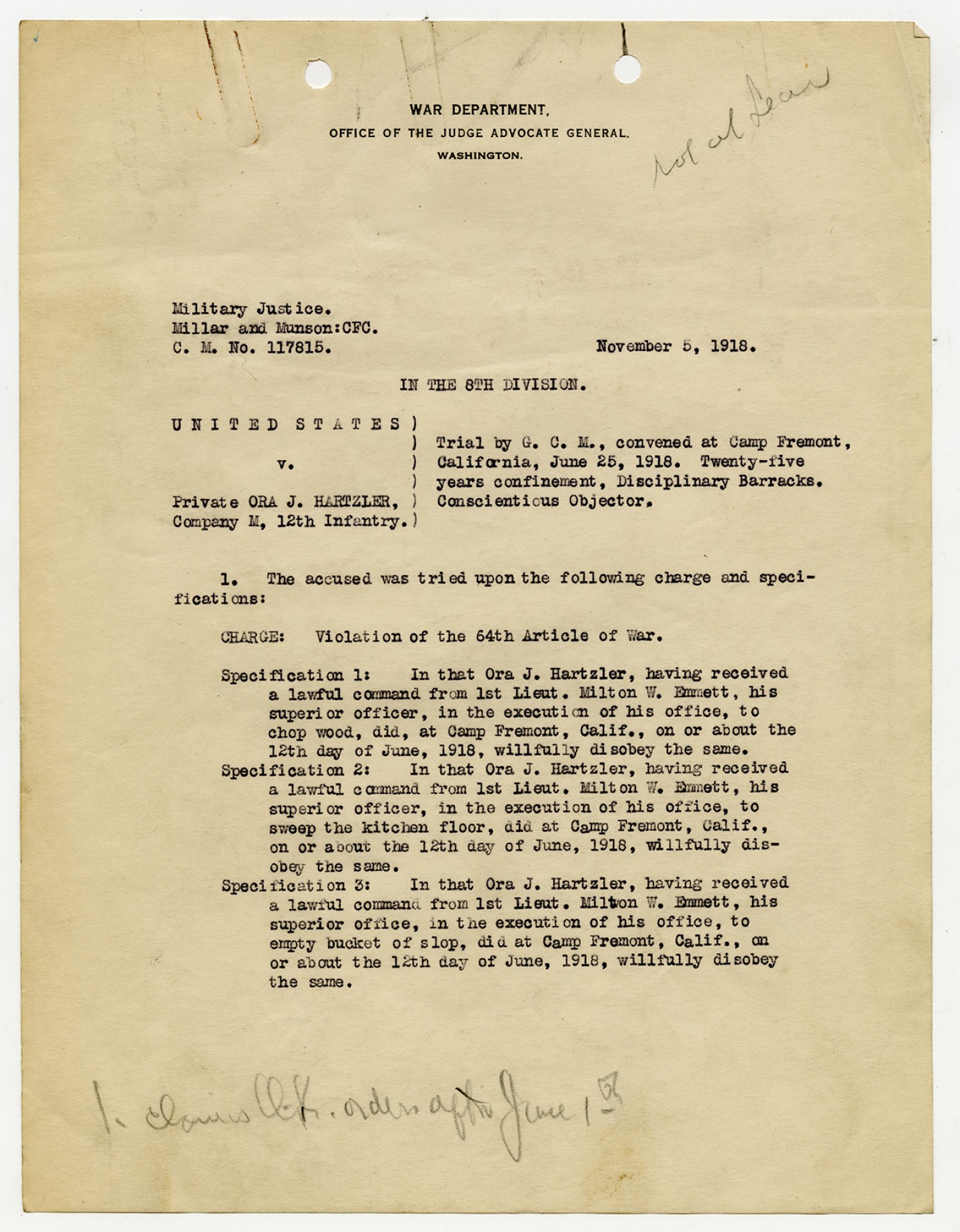 | Source | Hartzler, Ora; Court-Martial Case Files, 1917-1938; Records of the Office of the Judge Advocate General (Army), 1792-2010, Record Group 153; National Archives and Records Administration-National Personnel Records Center (St. Louis). |